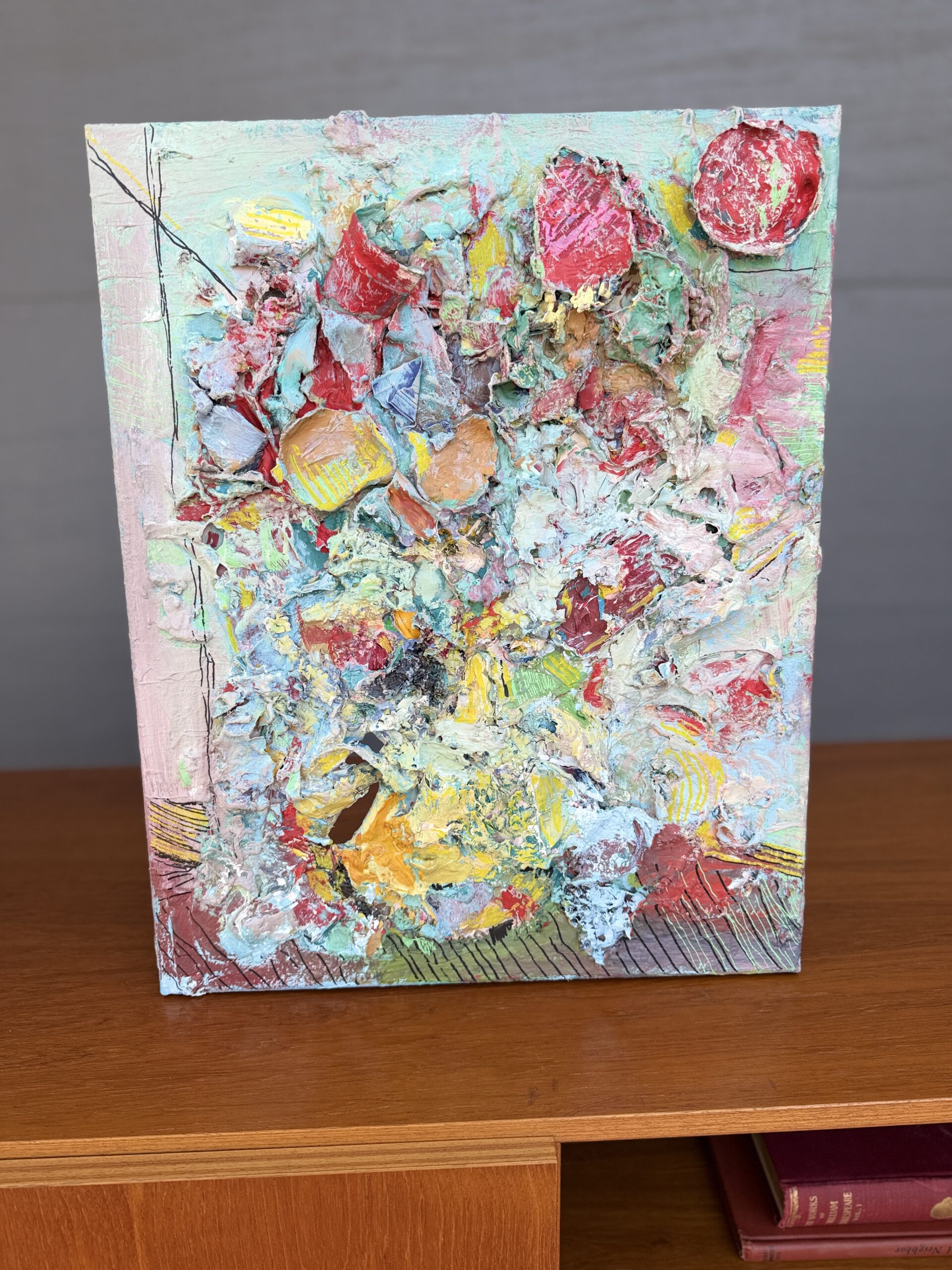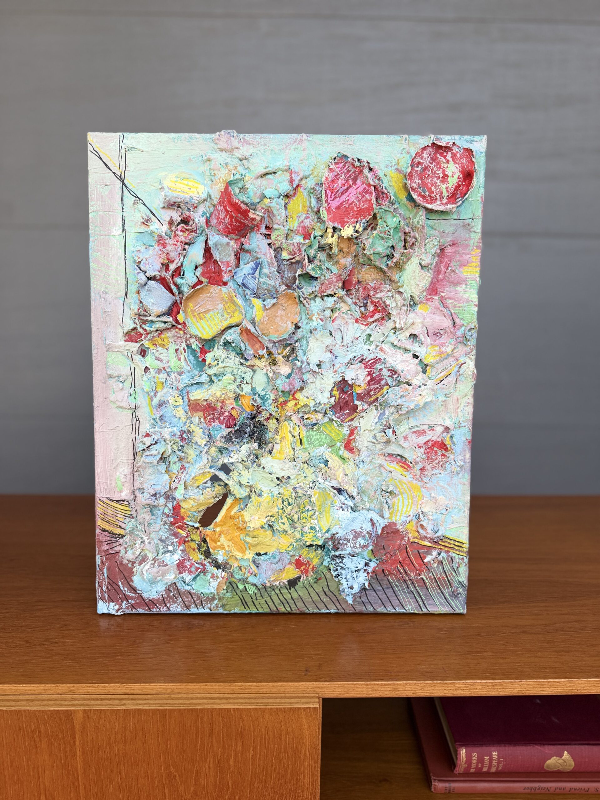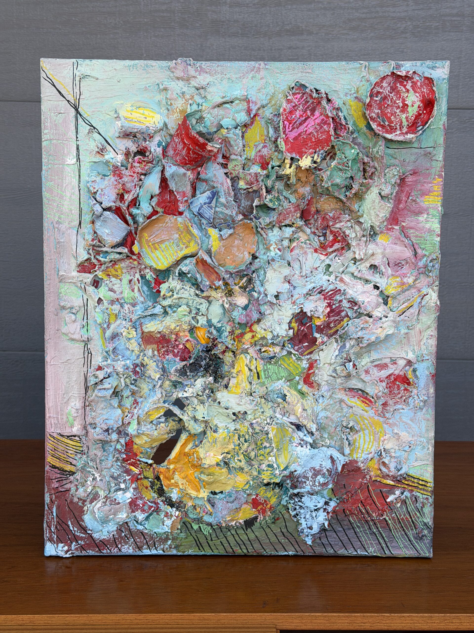 An original abstract mixed media artwork titled “Rest in Peace” by local Austin artist. This expressive piece features layered texture, sculptural paint application, and a dynamic palette of soft pastels, bold reds, and earthy tones, creating depth and movement across the canvas.