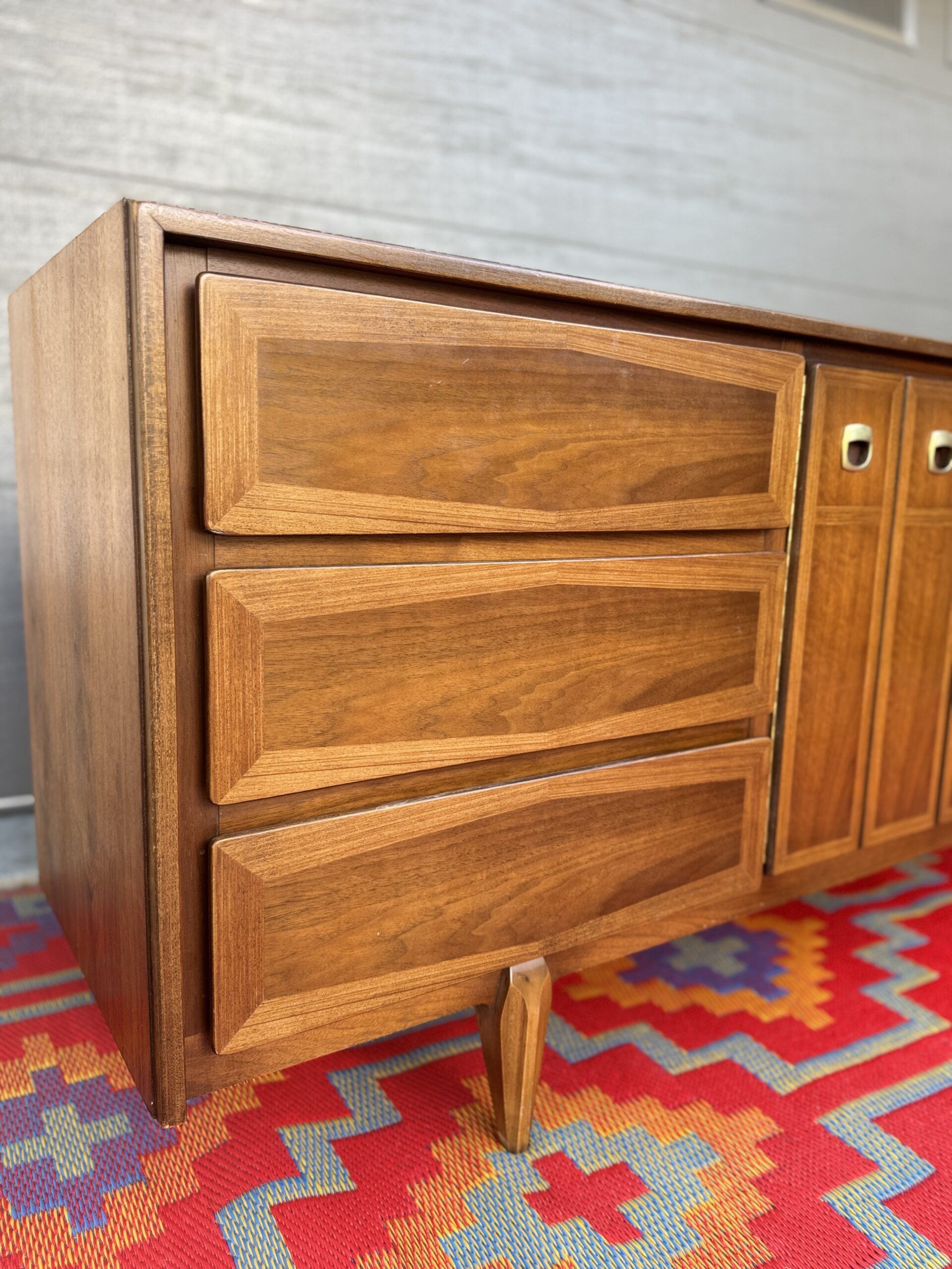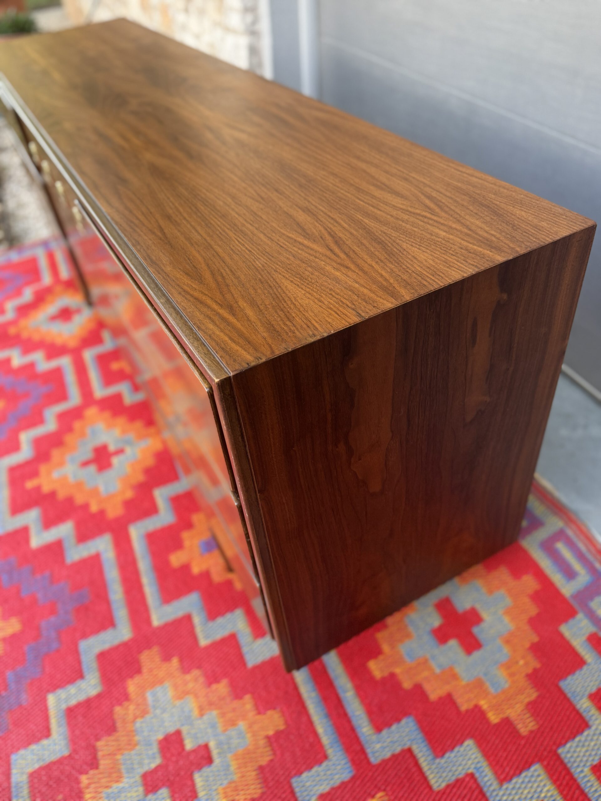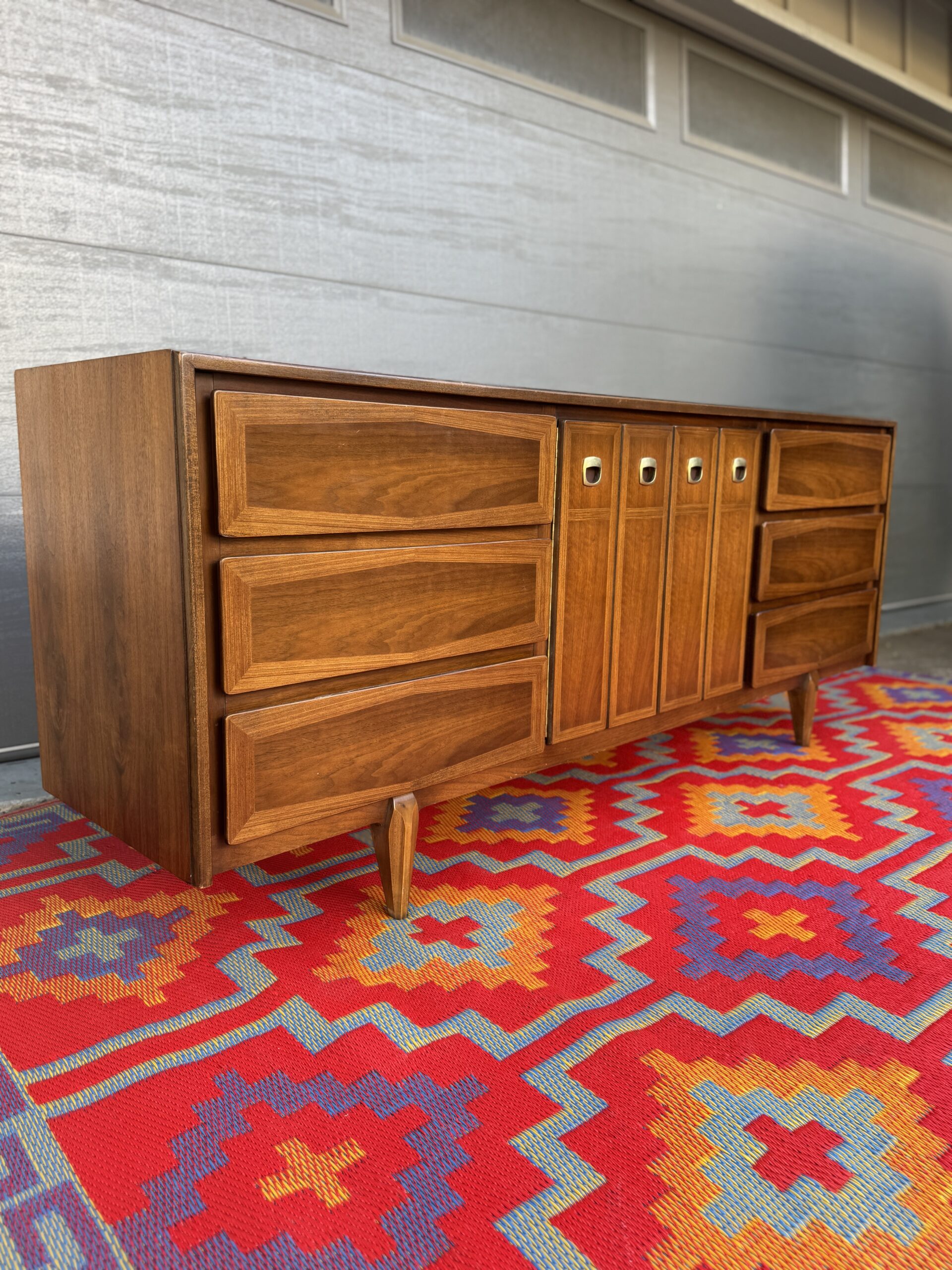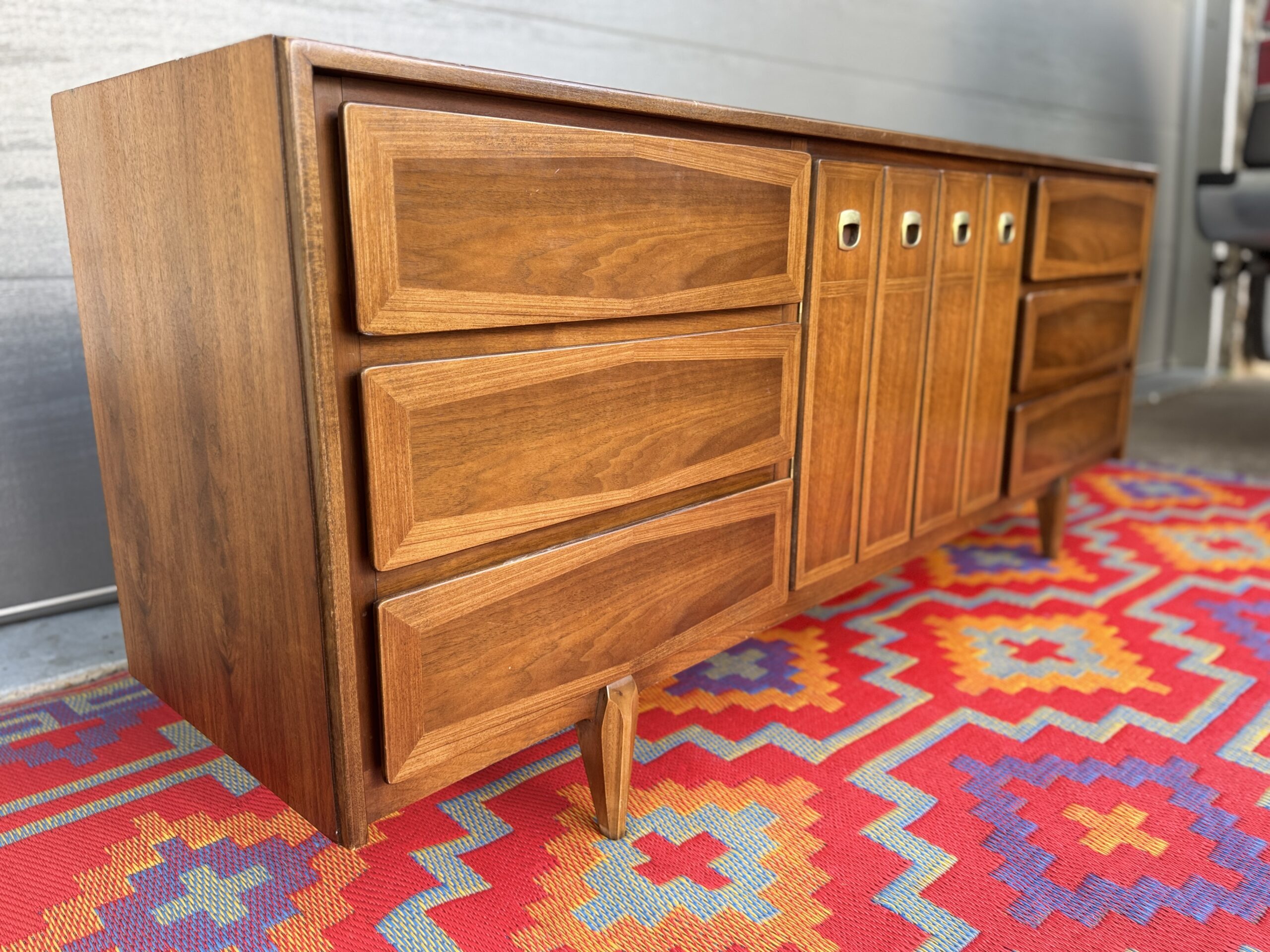 Crafted in rich walnut, the piece features a sophisticated mix of beveled drawer fronts and sleek vertical center doors with distinctive inset brass pulls. The original finish has been beautifully preserved and lightly restored to showcase the warm wood grain and timeless silhouette.