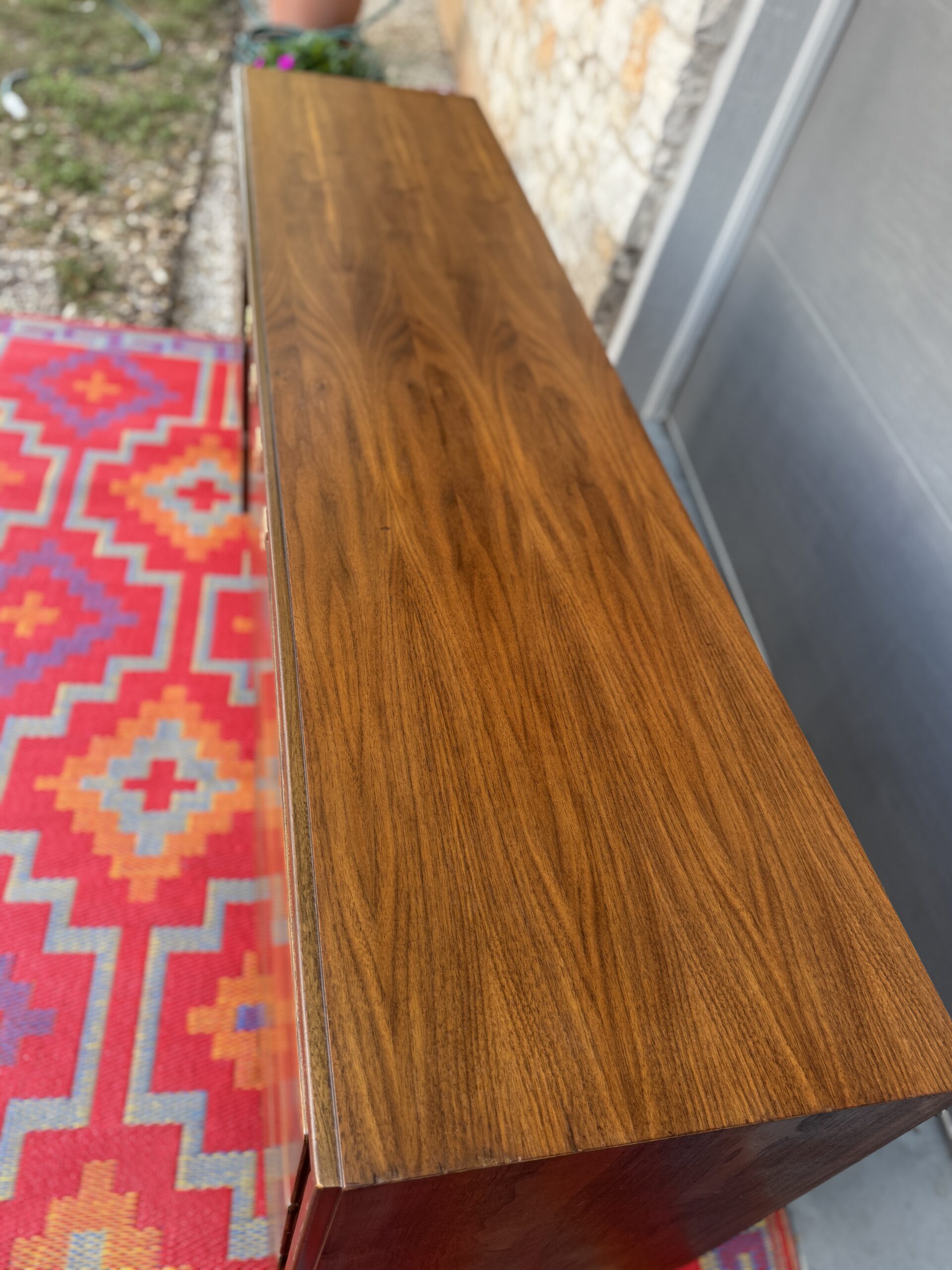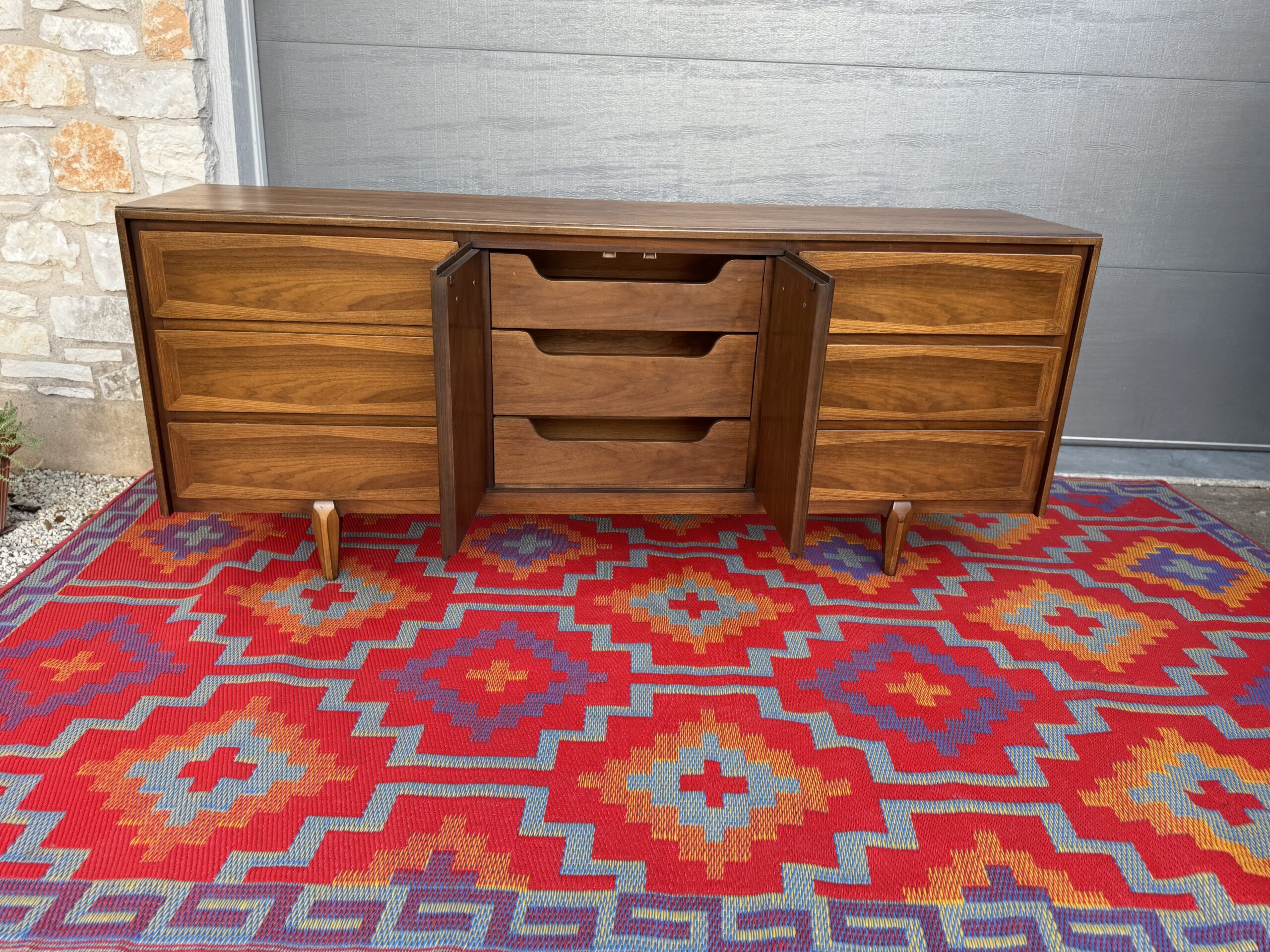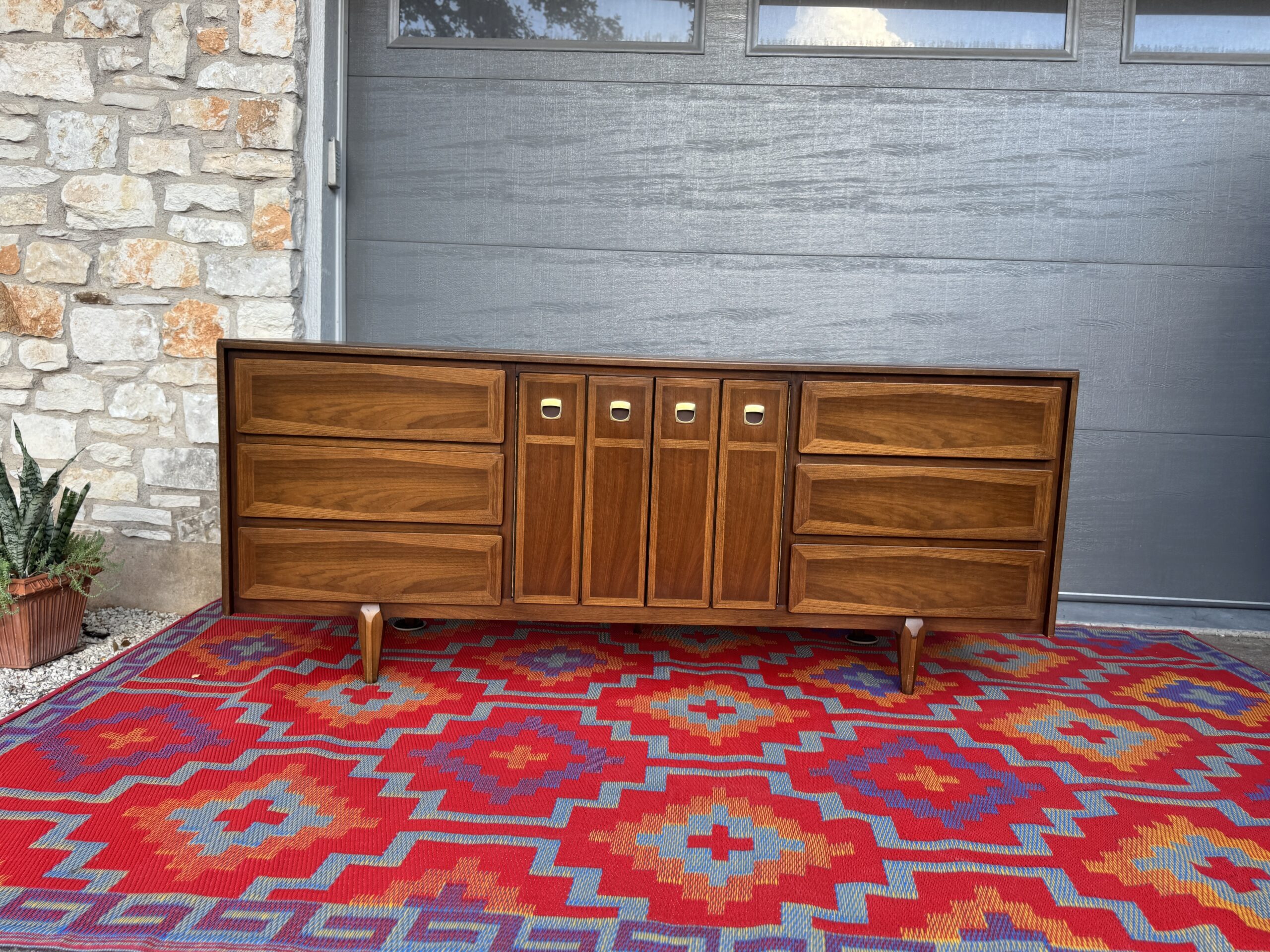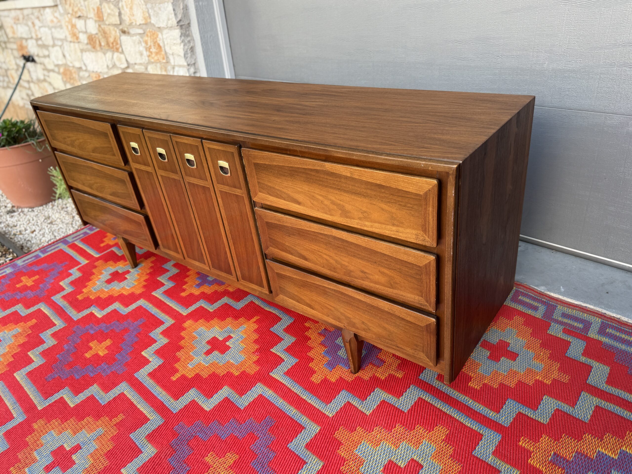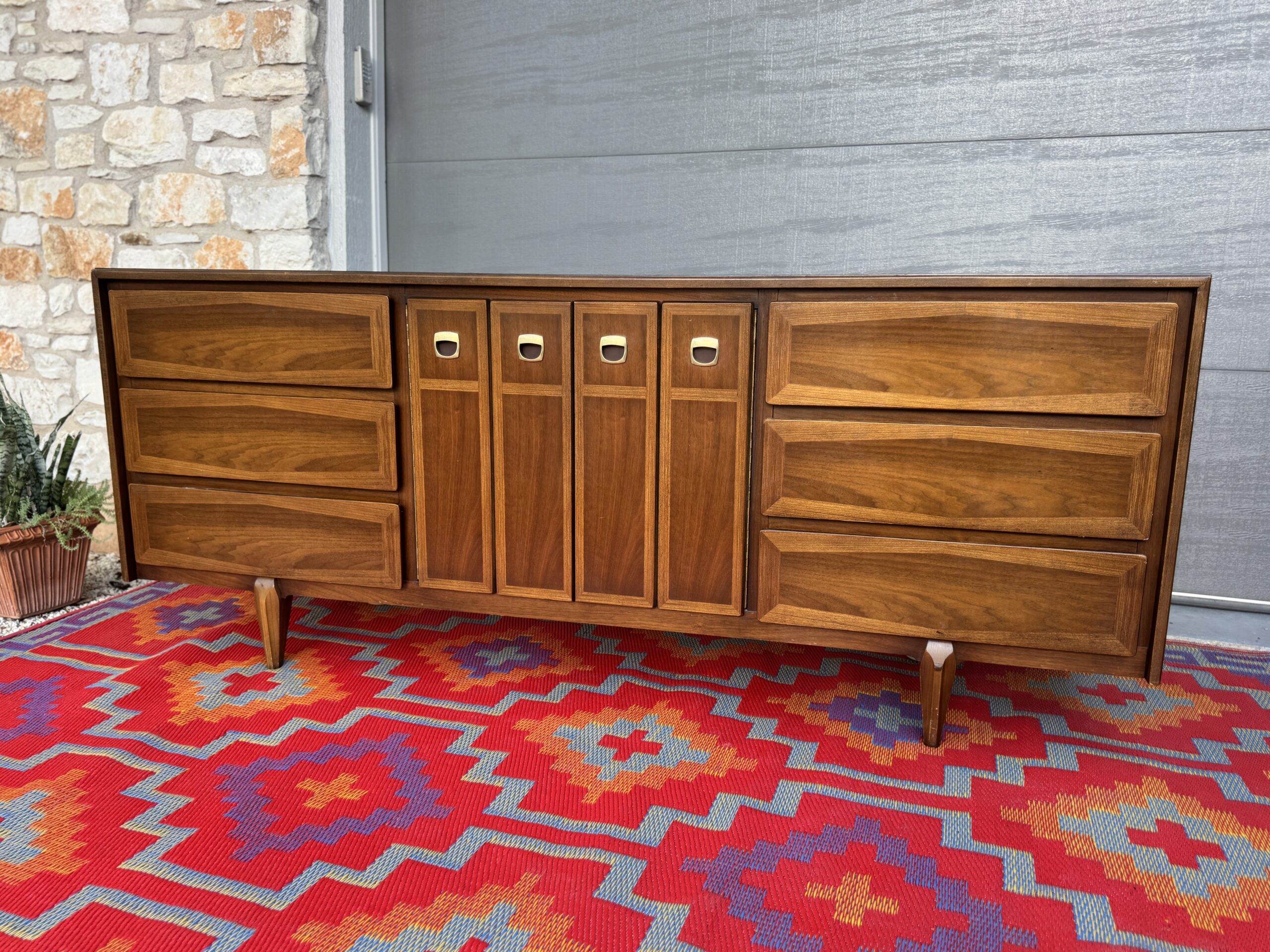 Crafted in rich walnut, the piece features a sophisticated mix of beveled drawer fronts and sleek vertical center doors with distinctive inset brass pulls. The original finish has been beautifully preserved and lightly restored to showcase the warm wood grain and timeless silhouette.