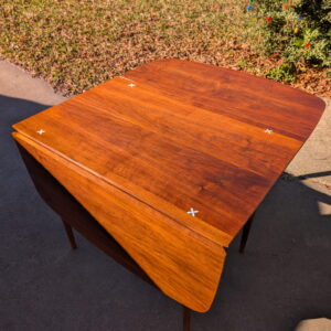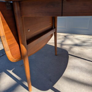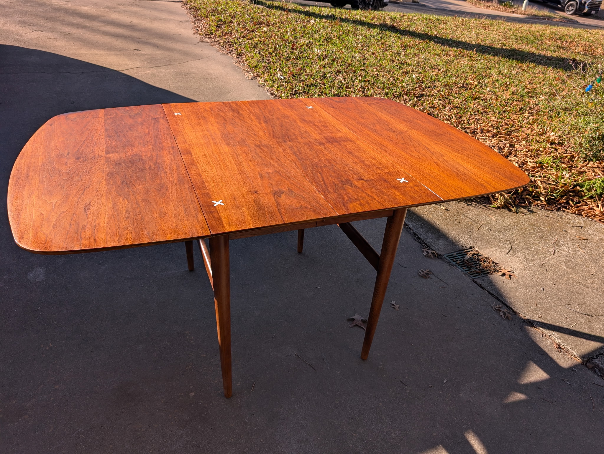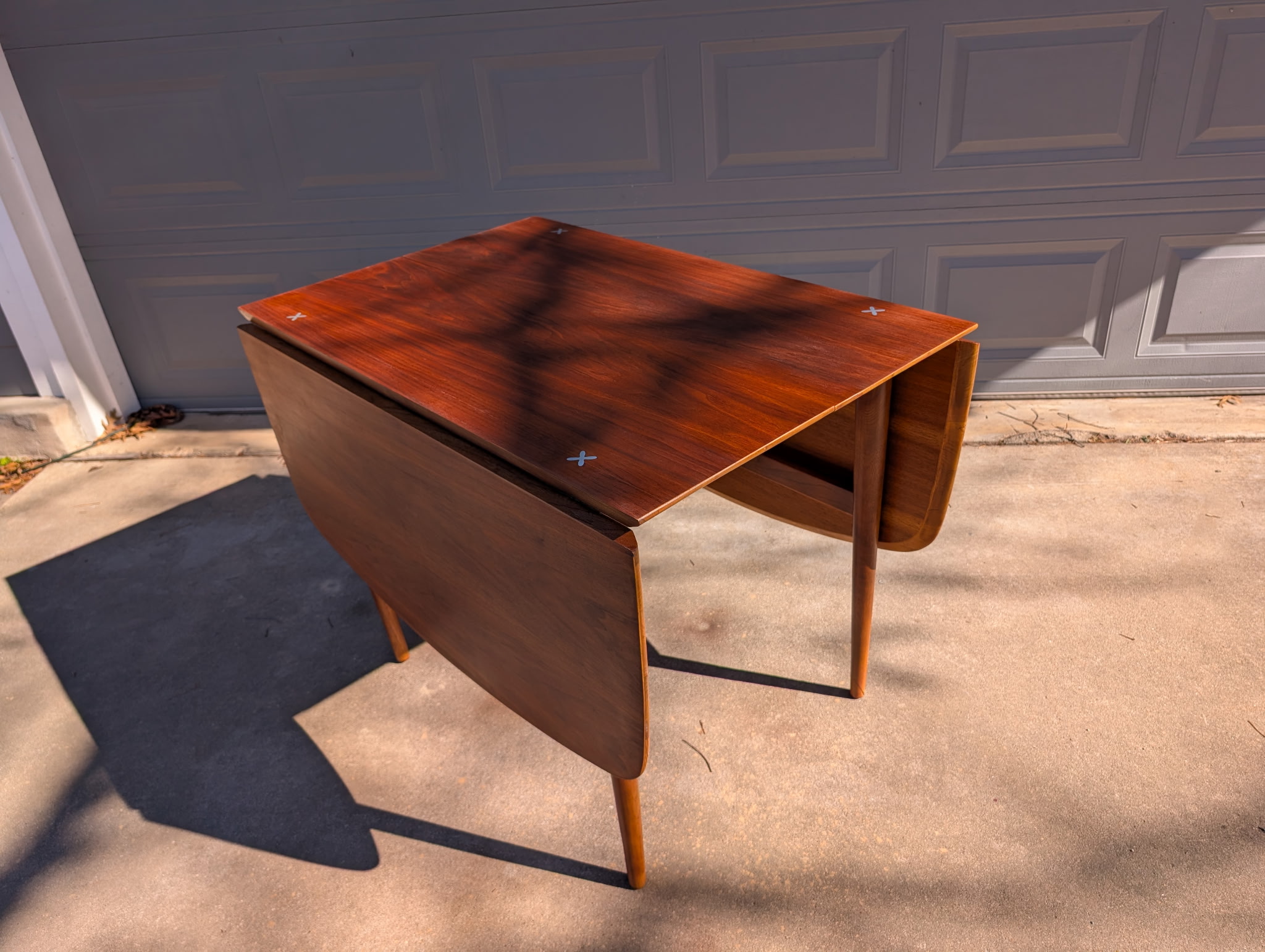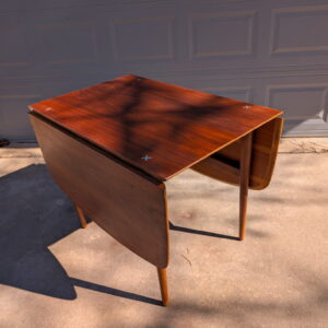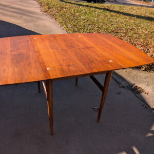 This versatile table features two drop leaves, making it perfect for smaller spaces while still offering generous surface area when fully extended. The warm wood tone and clean, timeless lines make this an easy fit for both mid-century and transitional interiors. Ideal as a dining table, breakfast table, or multi-purpose work / gathering table.