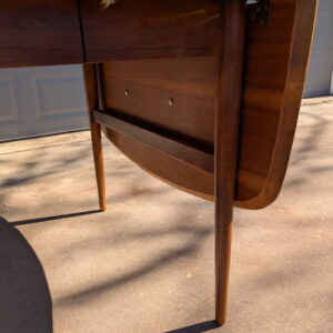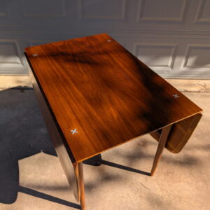 Classic mid-century modern drop leaf dining table by American of Martinsville, crafted in beautifully grained walnut wood with softly rounded corners, tapered long legs, and four distinctive brass “X” inlays that elevate the design with subtle mid-century flair.