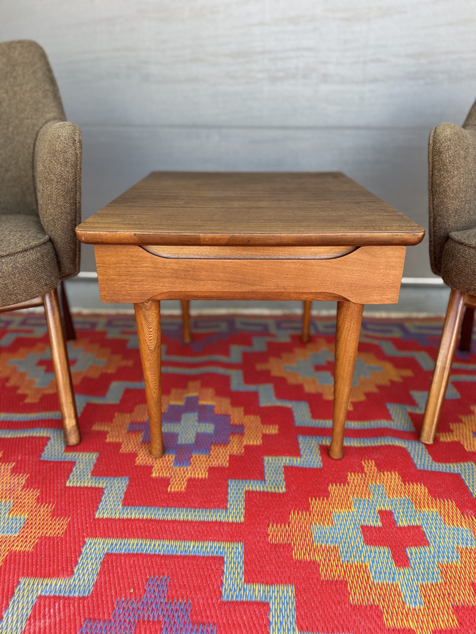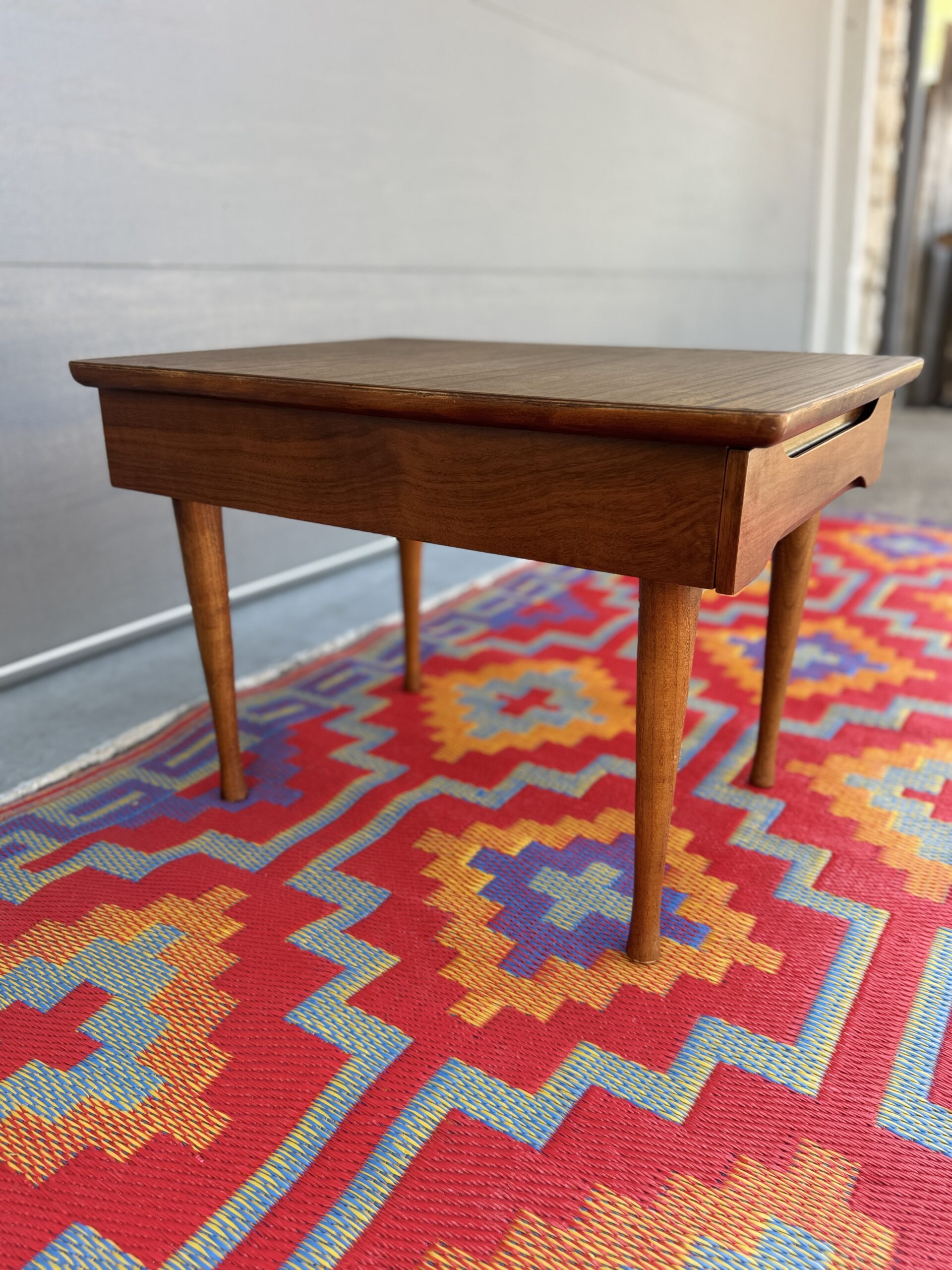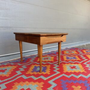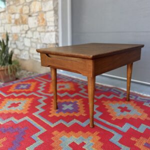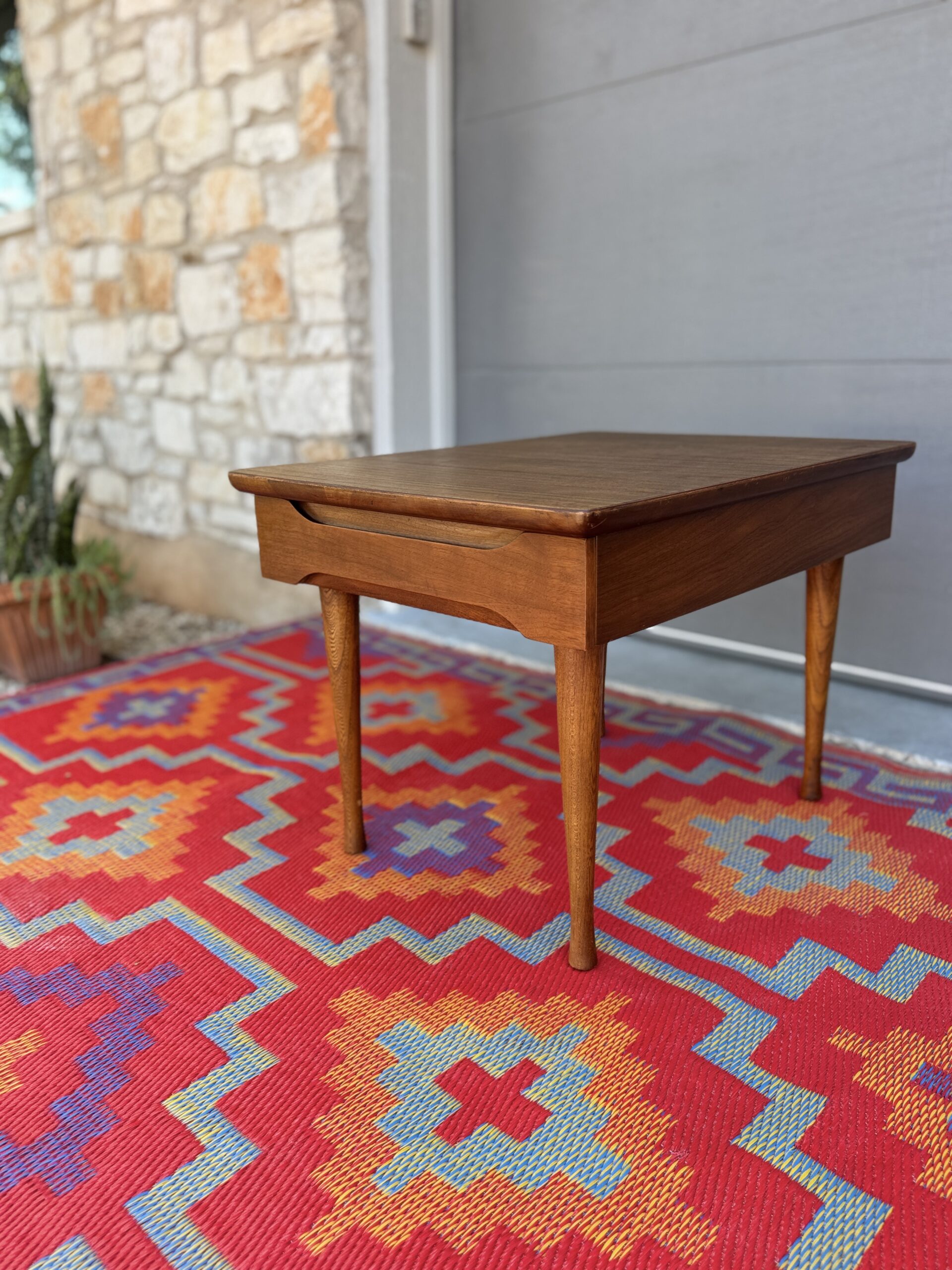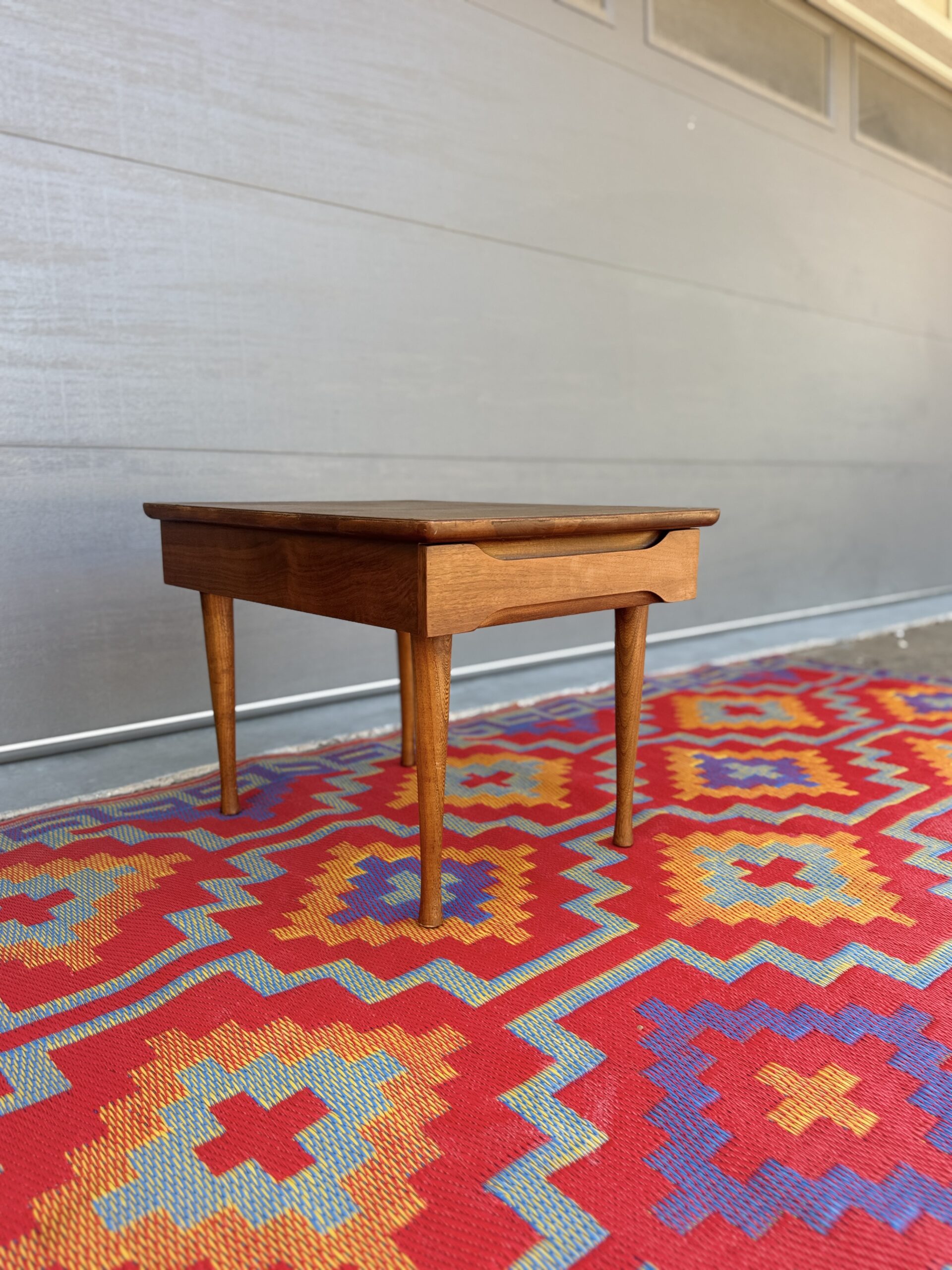This vintage American of Martinsville side table is a beautiful example of mid-century craftsmanship. Featuring a single sliding drawer with sculpted recessed pull and tapered legs, it blends sleek form with everyday function. Its compact scale makes it a versatile piece, whether used as a side table, nightstand, or end table.