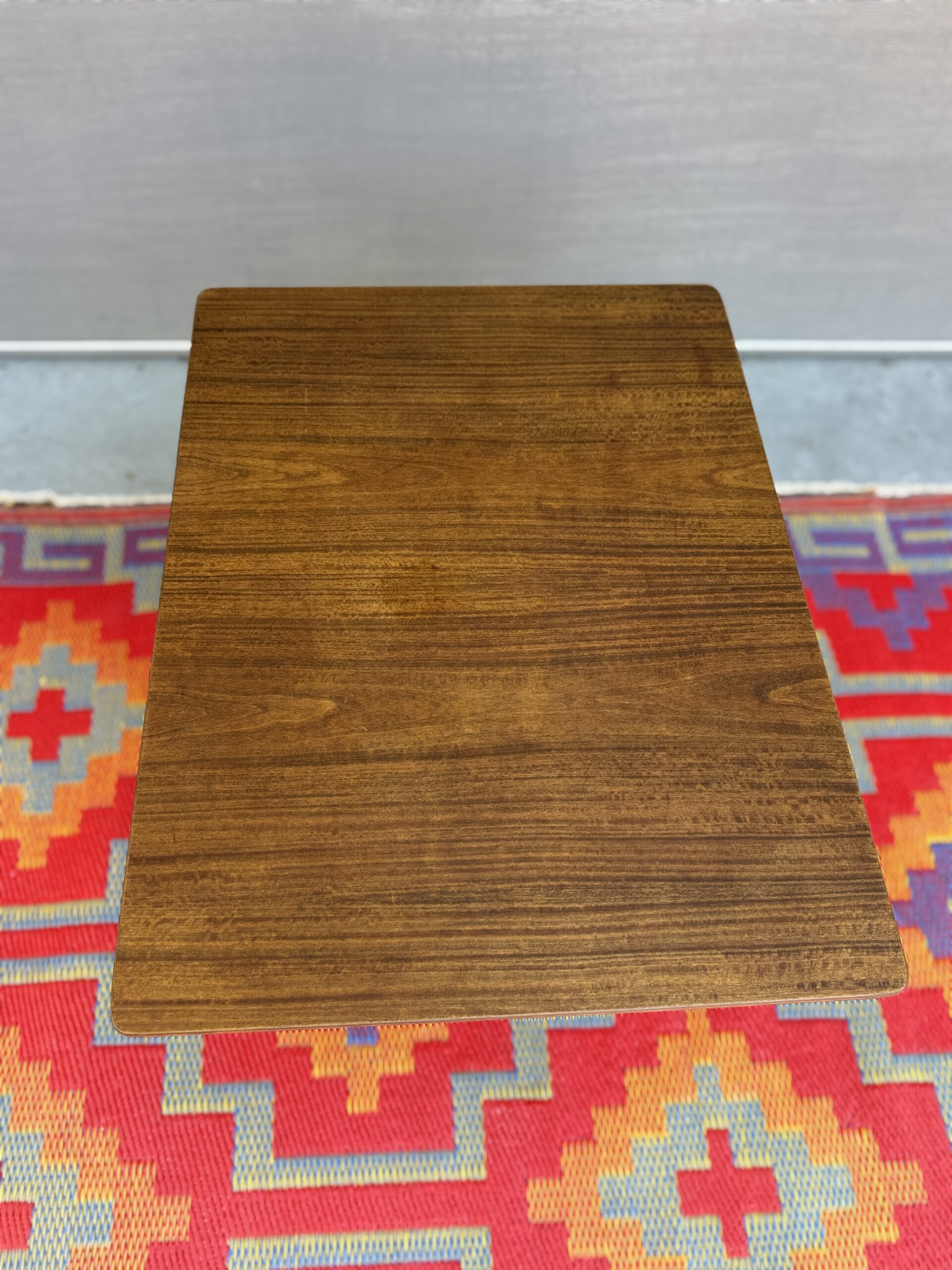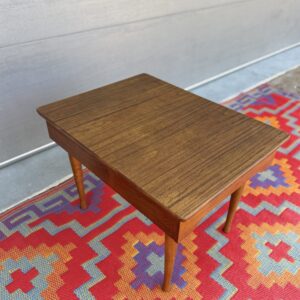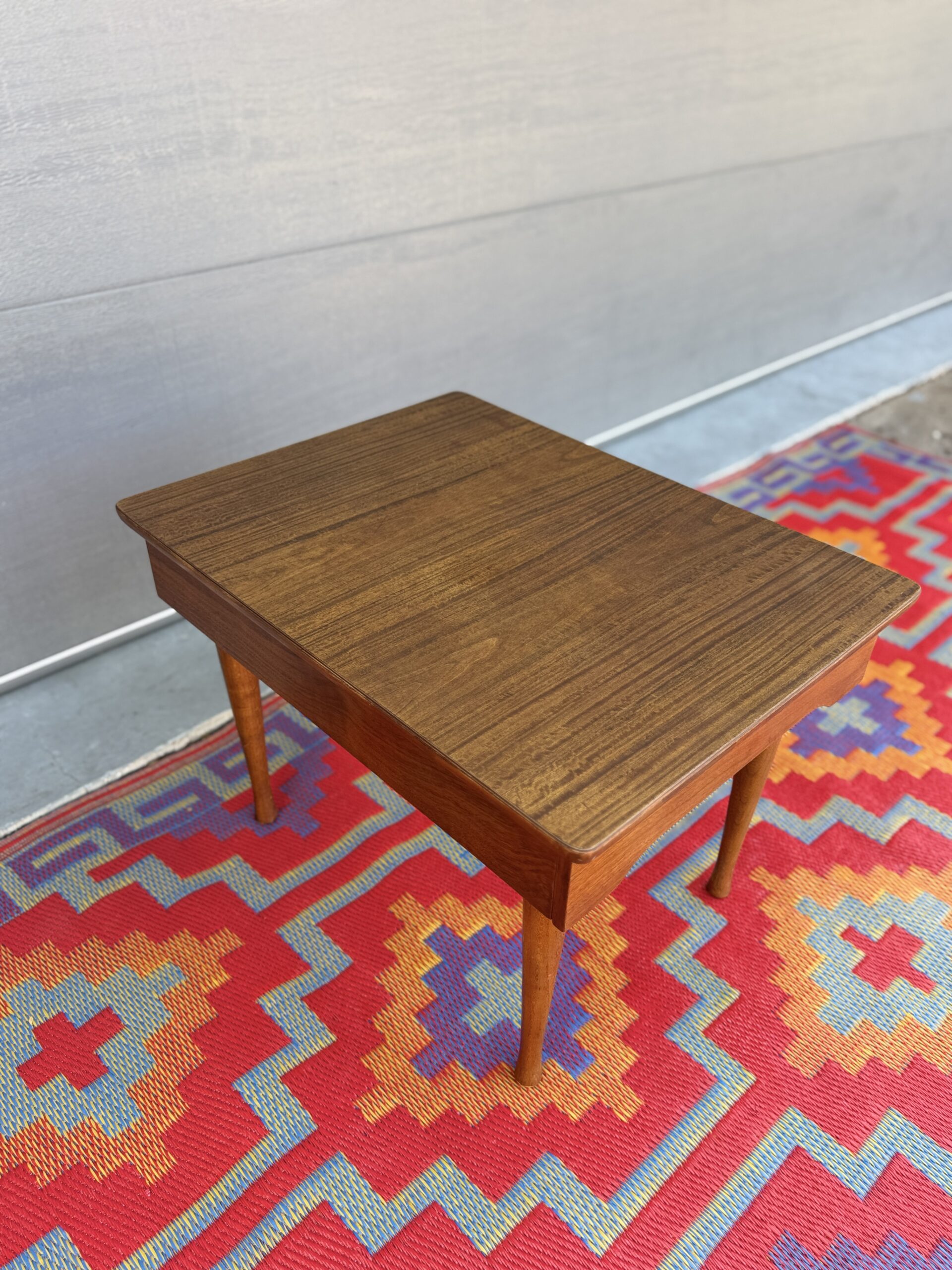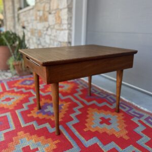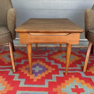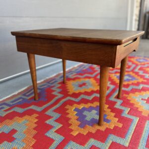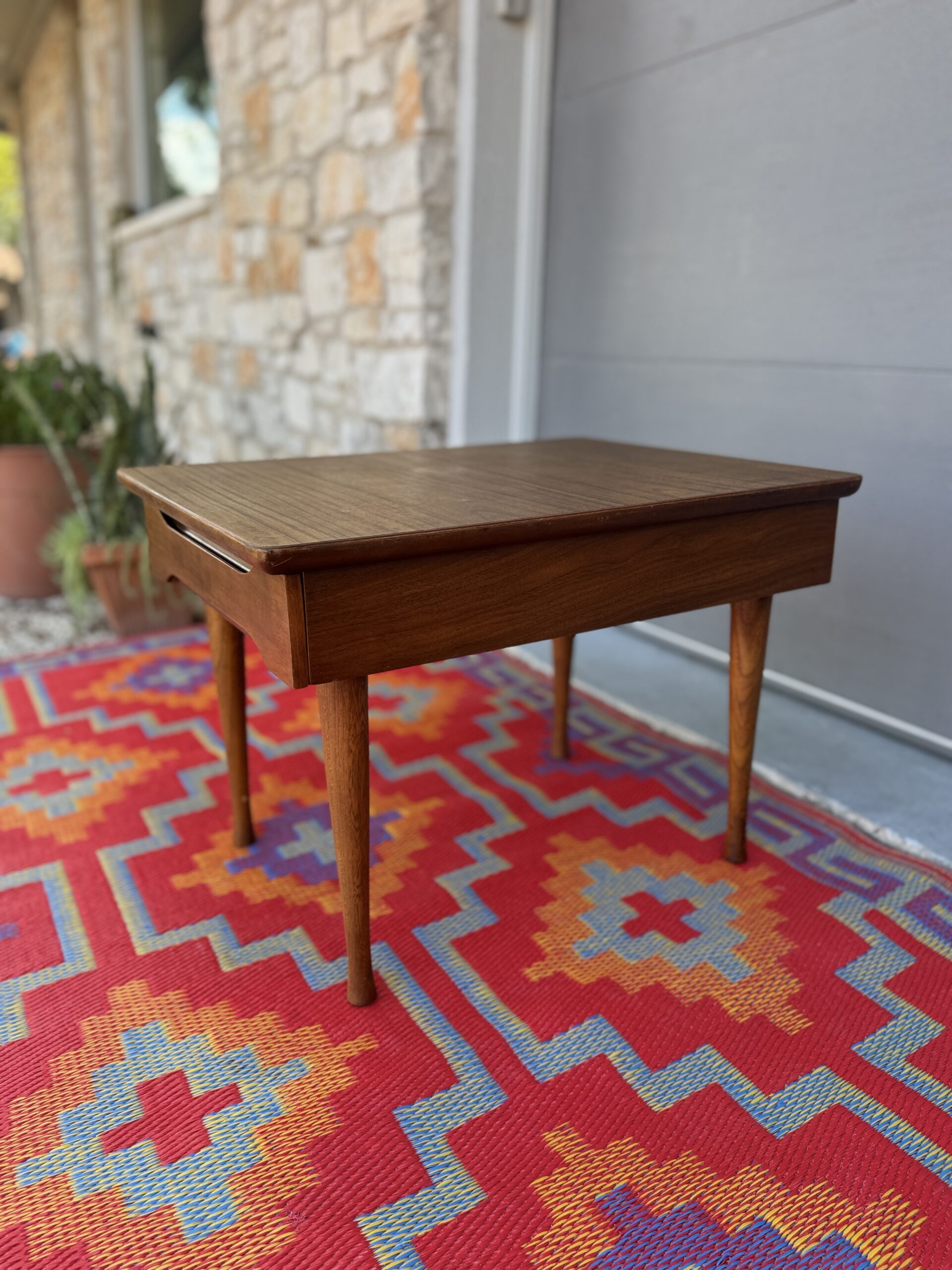 This vintage American of Martinsville side table is a beautiful example of mid-century craftsmanship. Featuring a single sliding drawer with sculpted recessed pull and tapered legs, it blends sleek form with everyday function. Its compact scale makes it a versatile piece, whether used as a side table, nightstand, or end table.
