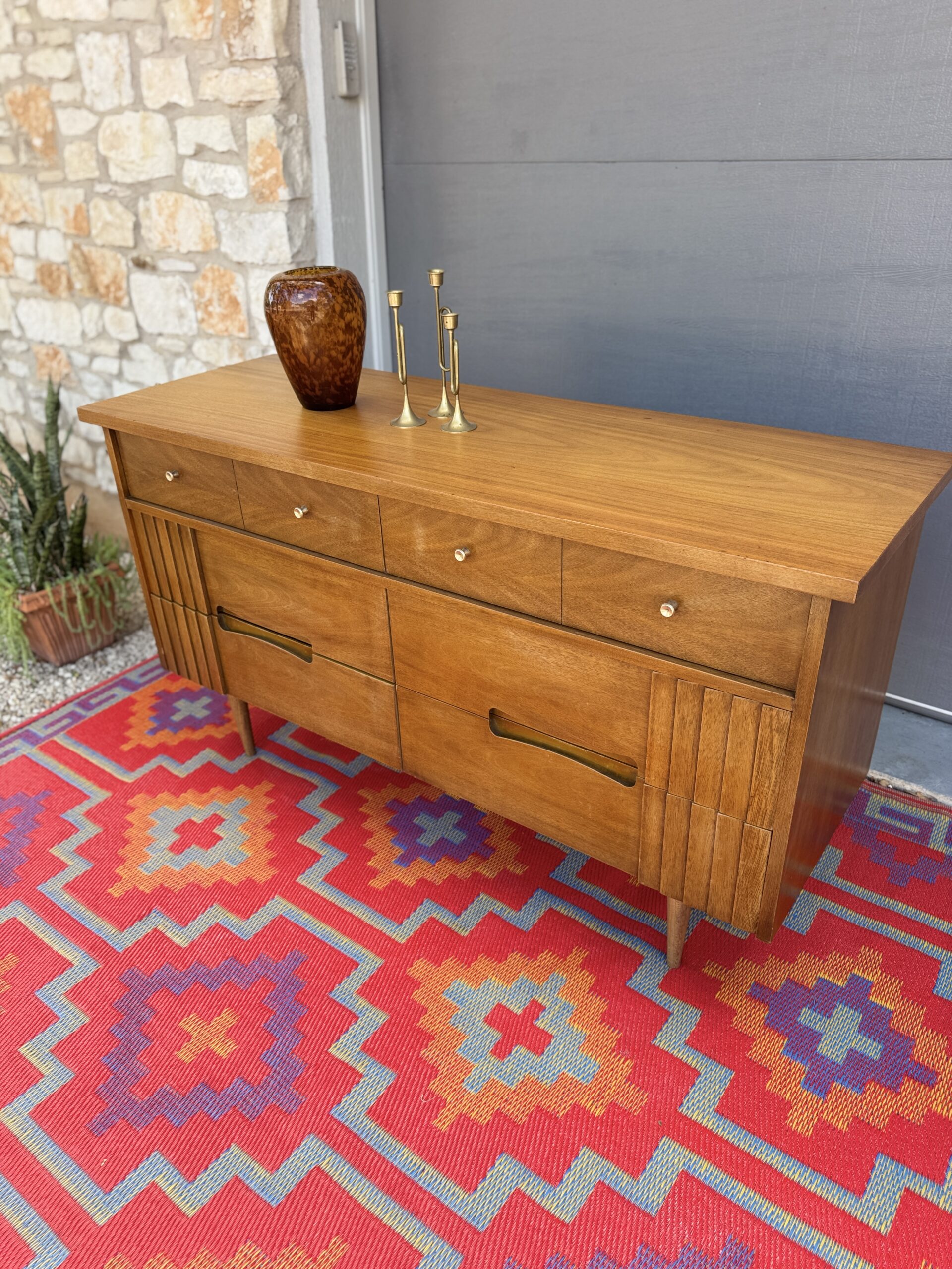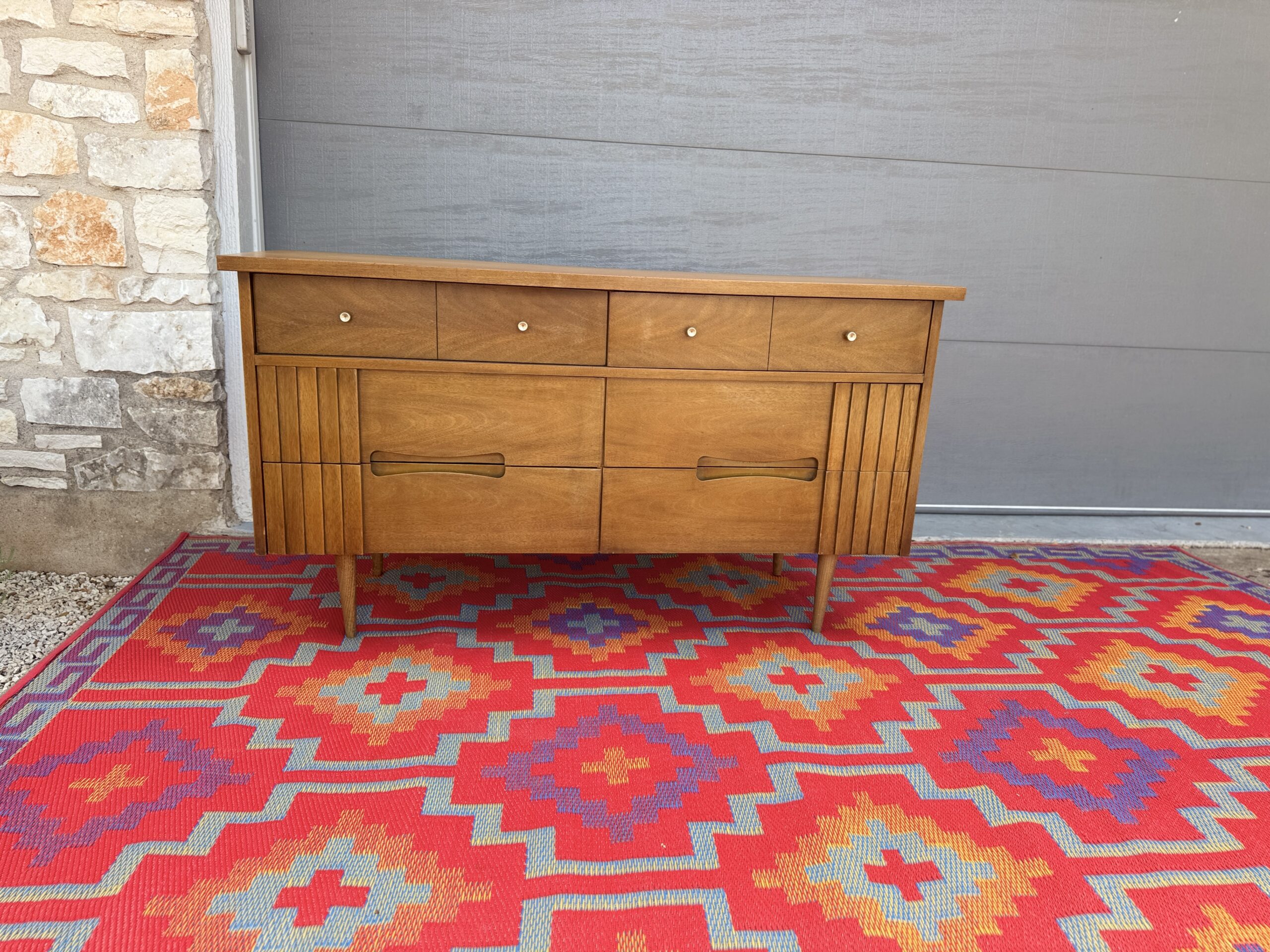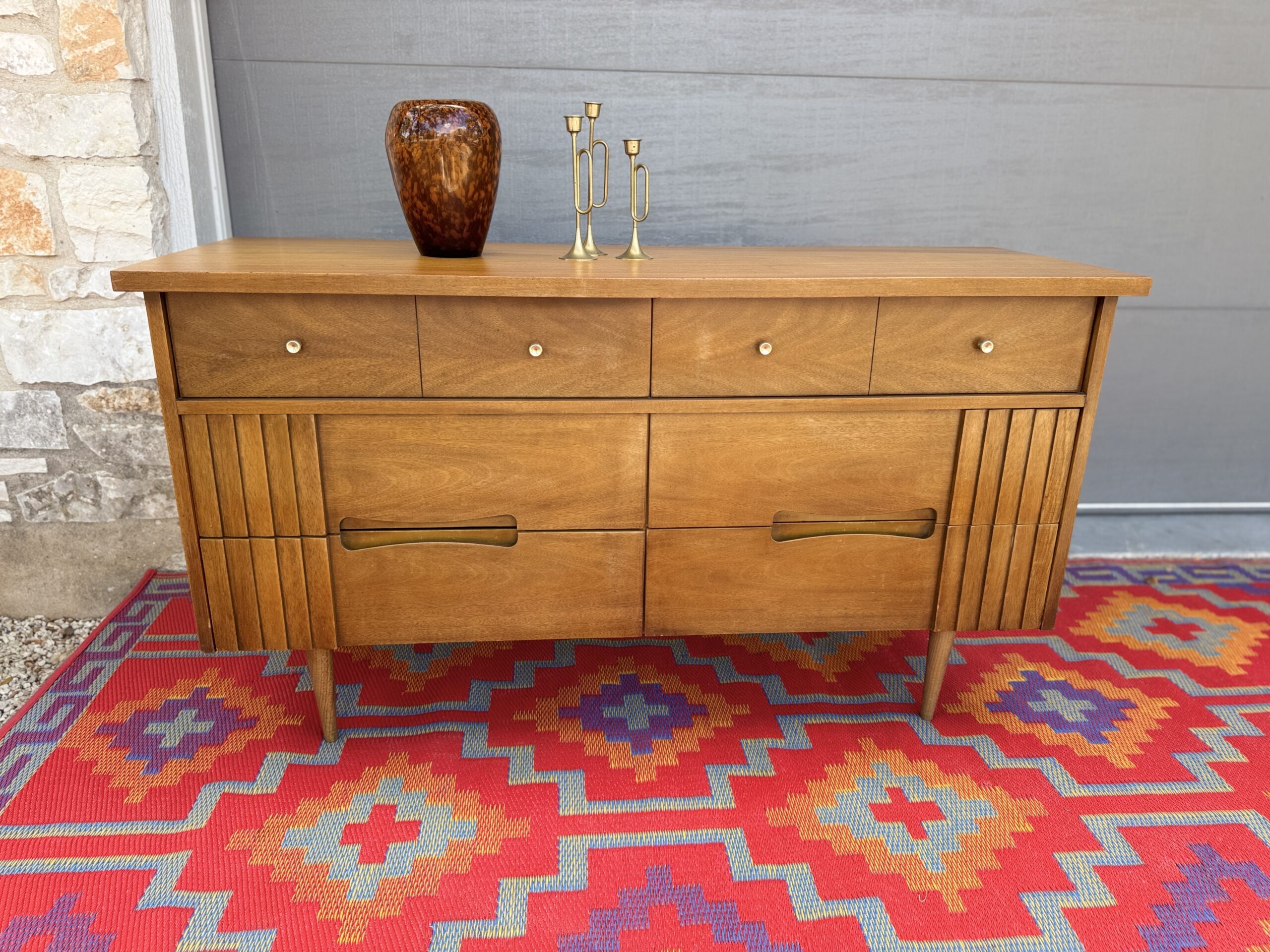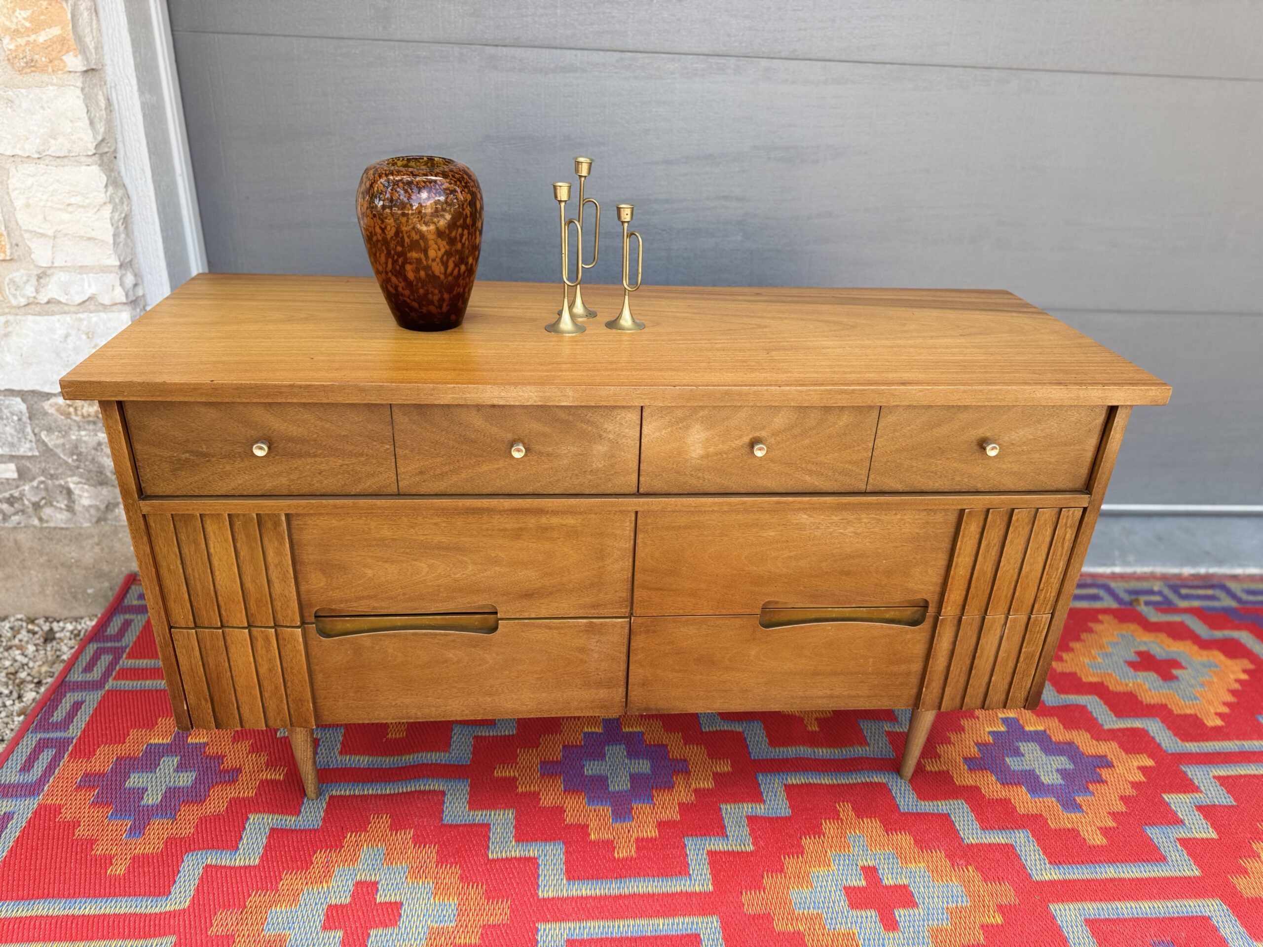 Perfect as a bedroom dresser, entryway or everyday storage console. This versatile piece features classic mcm lines with unique drawer pulls and vertical wooden drawer details.
