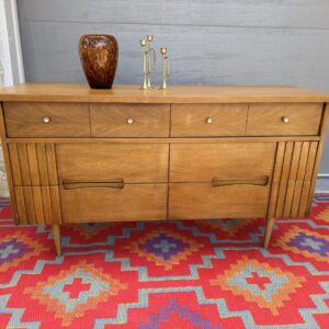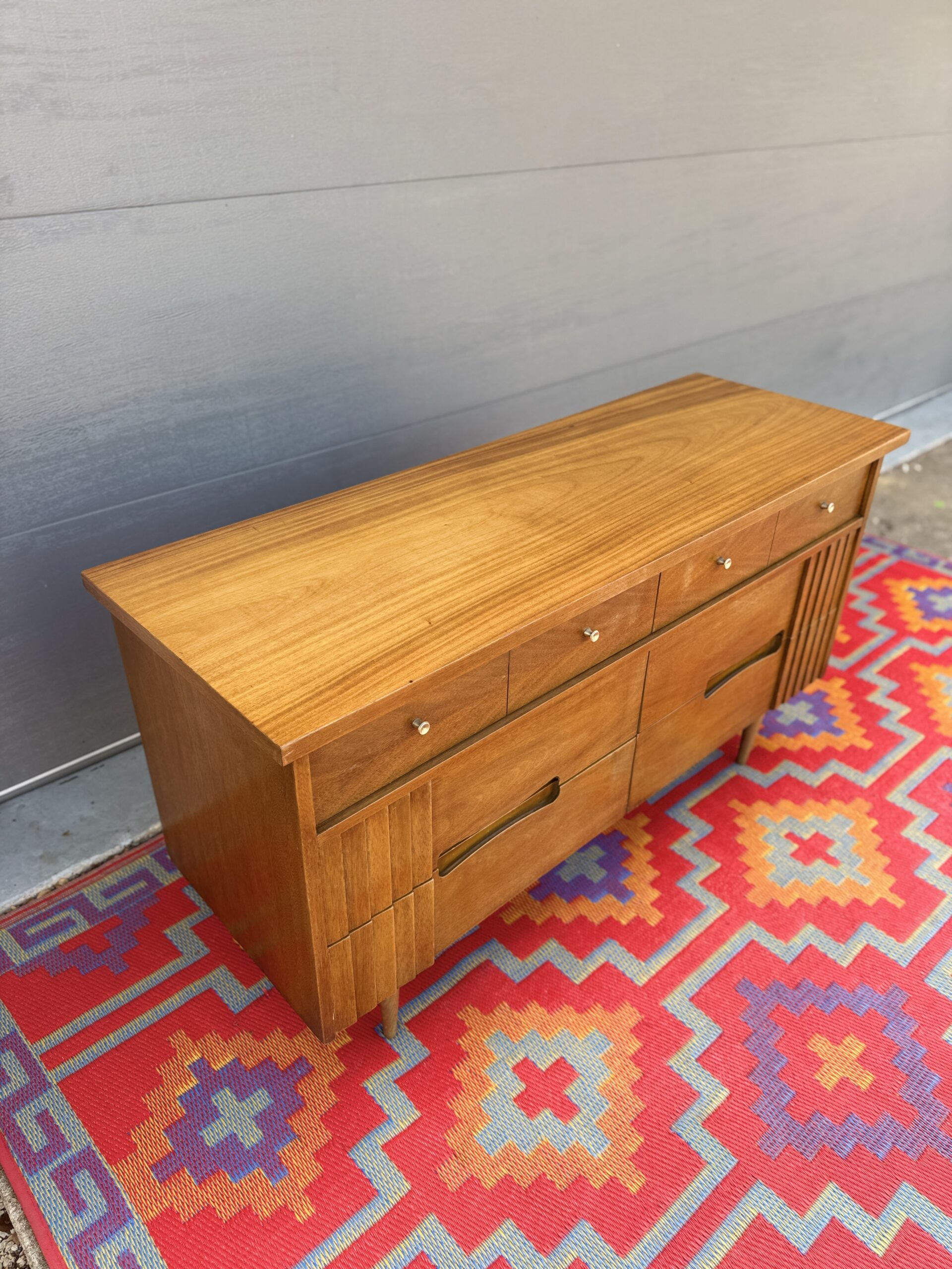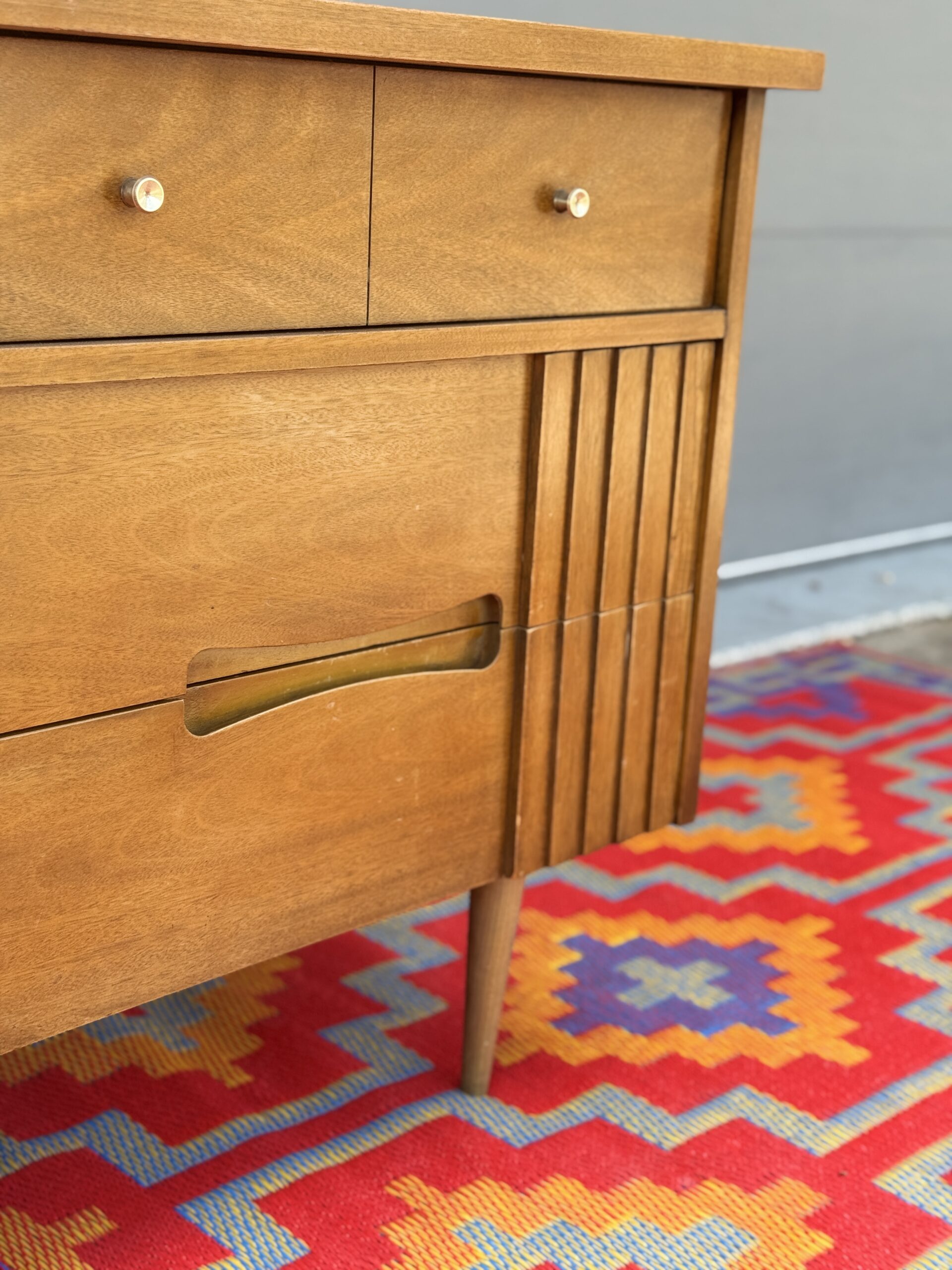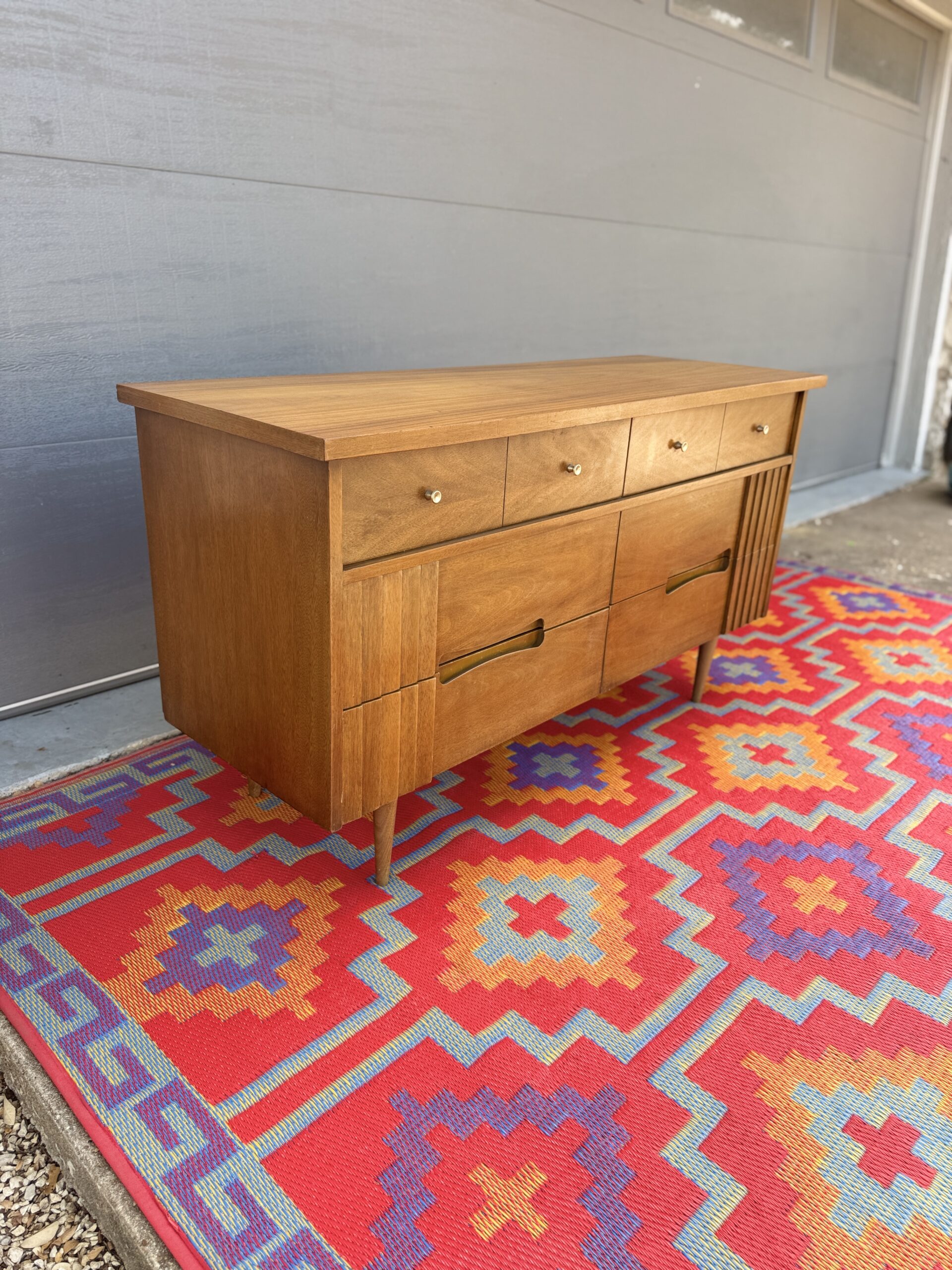 Perfect as a bedroom dresser, entryway or everyday storage console. This versatile piece features classic mcm lines with unique drawer pulls and vertical wooden drawer details.