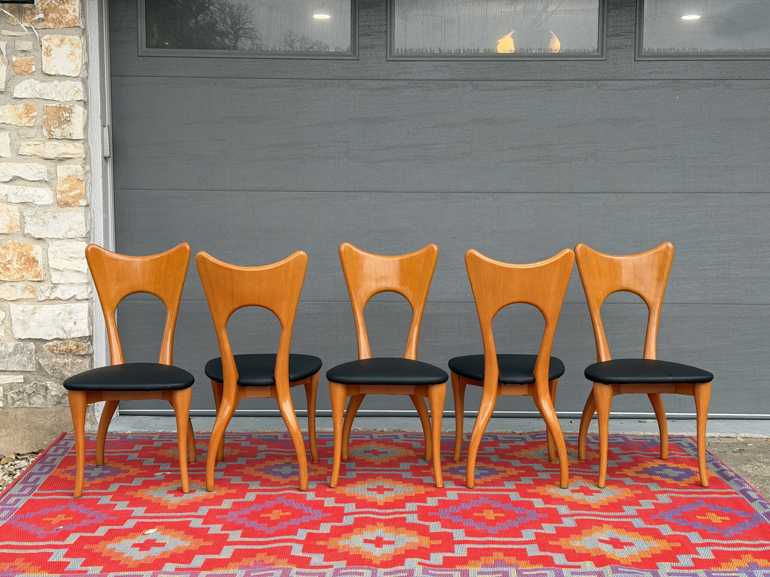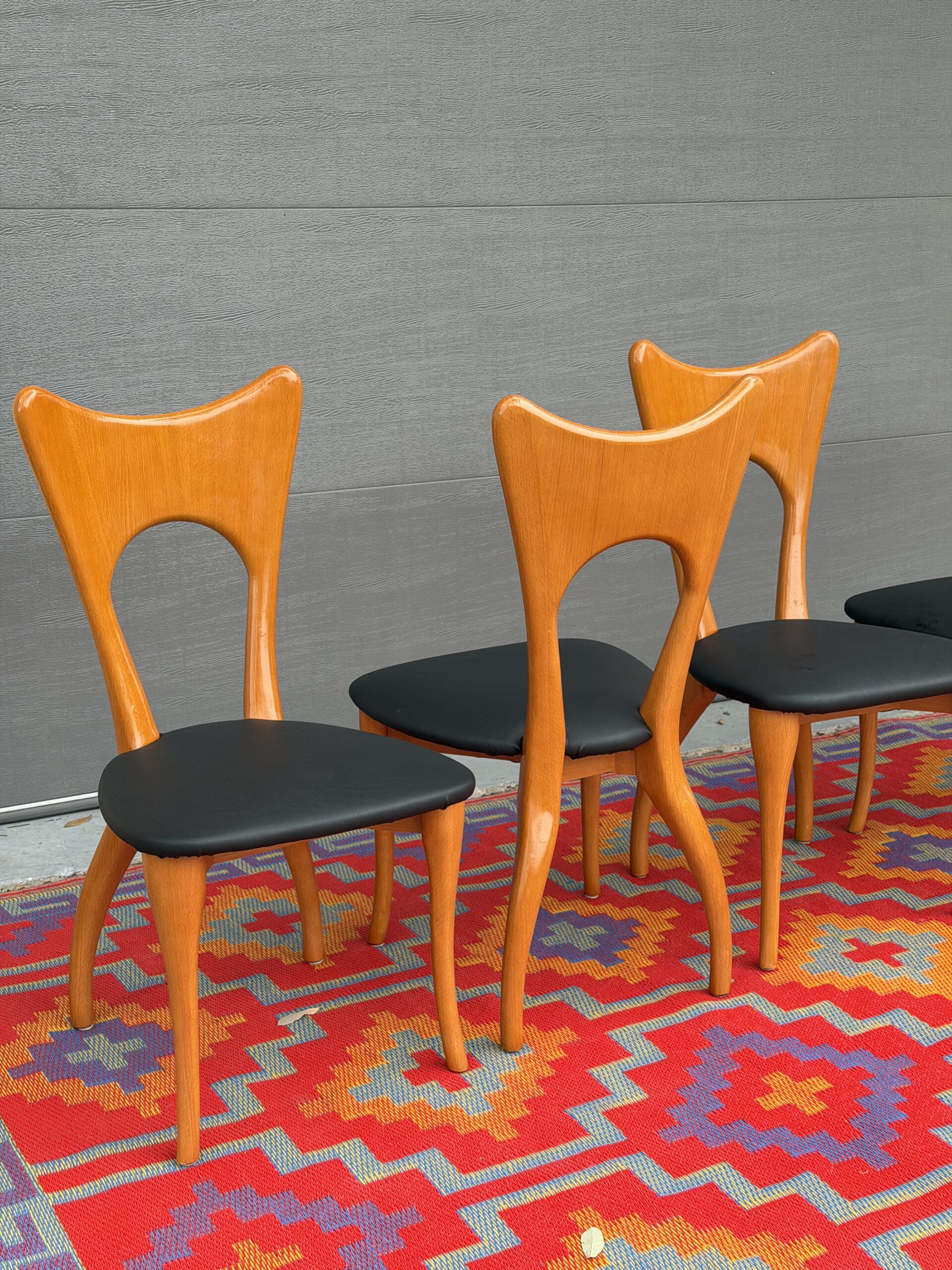A set of five sculptural biomorphic dining chairs attributed to Paul Frankl, featuring elegant organic lines, dramatic curved frames, and beautifully tapered legs. The sculptural silhouette makes these chairs visually striking from every angle.