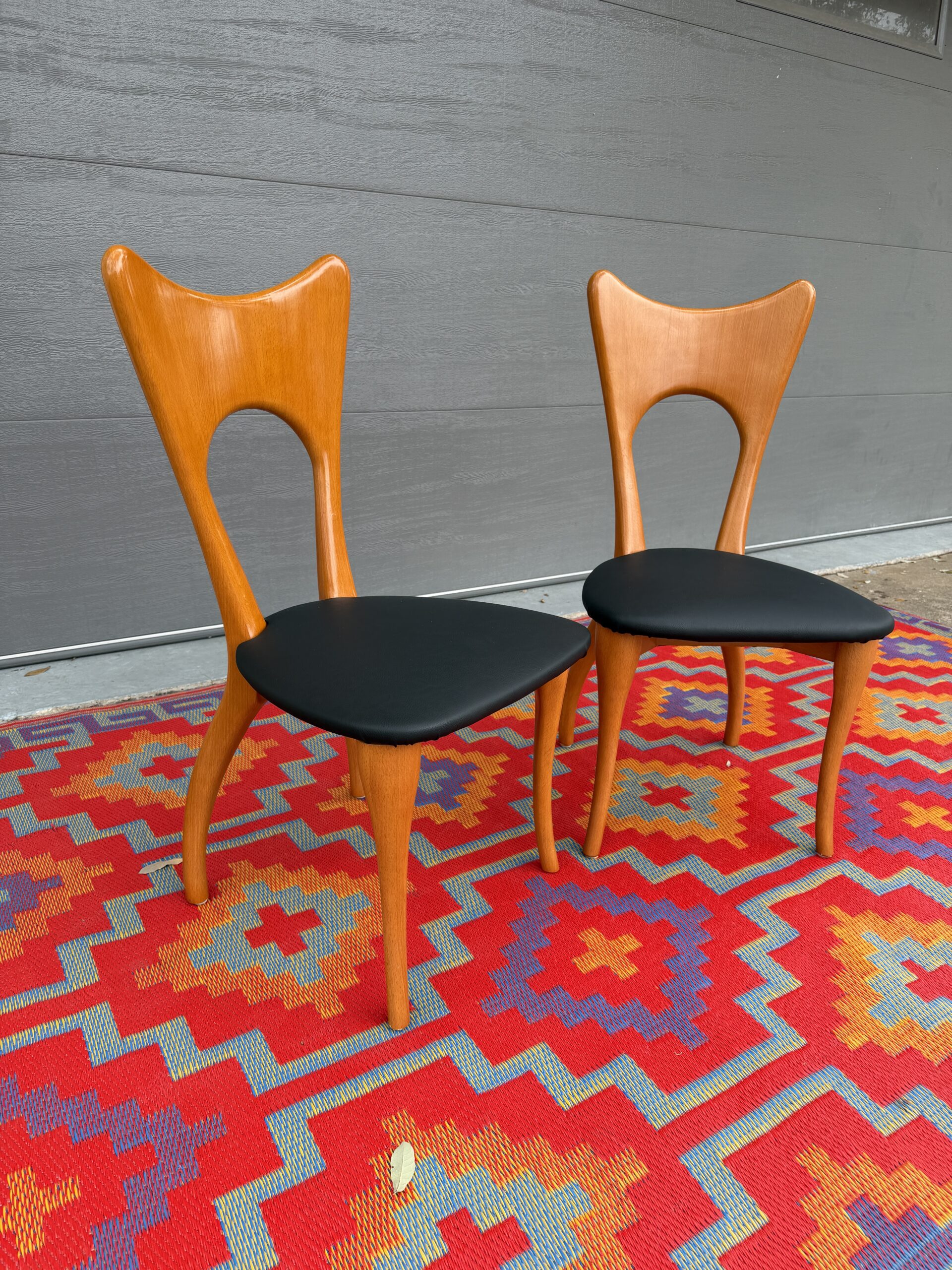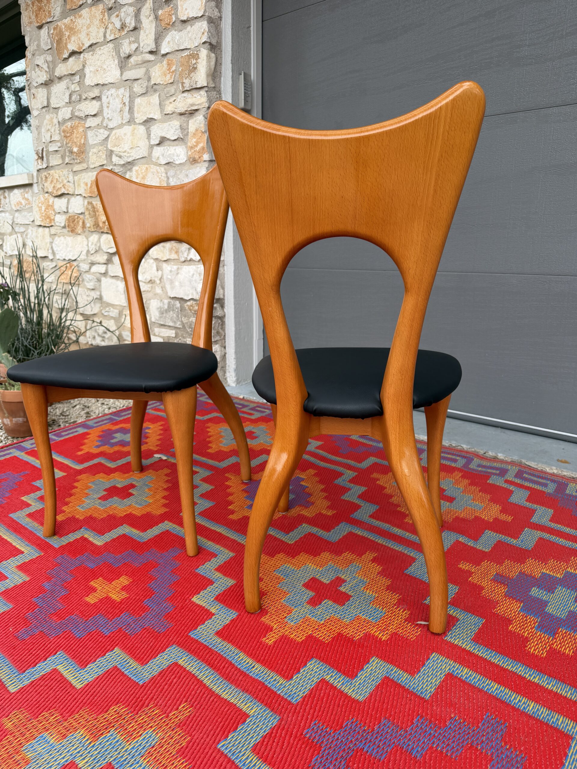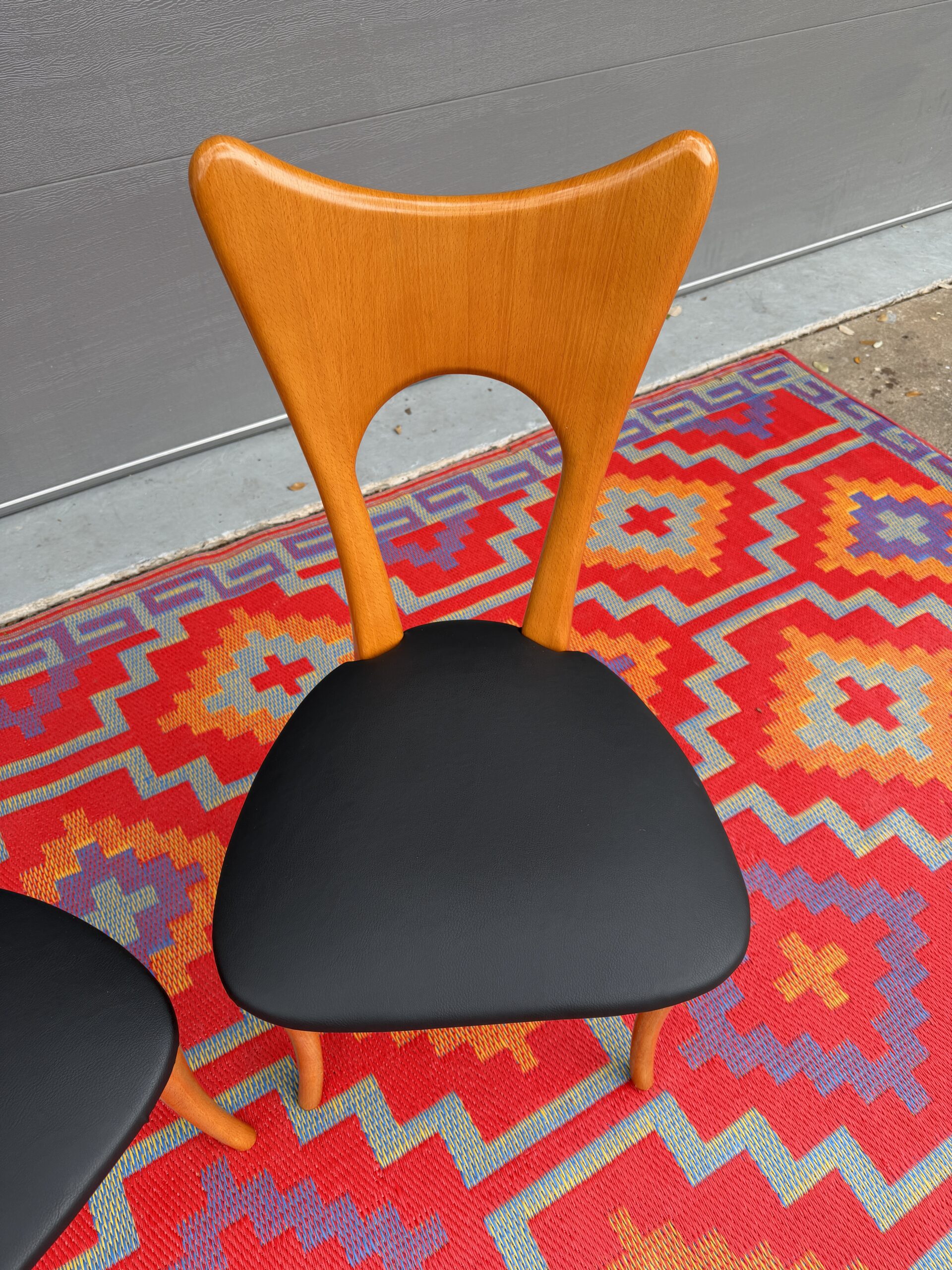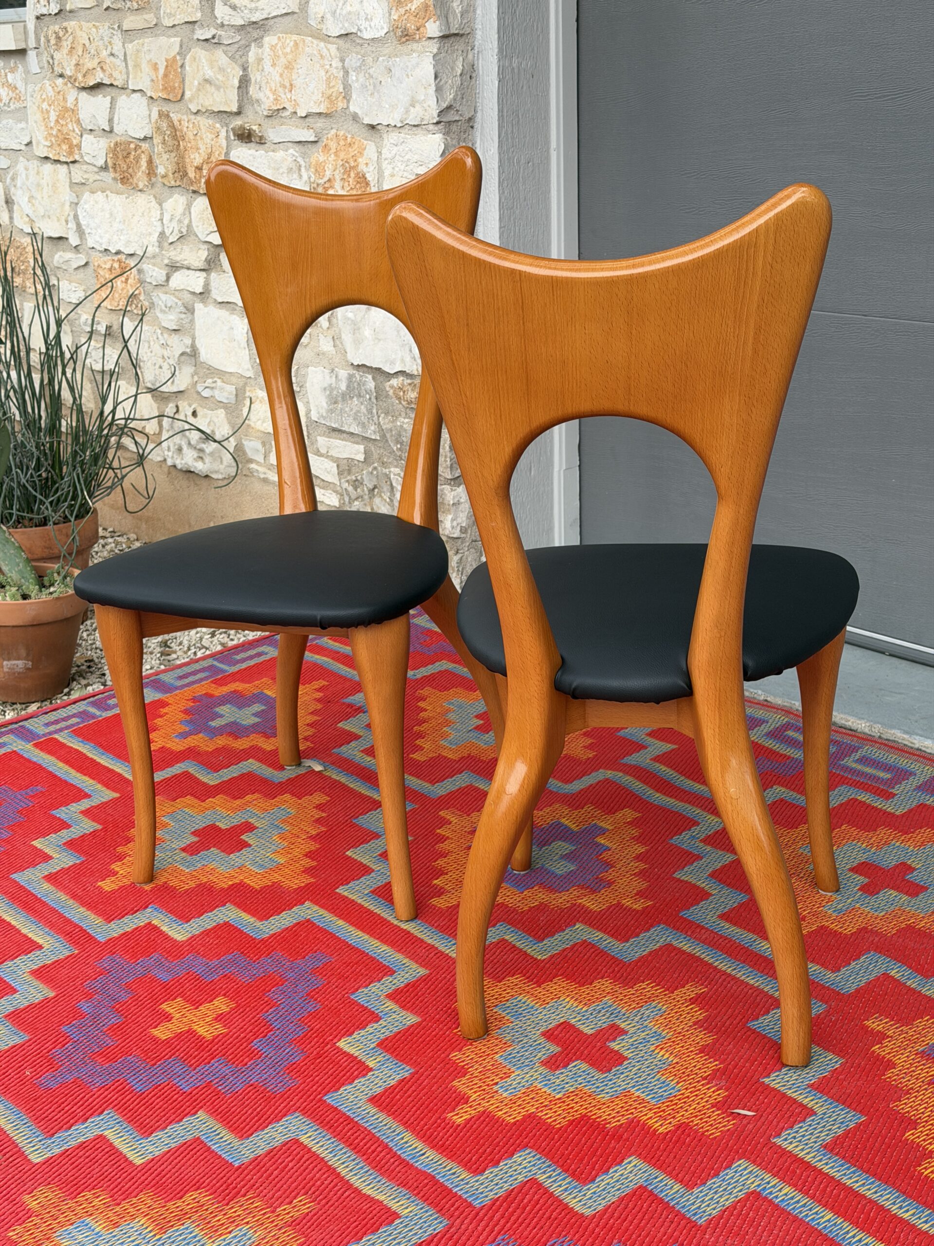 Seats have been newly recovered in durable black faux leather that is wipe-clean and low maintenance—ideal for everyday use while maintaining a refined mid-century look.