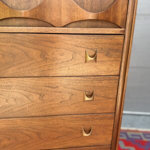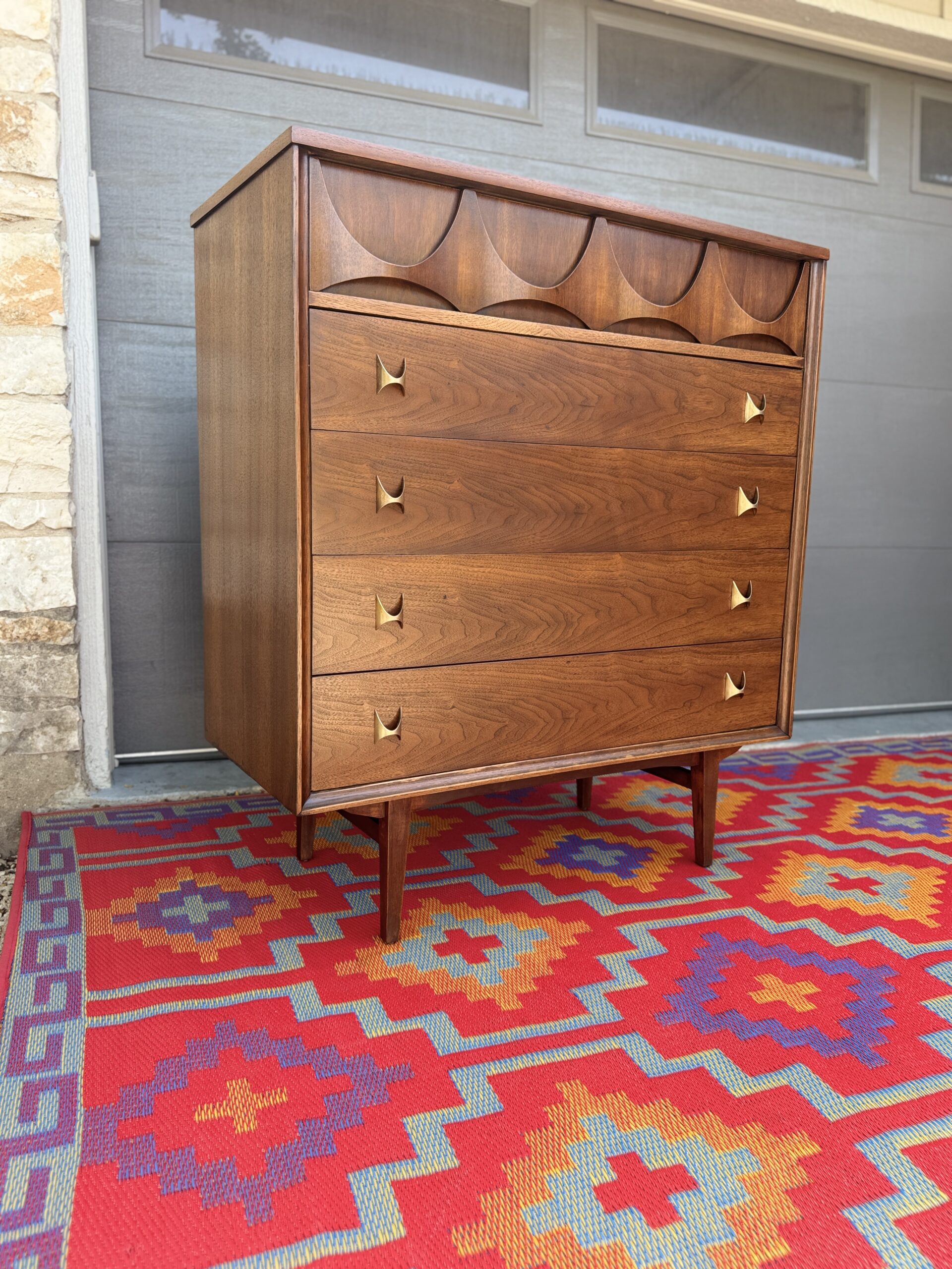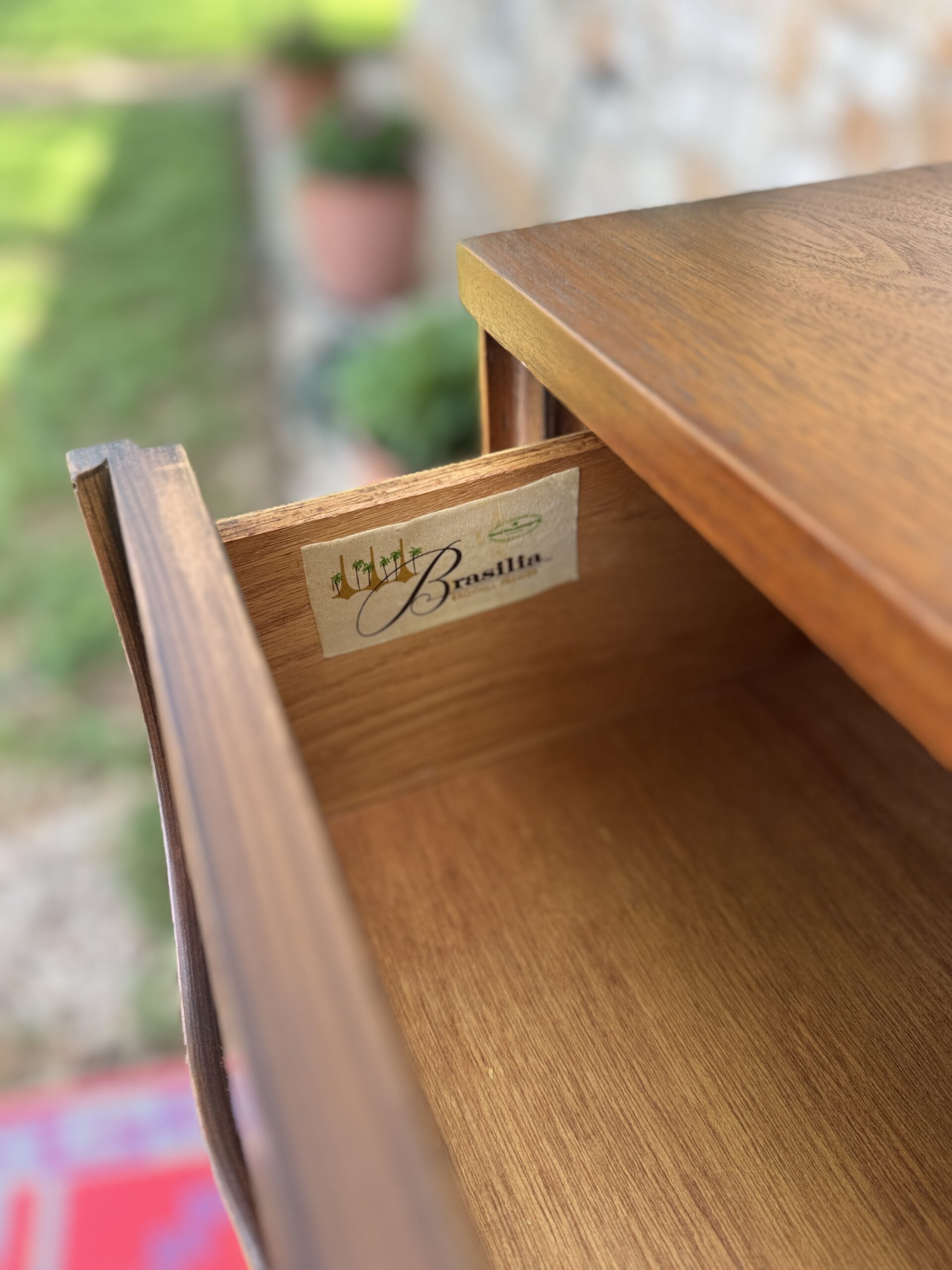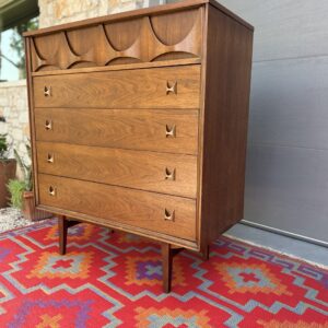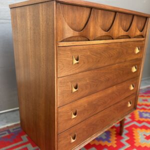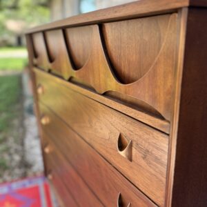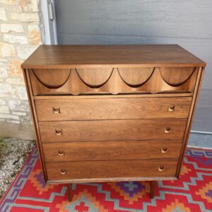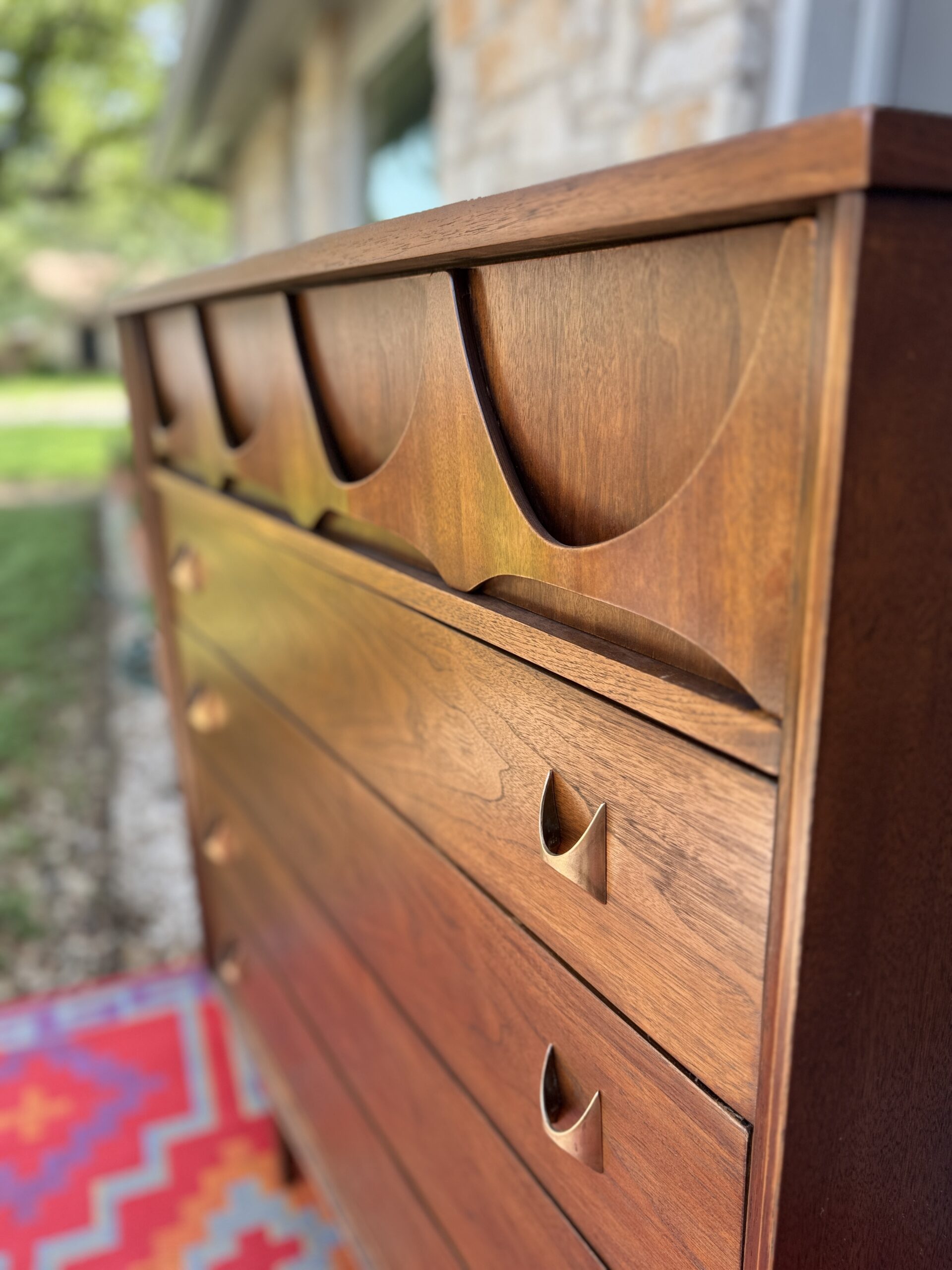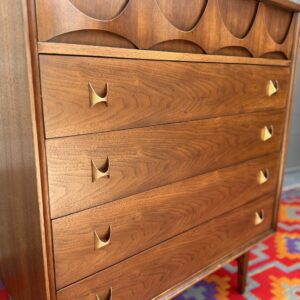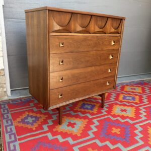 This striking tallboy dresser from the iconic Broyhill Brasilia collection blends sculptural design with bold mid-century character. Inspired by Oscar Niemeyer’s architectural forms, the Brasilia line is a hallmark of American modernist furniture — and this piece is a true standout.