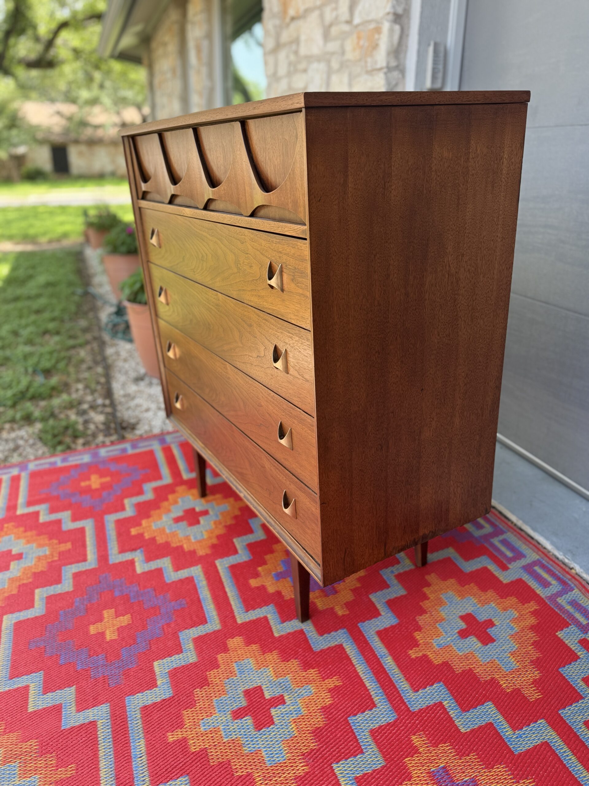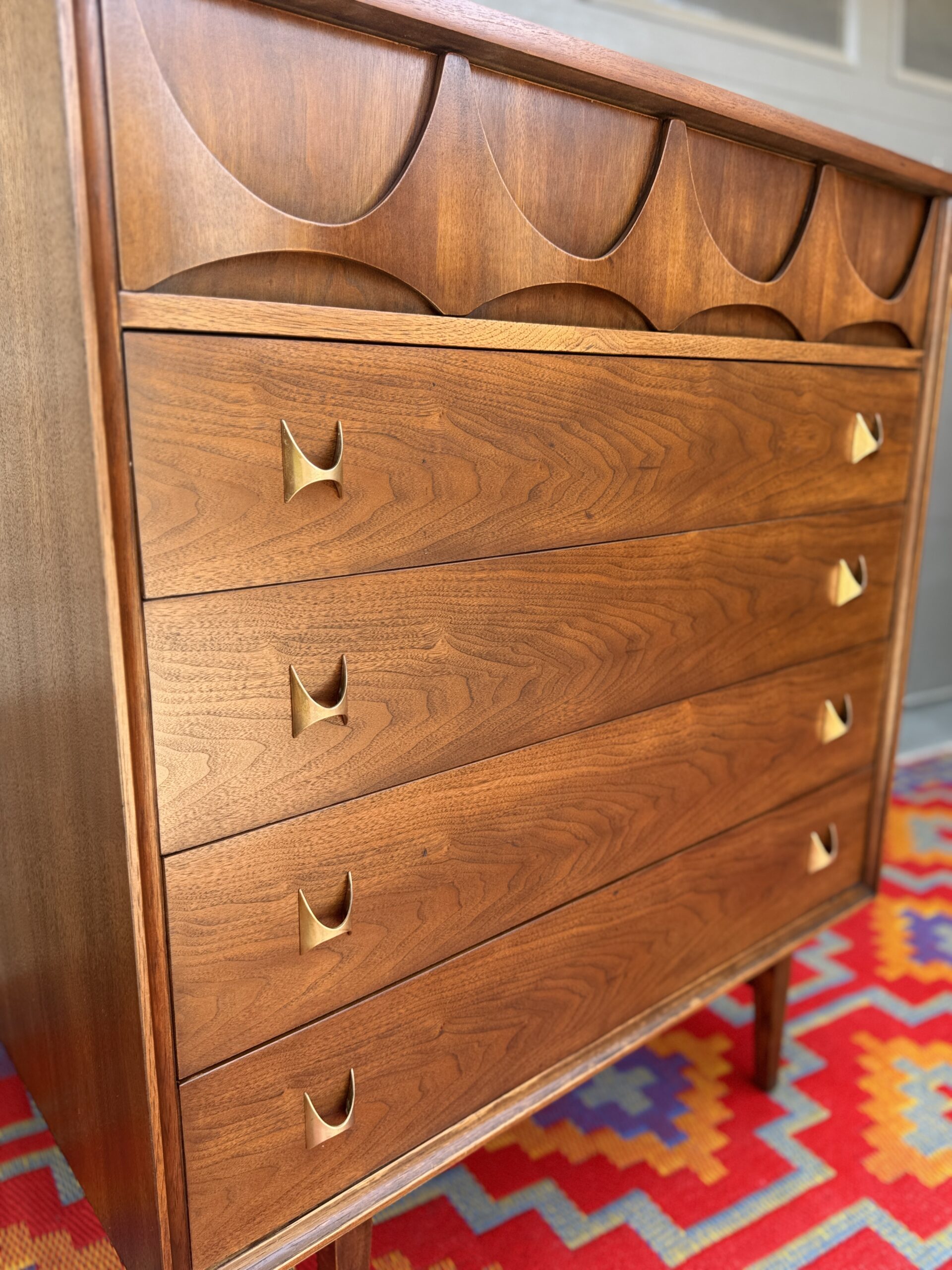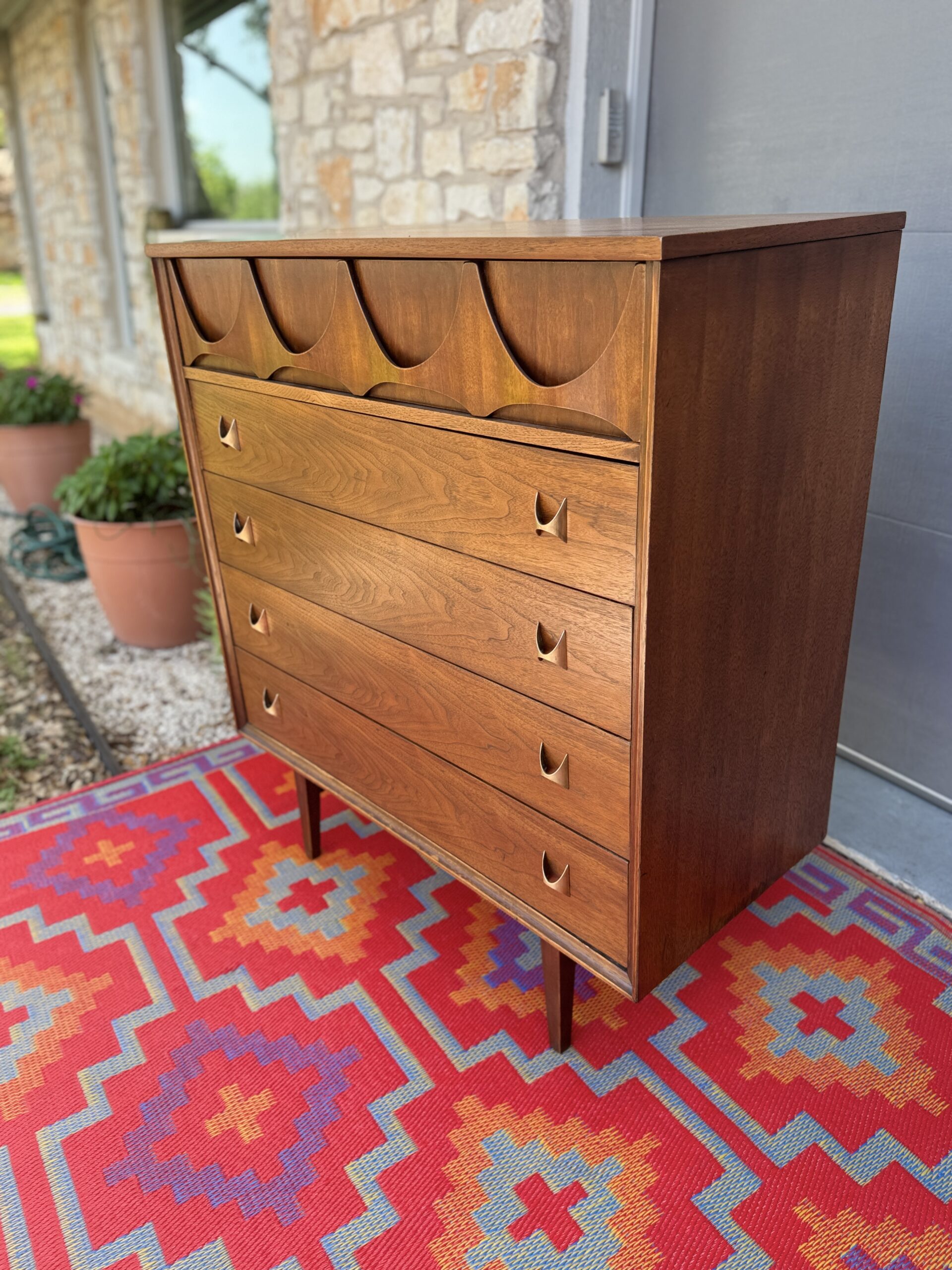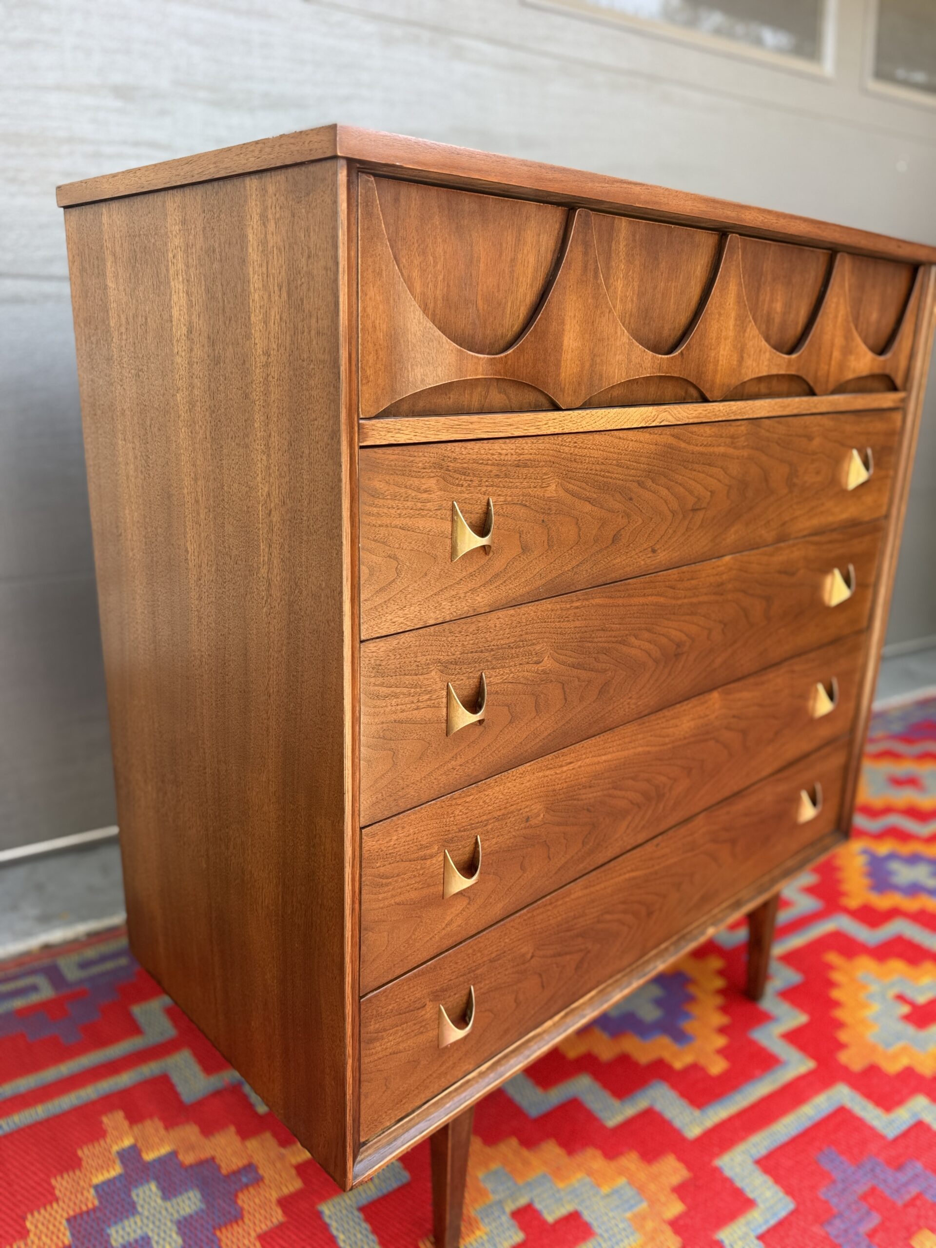 This striking tallboy dresser from the iconic Broyhill Brasilia collection blends sculptural design with bold mid-century character. Inspired by Oscar Niemeyer’s architectural forms, the Brasilia line is a hallmark of American modernist furniture — and this piece is a true standout.