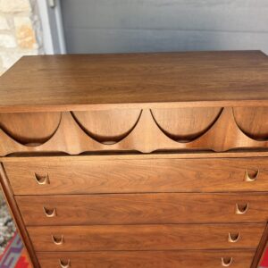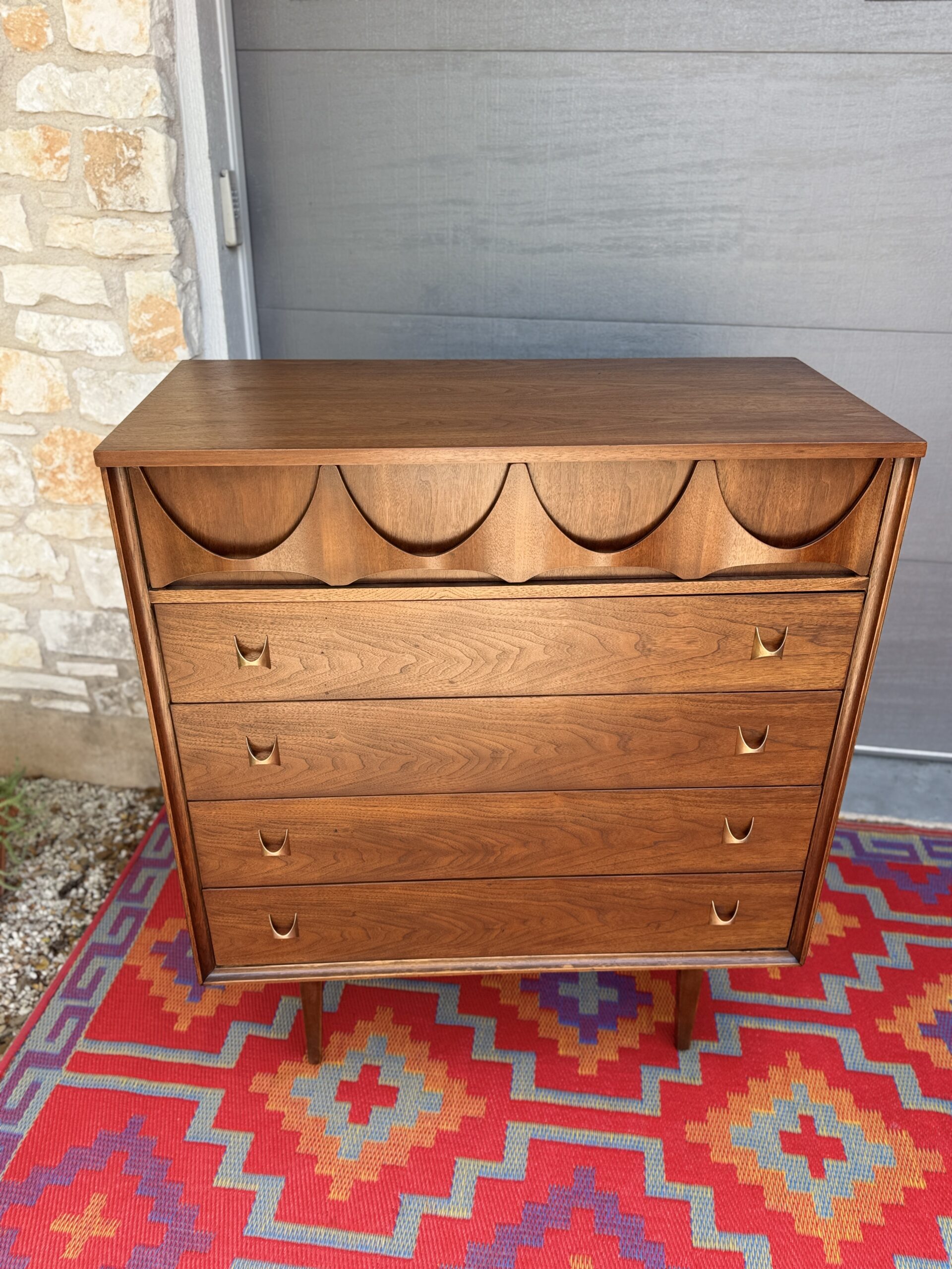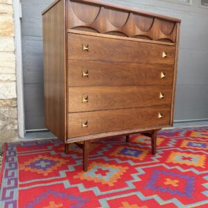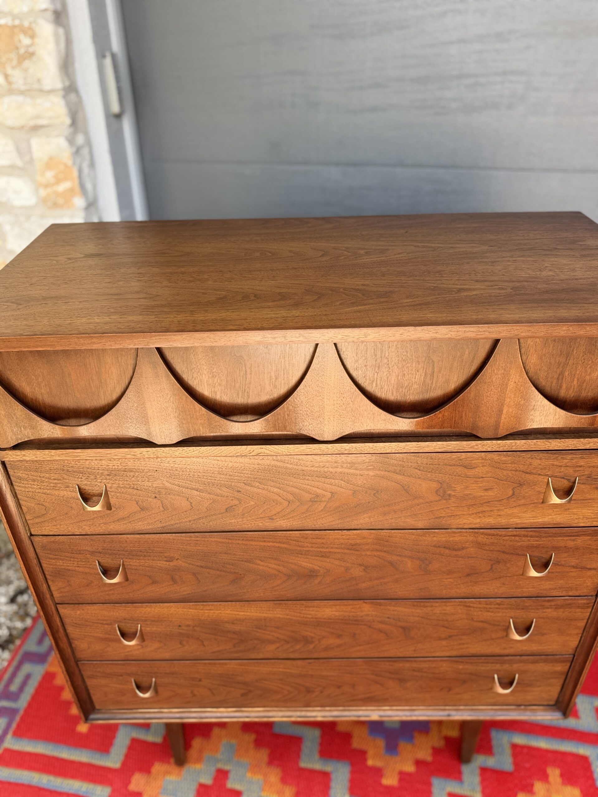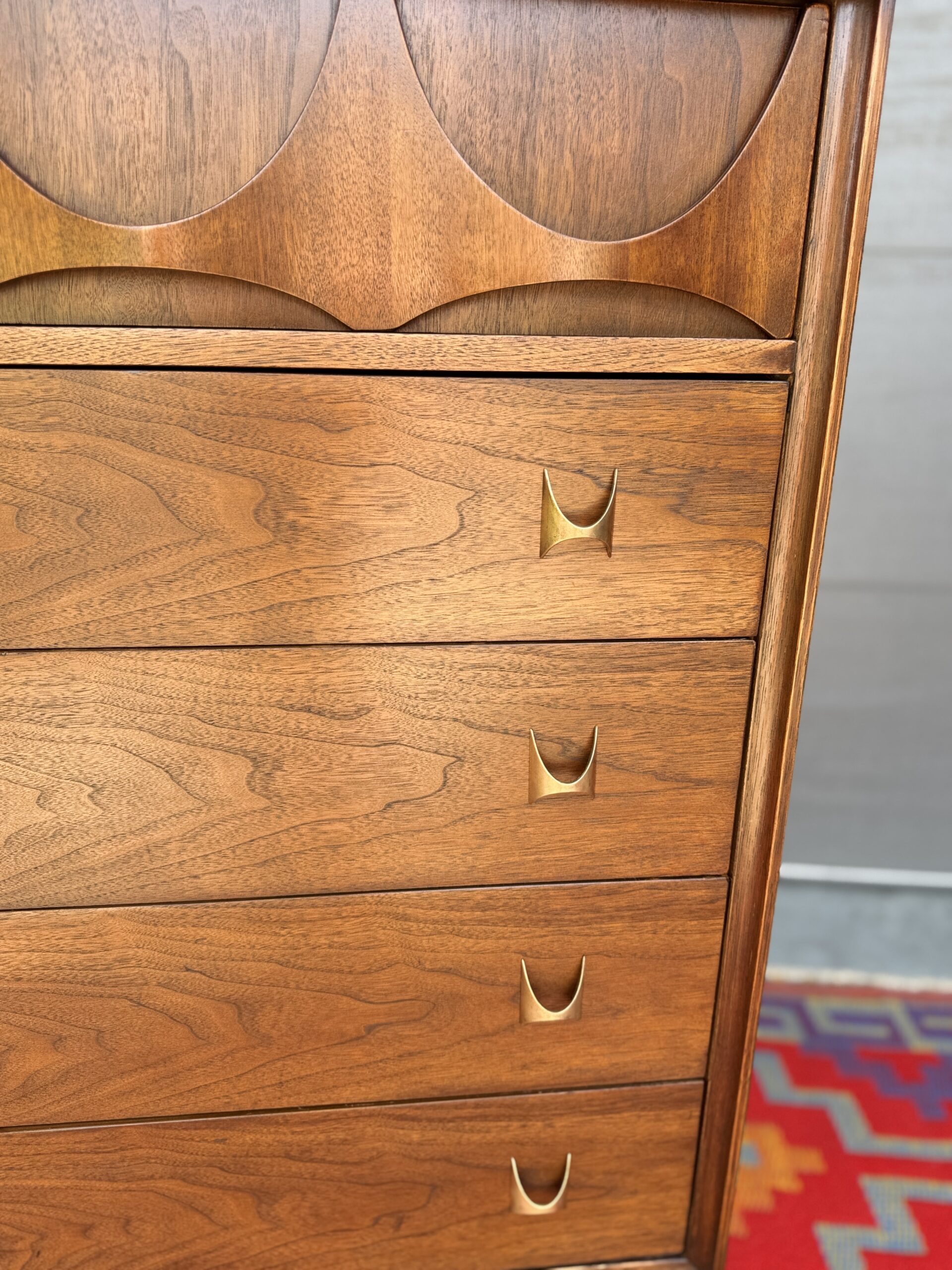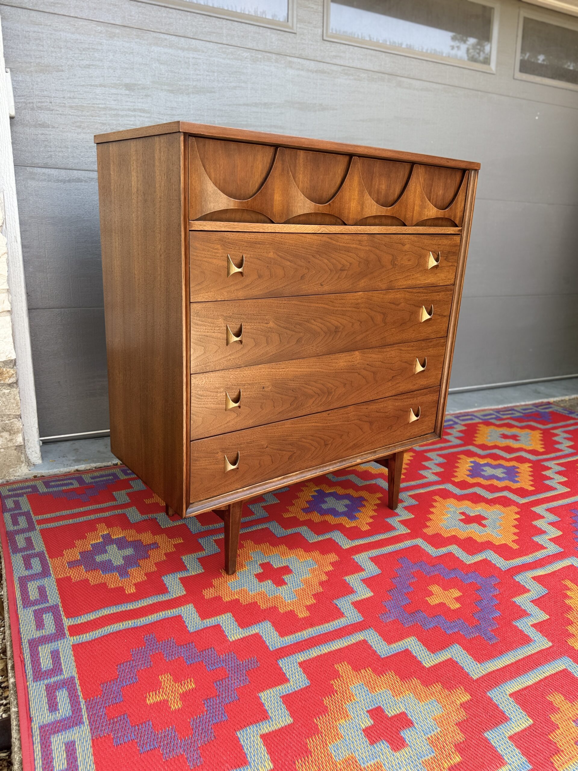 This striking tallboy dresser from the iconic Broyhill Brasilia collection blends sculptural design with bold mid-century character. Inspired by Oscar Niemeyer’s architectural forms, the Brasilia line is a hallmark of American modernist furniture — and this piece is a true standout.
