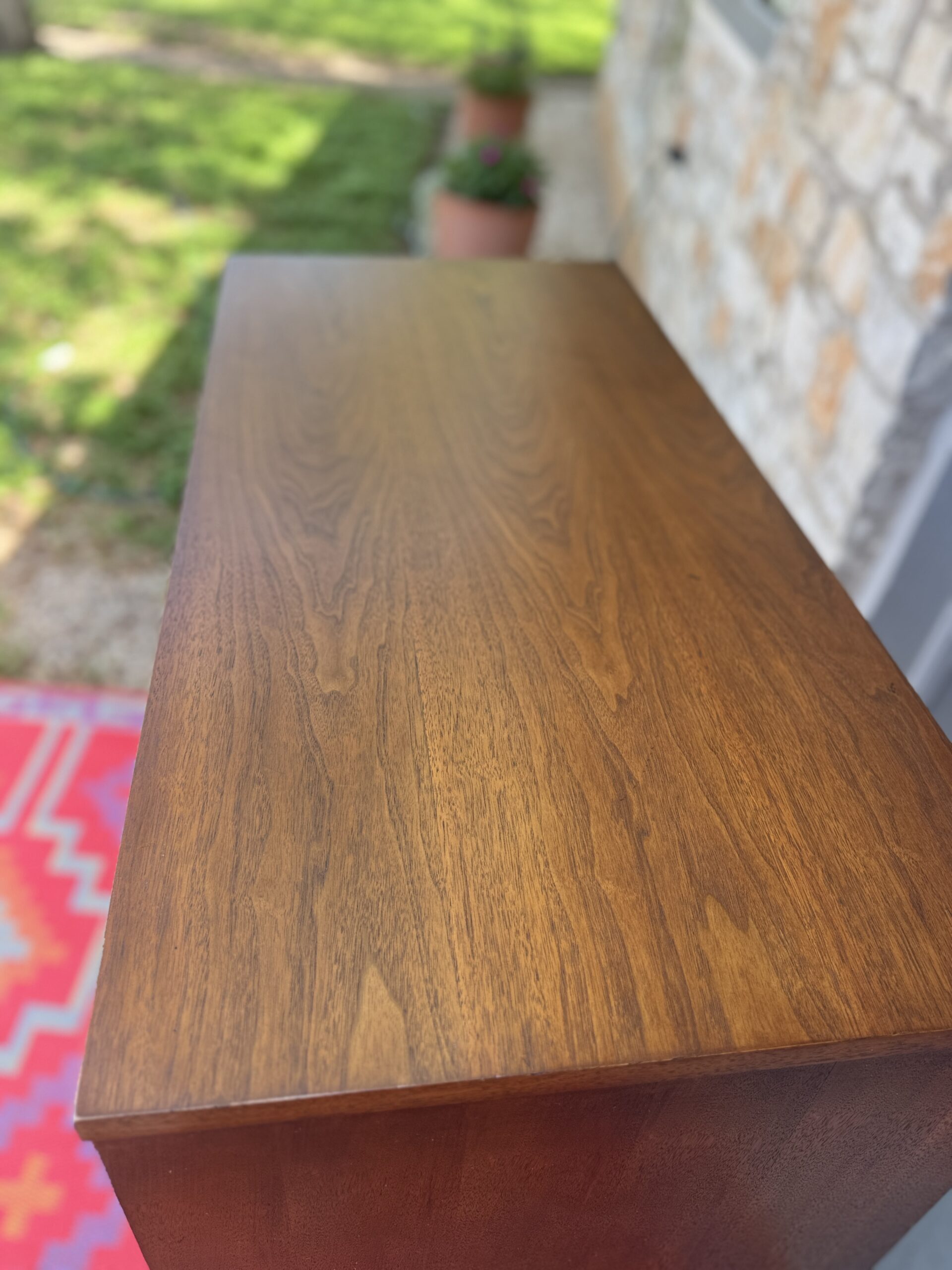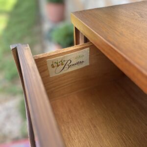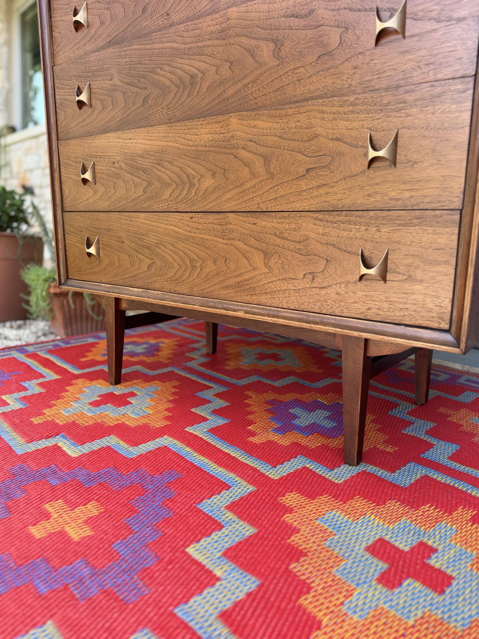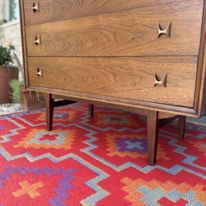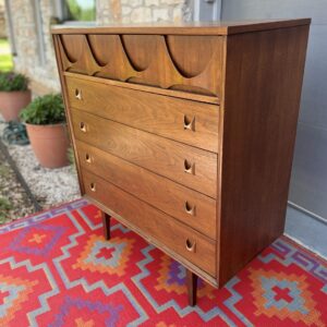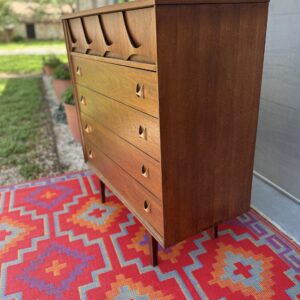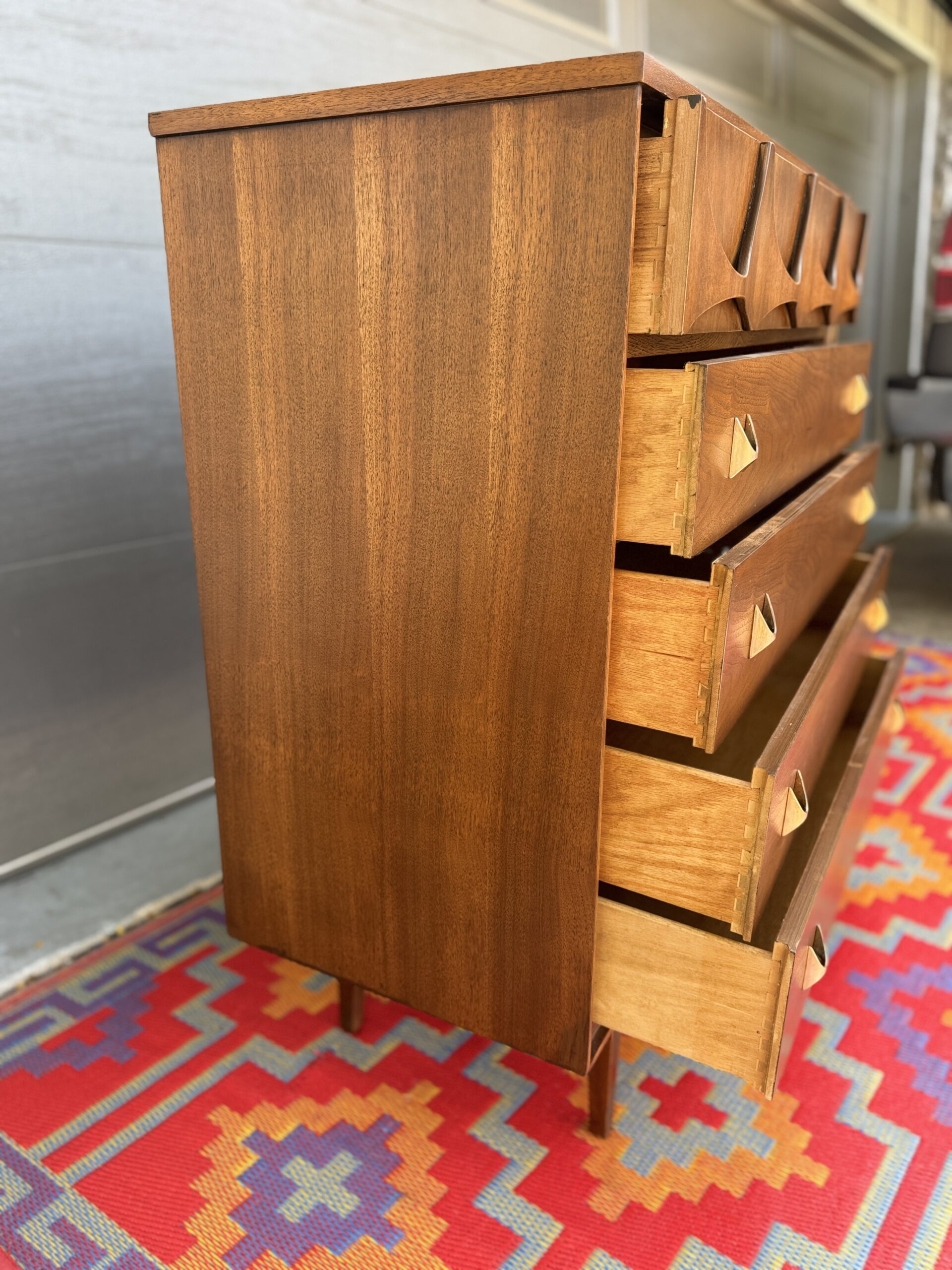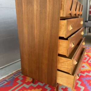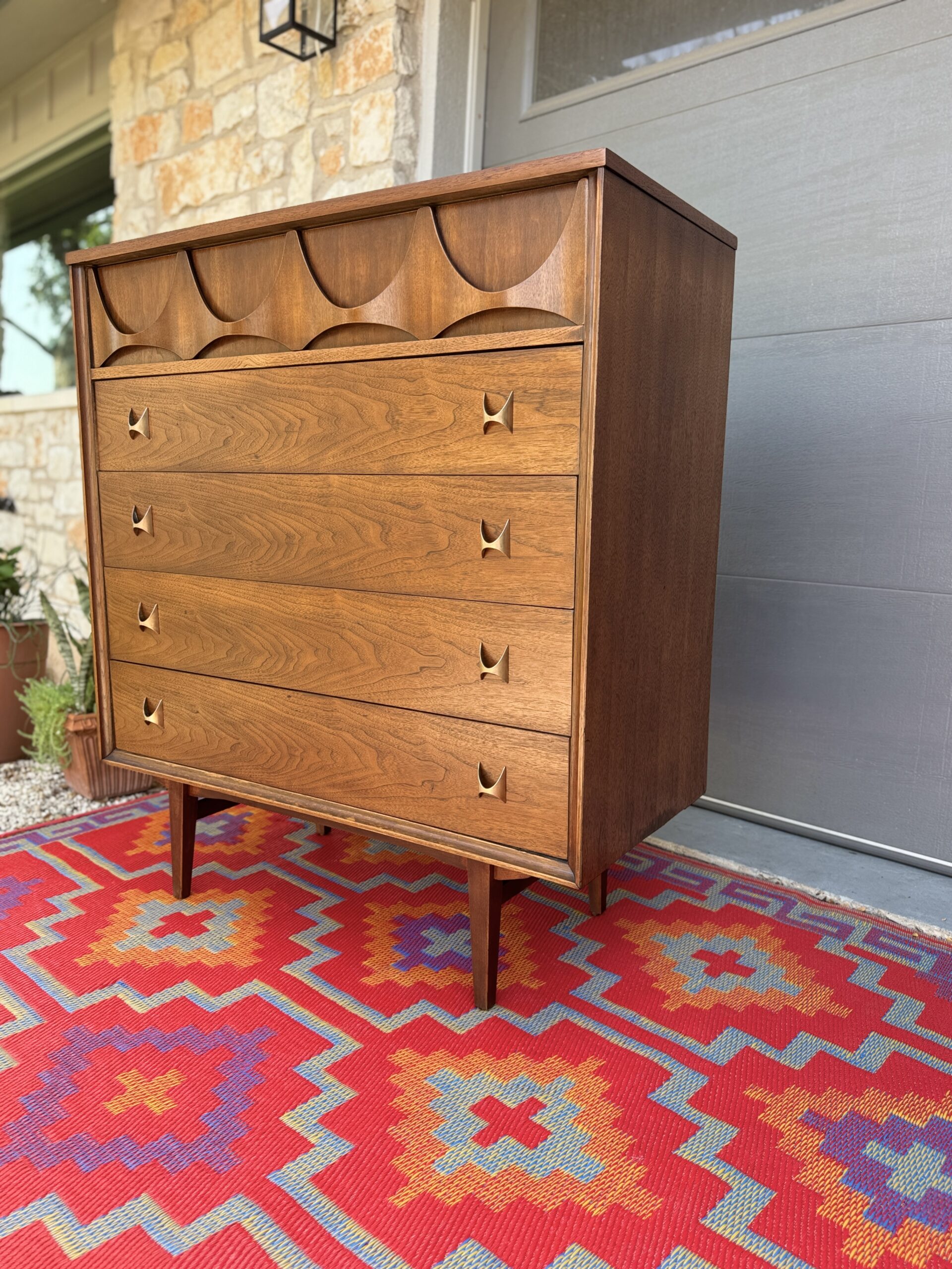 This striking tallboy dresser from the iconic Broyhill Brasilia collection blends sculptural design with bold mid-century character. Inspired by Oscar Niemeyer’s architectural forms, the Brasilia line is a hallmark of American modernist furniture — and this piece is a true standout.