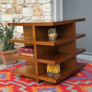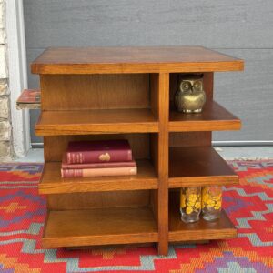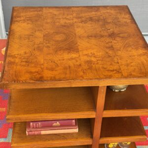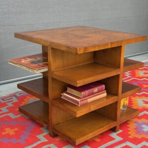 This stunning burl wood cube is a true statement piece. Featuring a gorgeous burl wood inlay top, paired with open shelving on all sides, this piece is both functional and sculptural. Use it as a side table, coffee table, bookcase, or display cube. Perfect for books, records, decor, and show casing all your goodies.