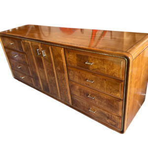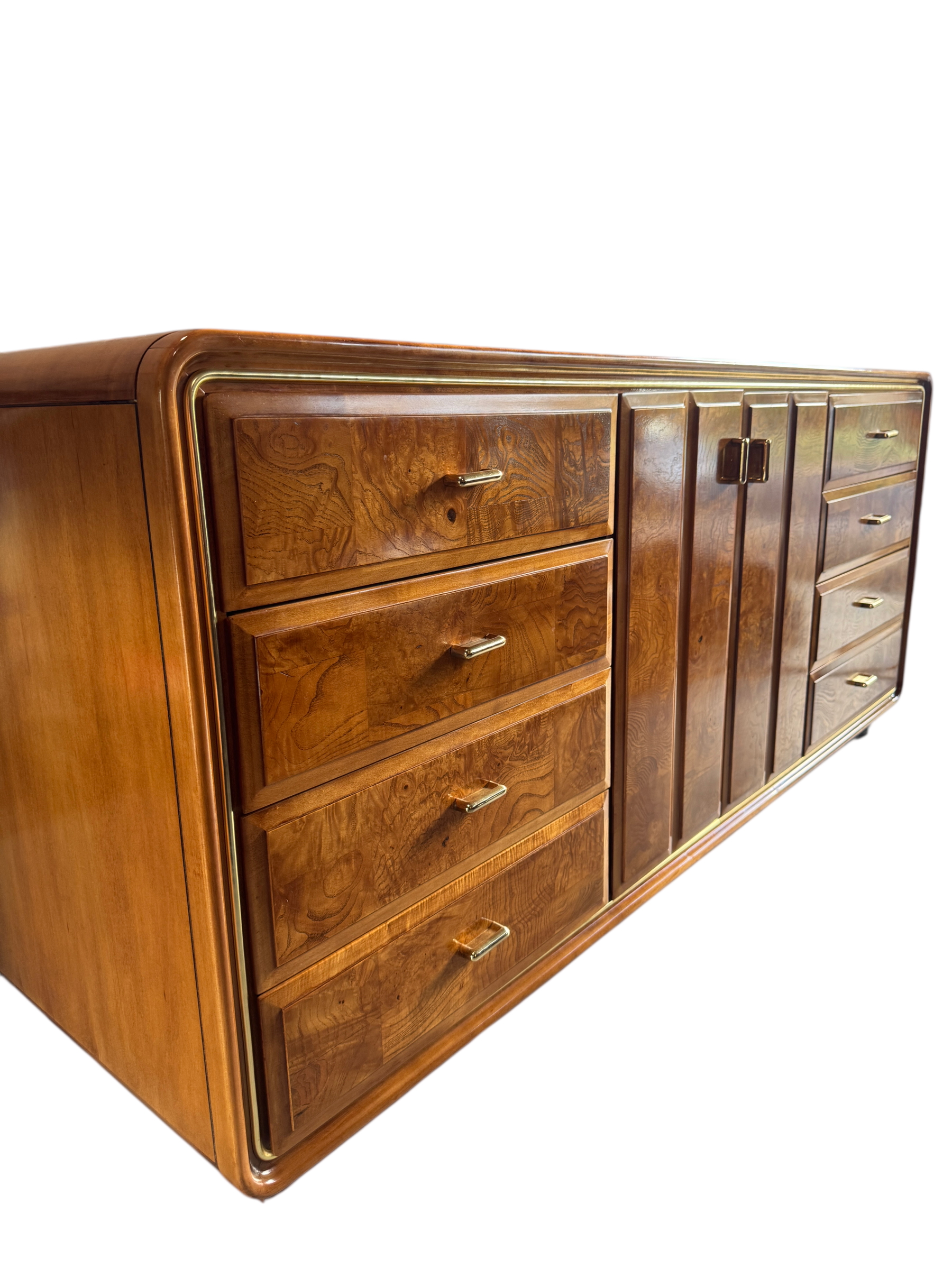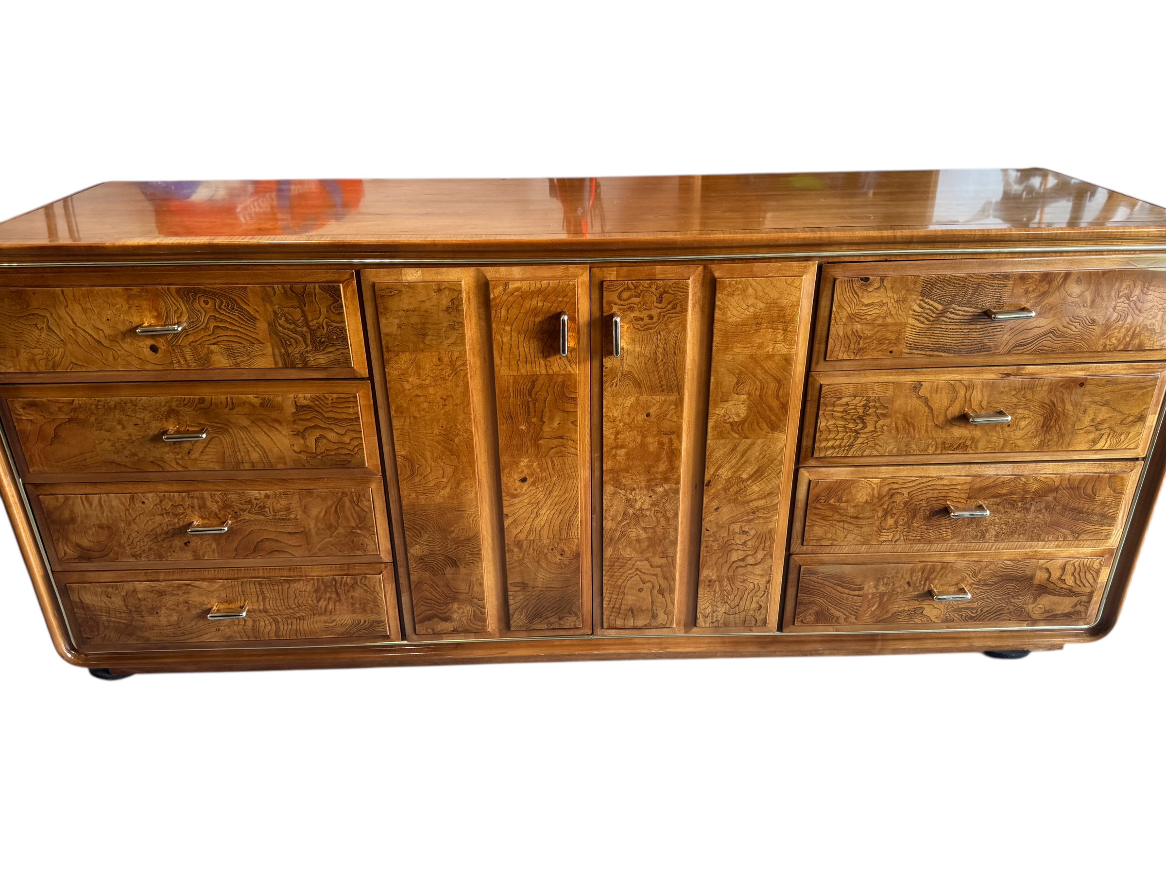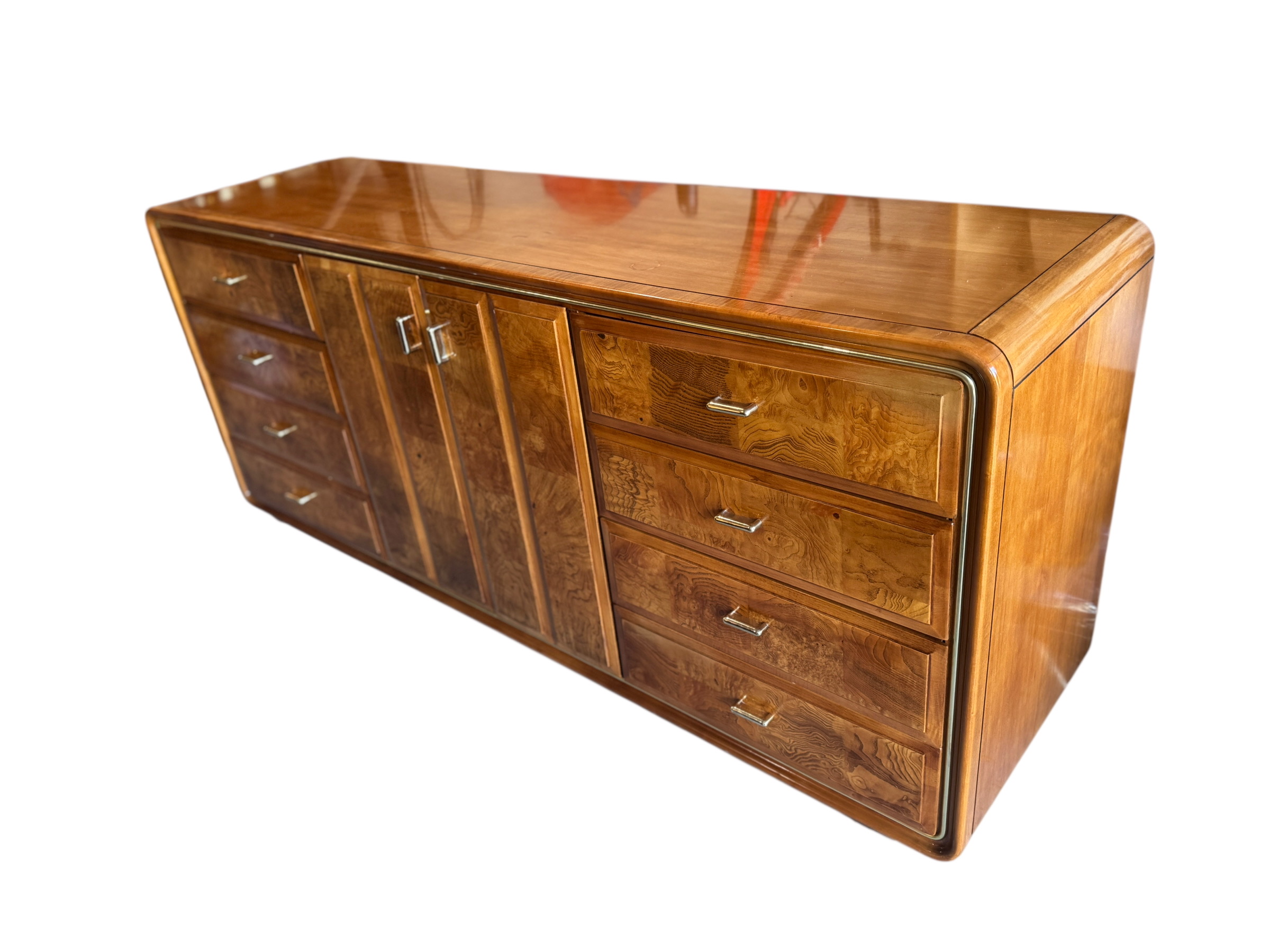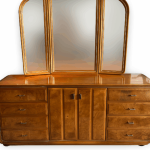 An absolute showstopper, this vintage American of Martinsville dresser set features highly figured burlwood veneer, rounded waterfall edges, and a sleek lacquered finish that gleams with warmth and richness.