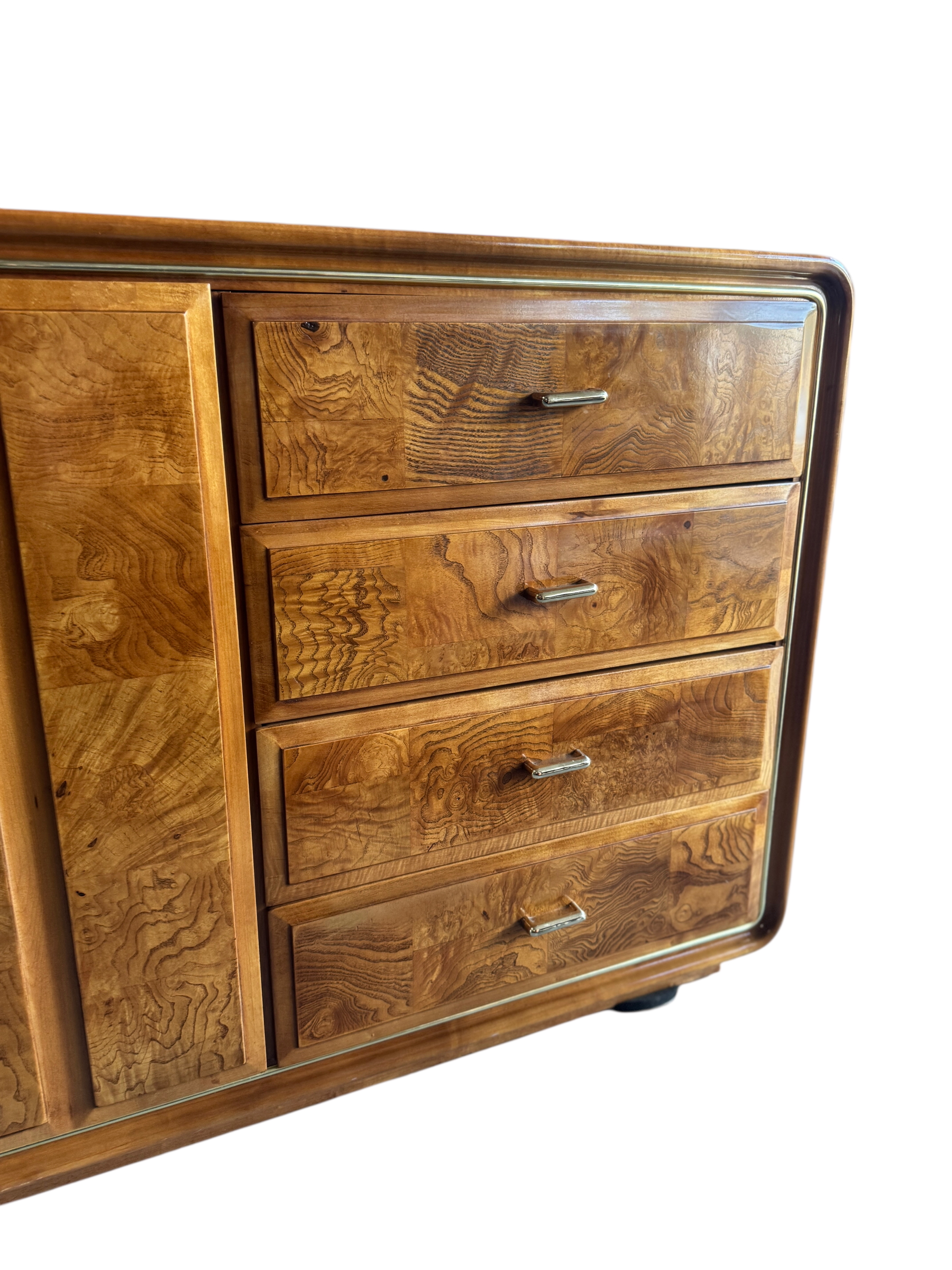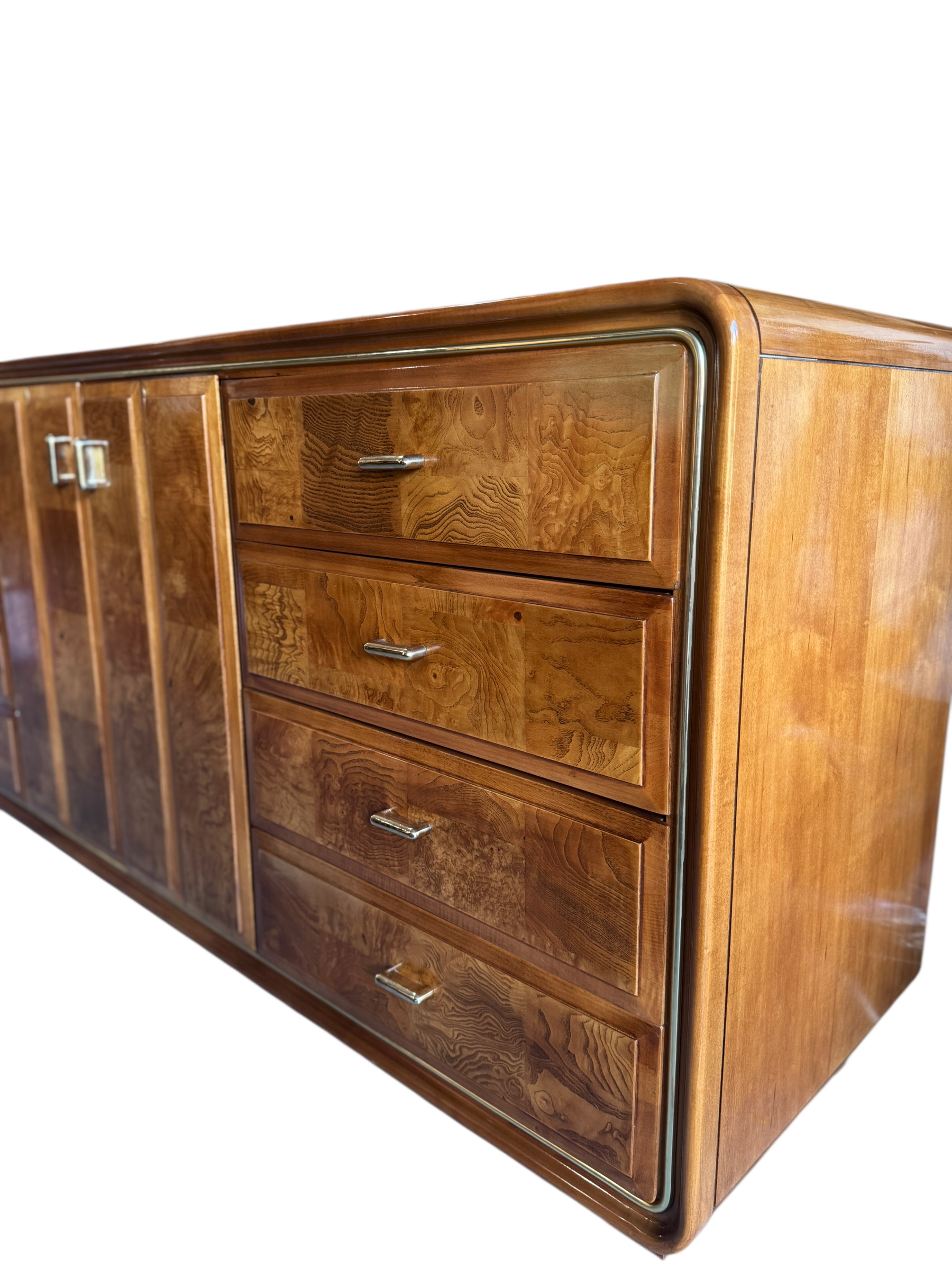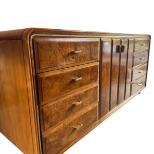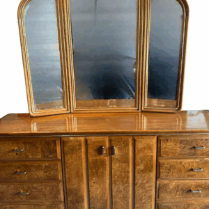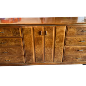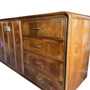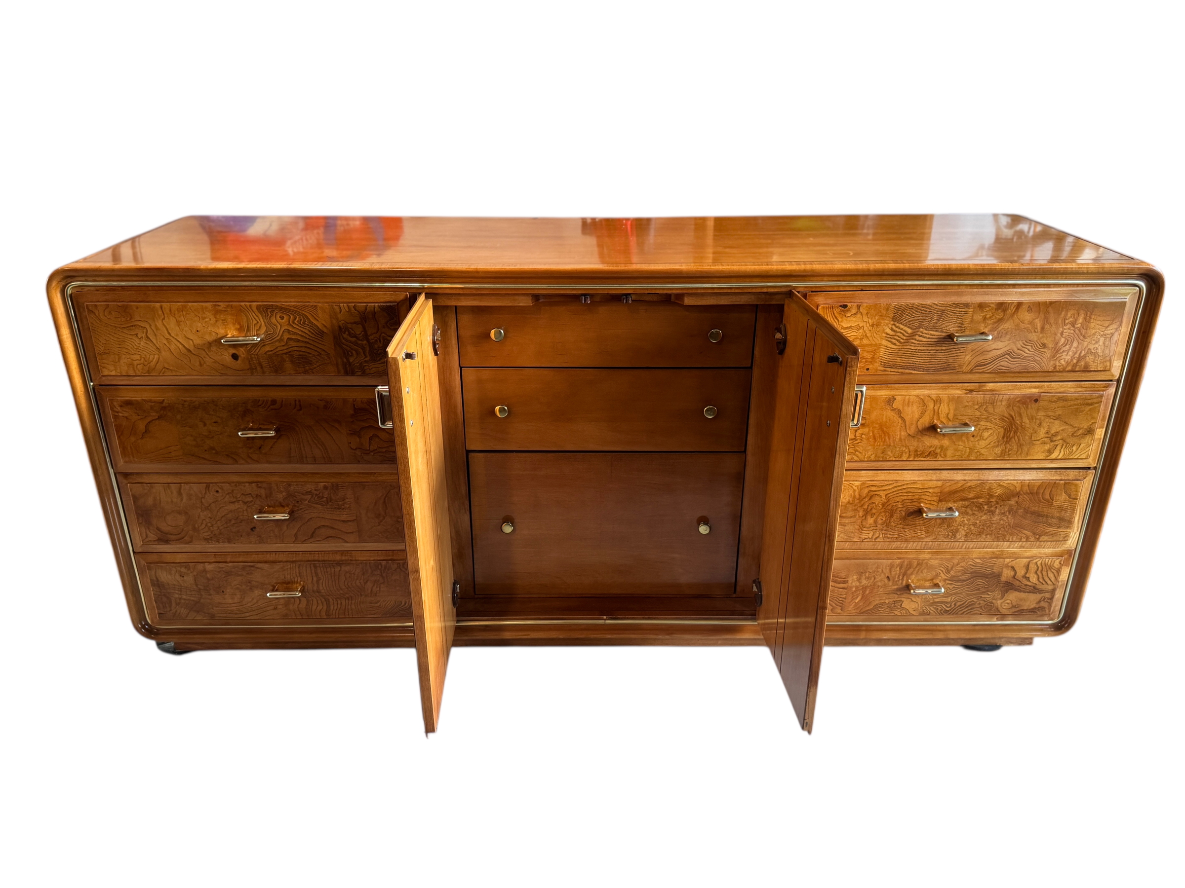 An absolute showstopper, this vintage American of Martinsville dresser set features highly figured burlwood veneer, rounded waterfall edges, and a sleek lacquered finish that gleams with warmth and richness.