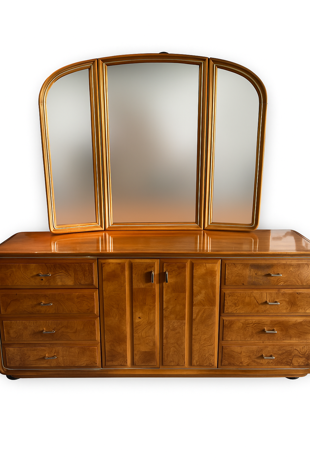 Dresser has four easy sliding drawers on each side, cabinet doors open up to reveal three central interior drawers, the bottom is a deep double drawer. The set includes a triple-panel mirror with elegant curved edges that perfectly complements the streamlined Art Deco-inspired design. Eleven spacious drawers in total provide practical storage with a dramatic visual statement.