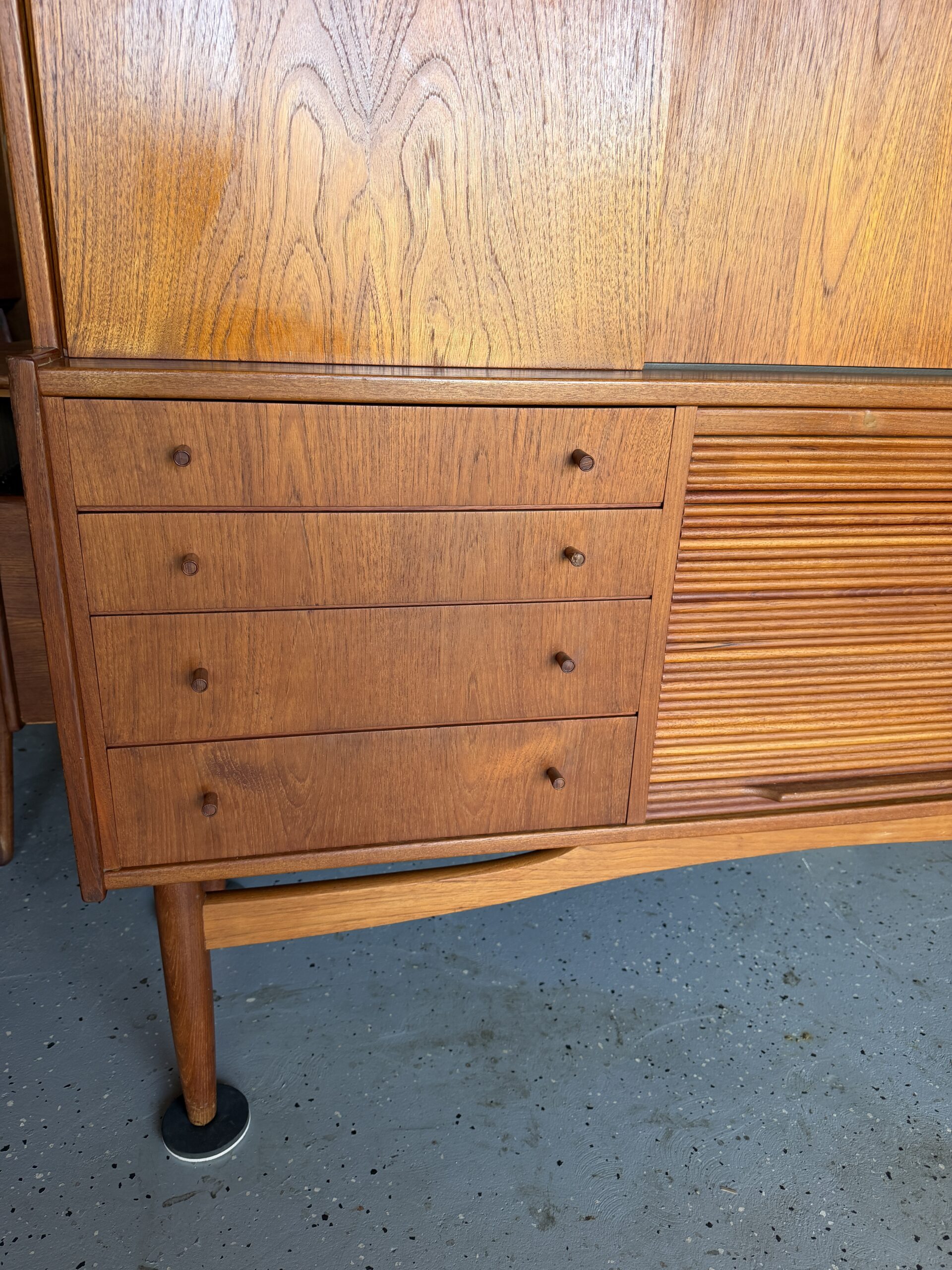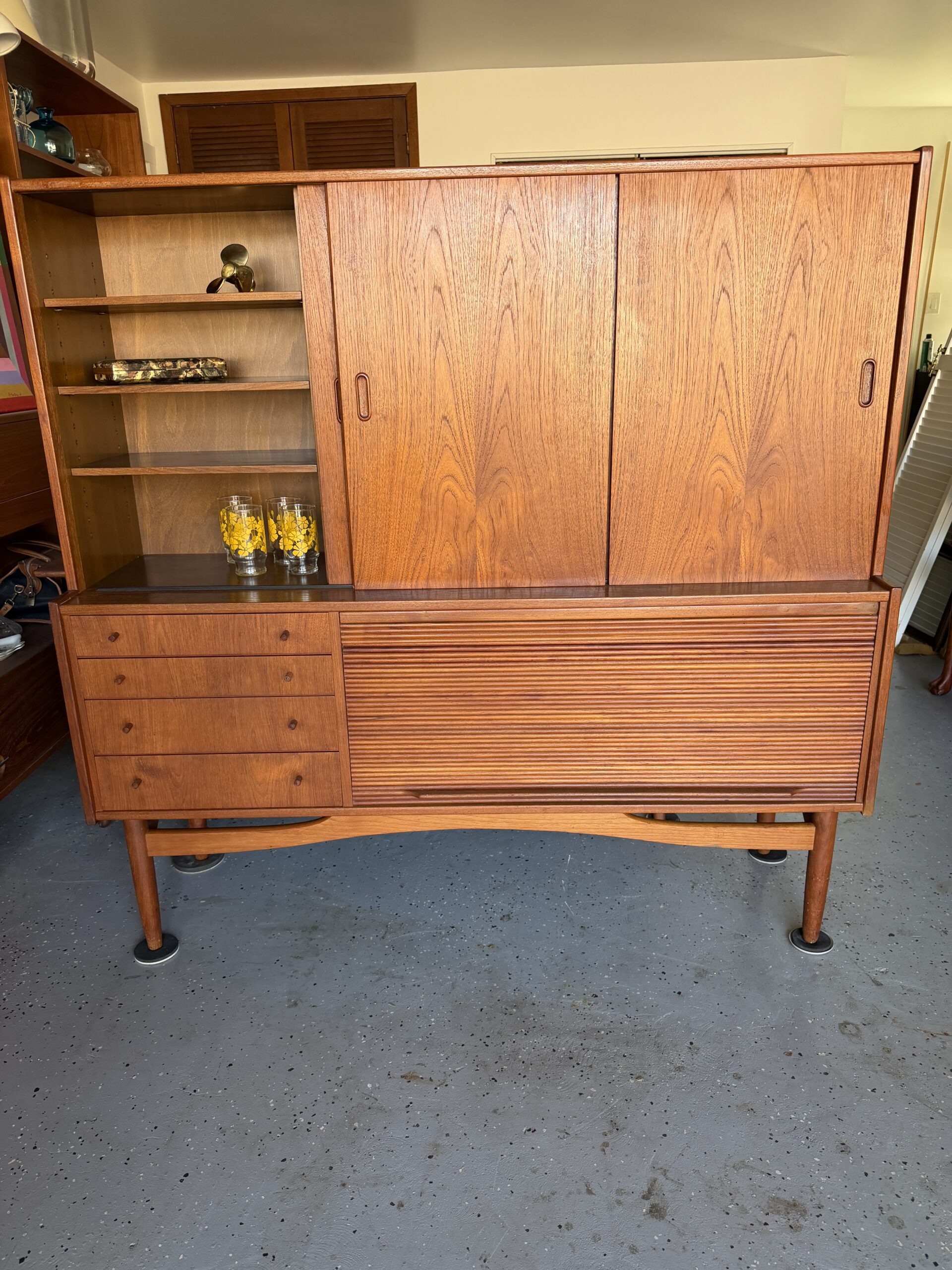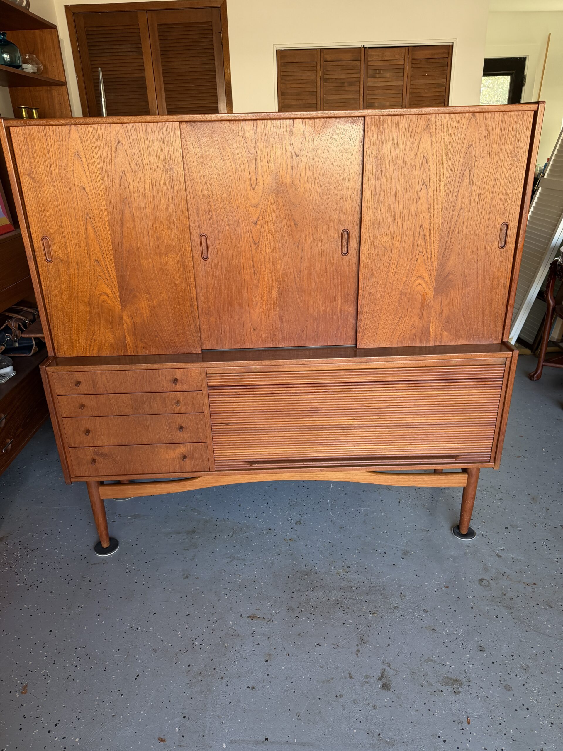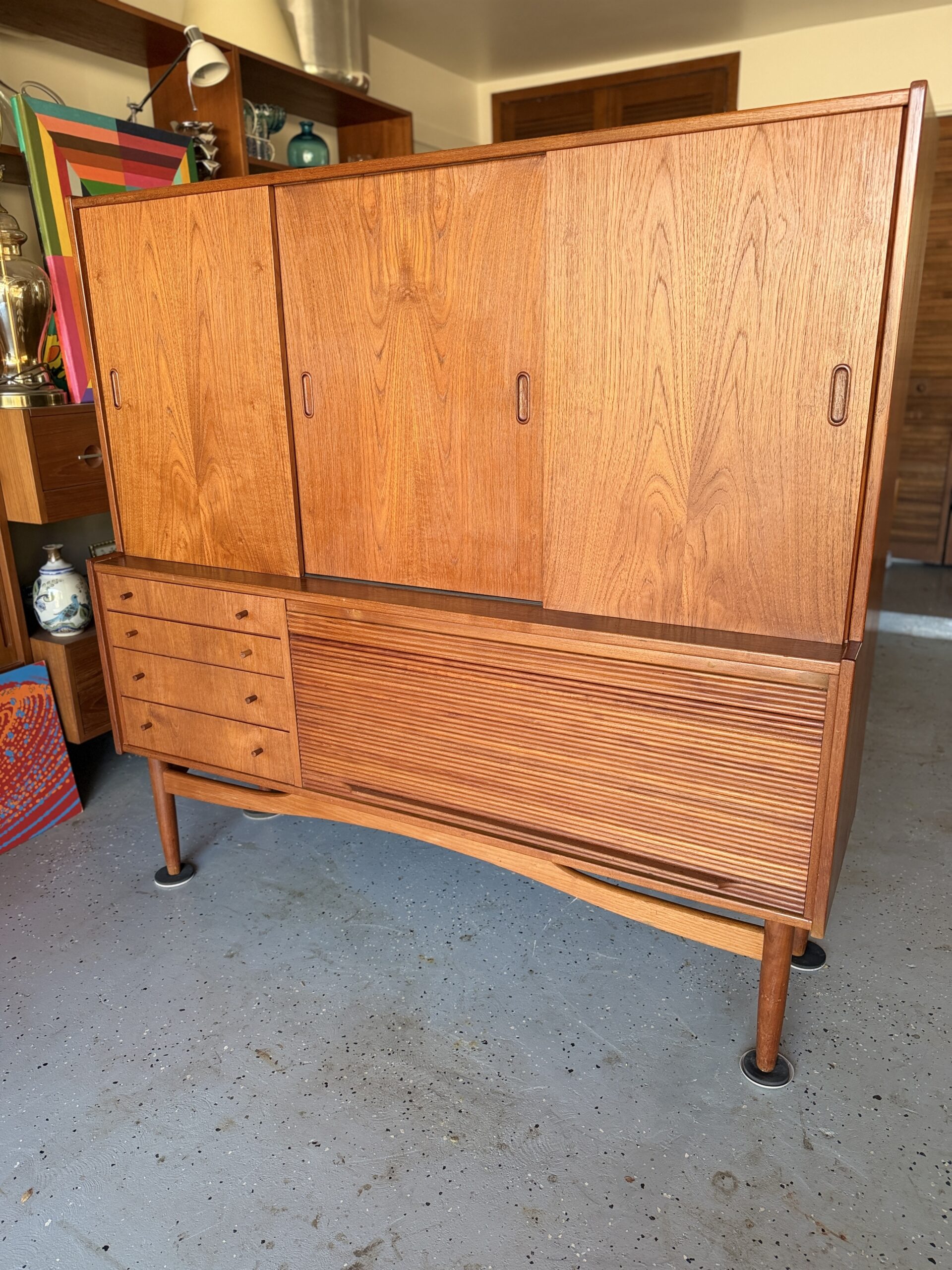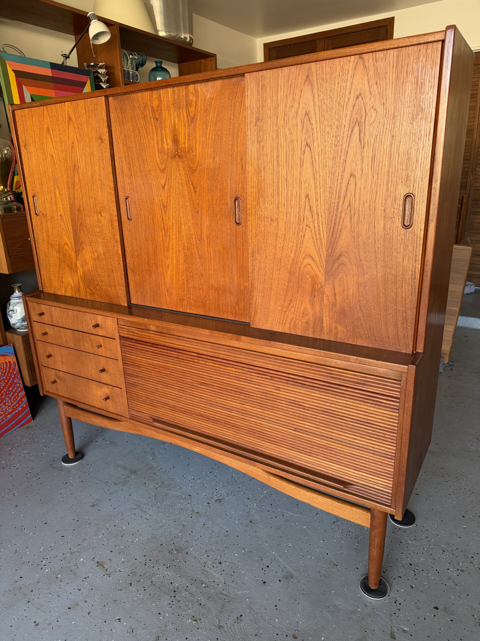 Stunning Danish Teak Highboard, loaded with storage and classic mid-century details. Gorgeous warm teak, sculpted legs, and clean mcm lines make this a standout piece for any dining room, living space, or office setup.