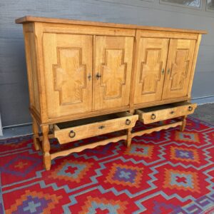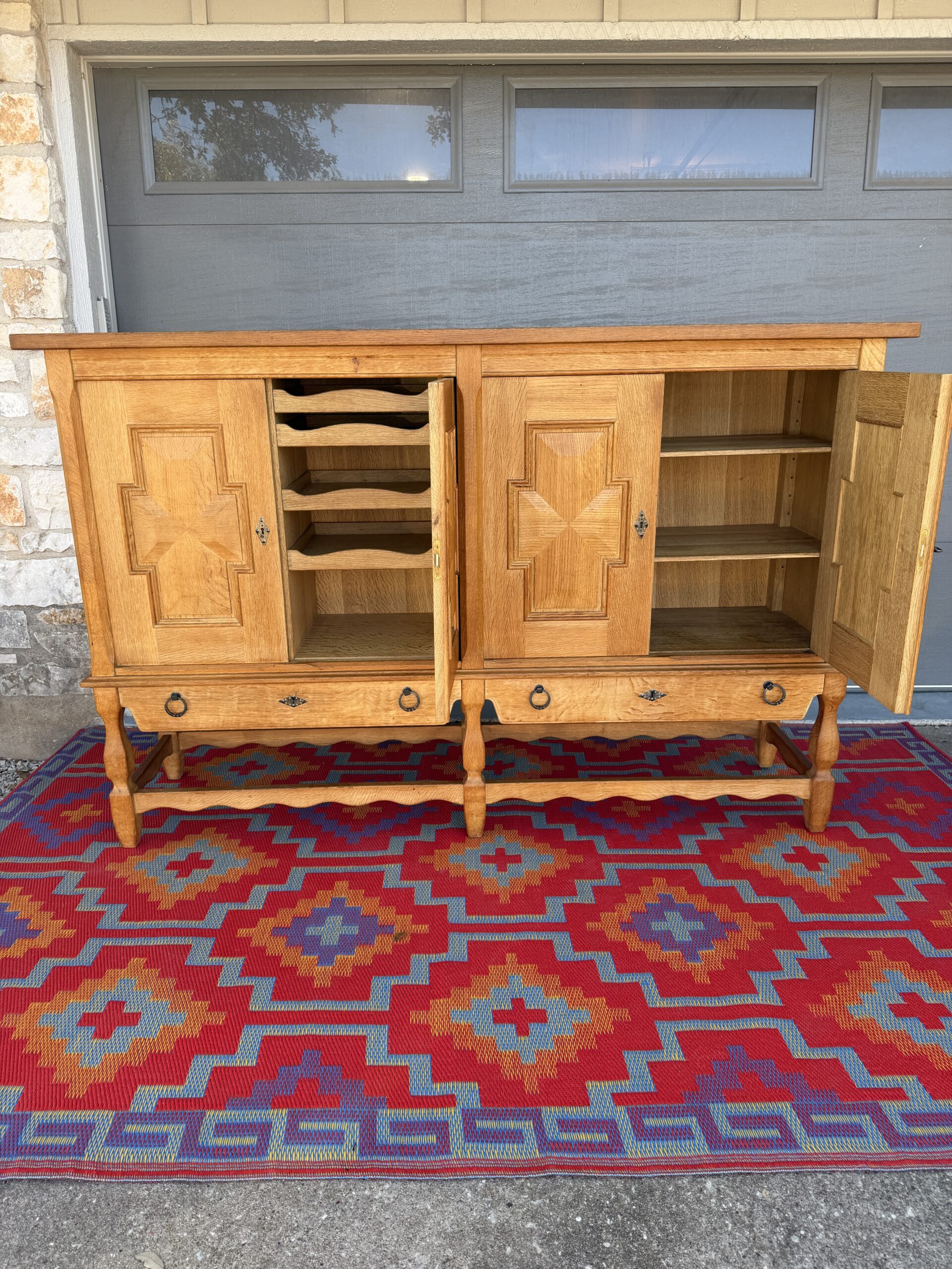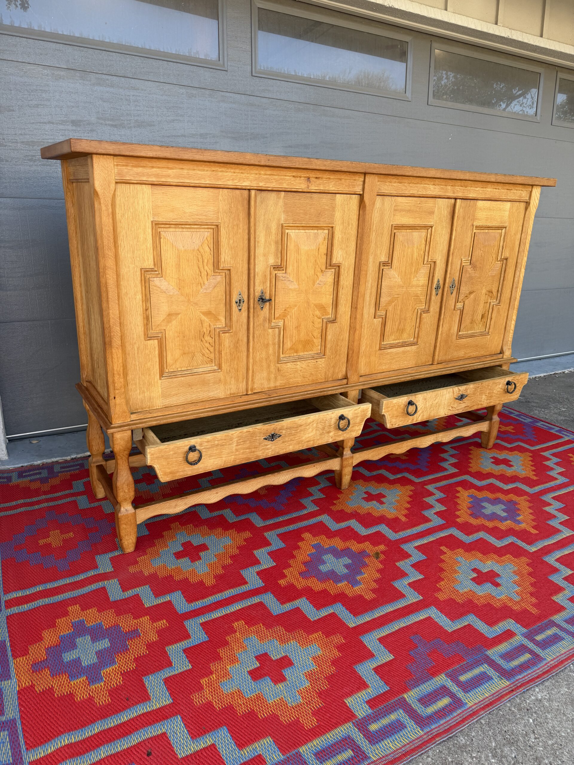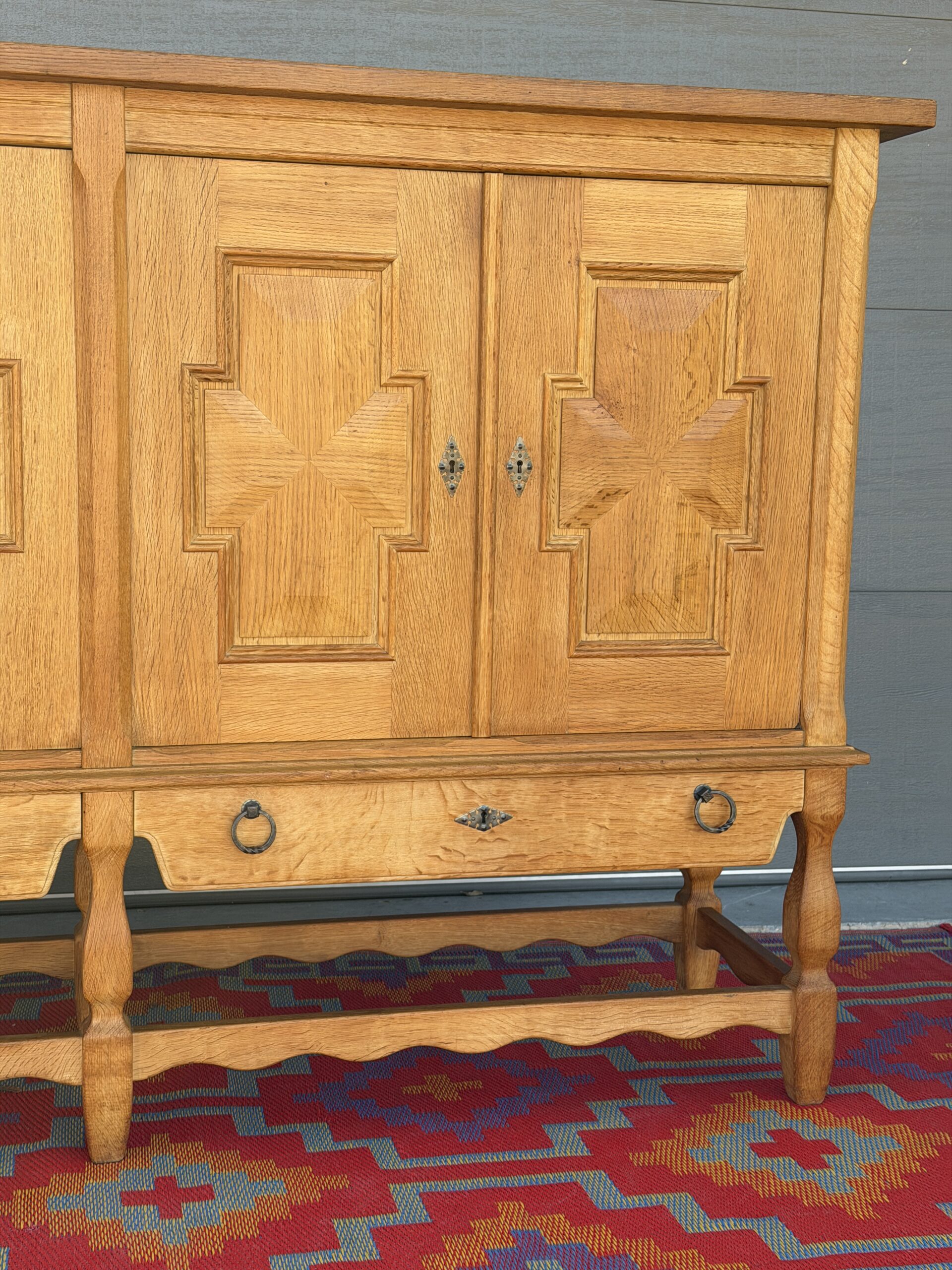 A striking Danish Oak Highboard attributed to Henning Kjaernulf, known for his bold panel detailing and exceptional Scandinavian craftsmanship. This substantial piece offers generous storage while maintaining an elegant, architectural presence—perfect for a dining room, living space, or statement storage piece.