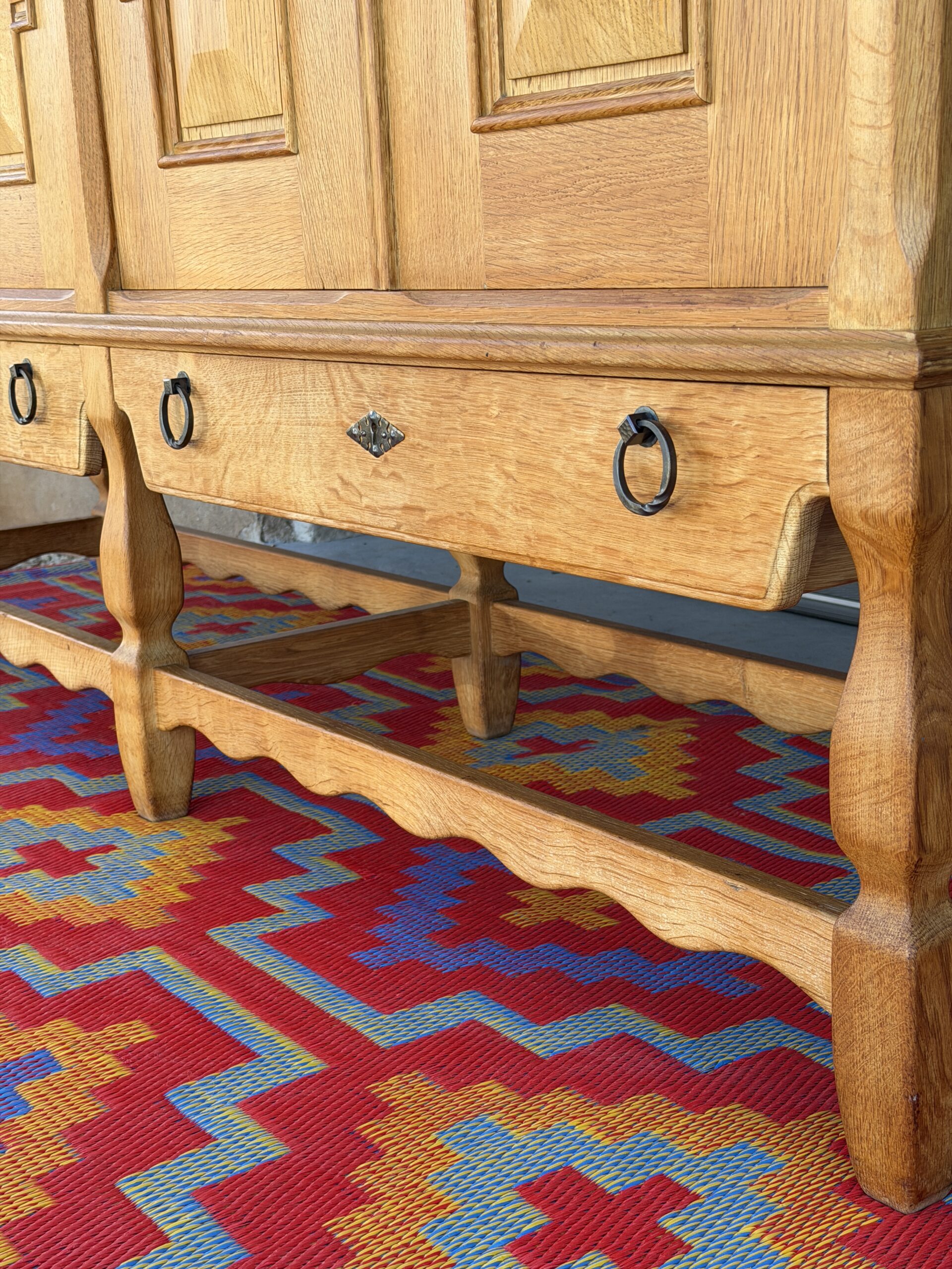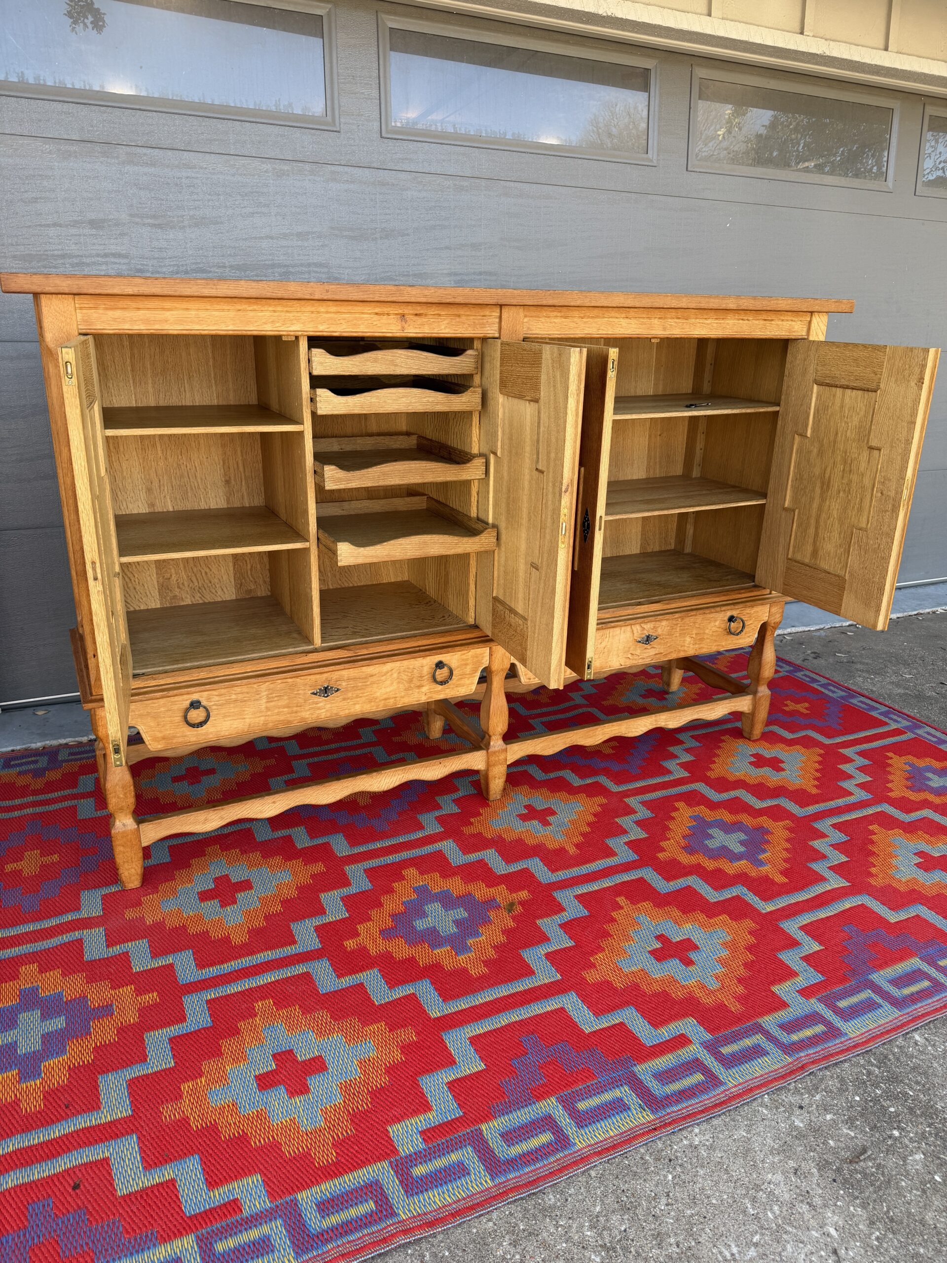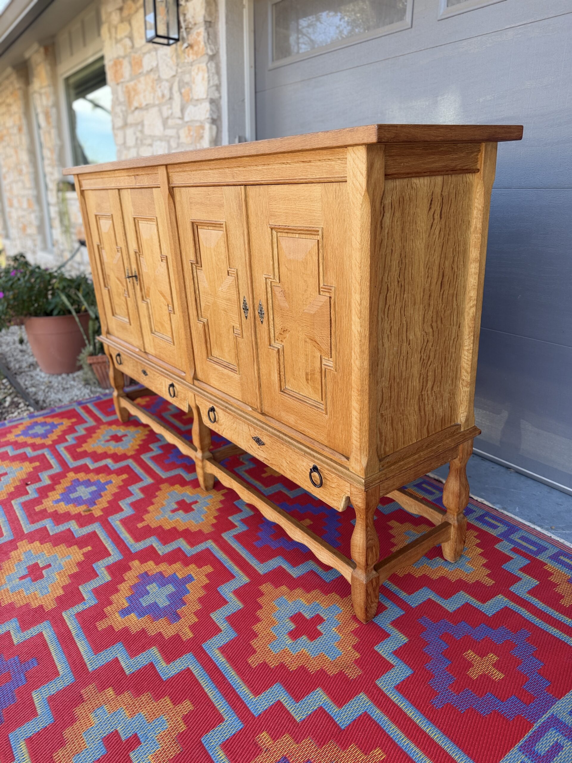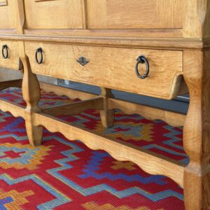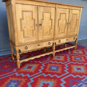 A striking Danish Oak Highboard attributed to Henning Kjaernulf, known for his bold panel detailing and exceptional Scandinavian craftsmanship. This substantial piece offers generous storage while maintaining an elegant, architectural presence—perfect for a dining room, living space, or statement storage piece.