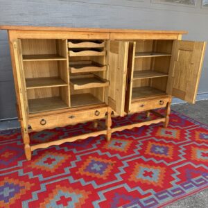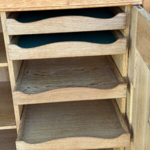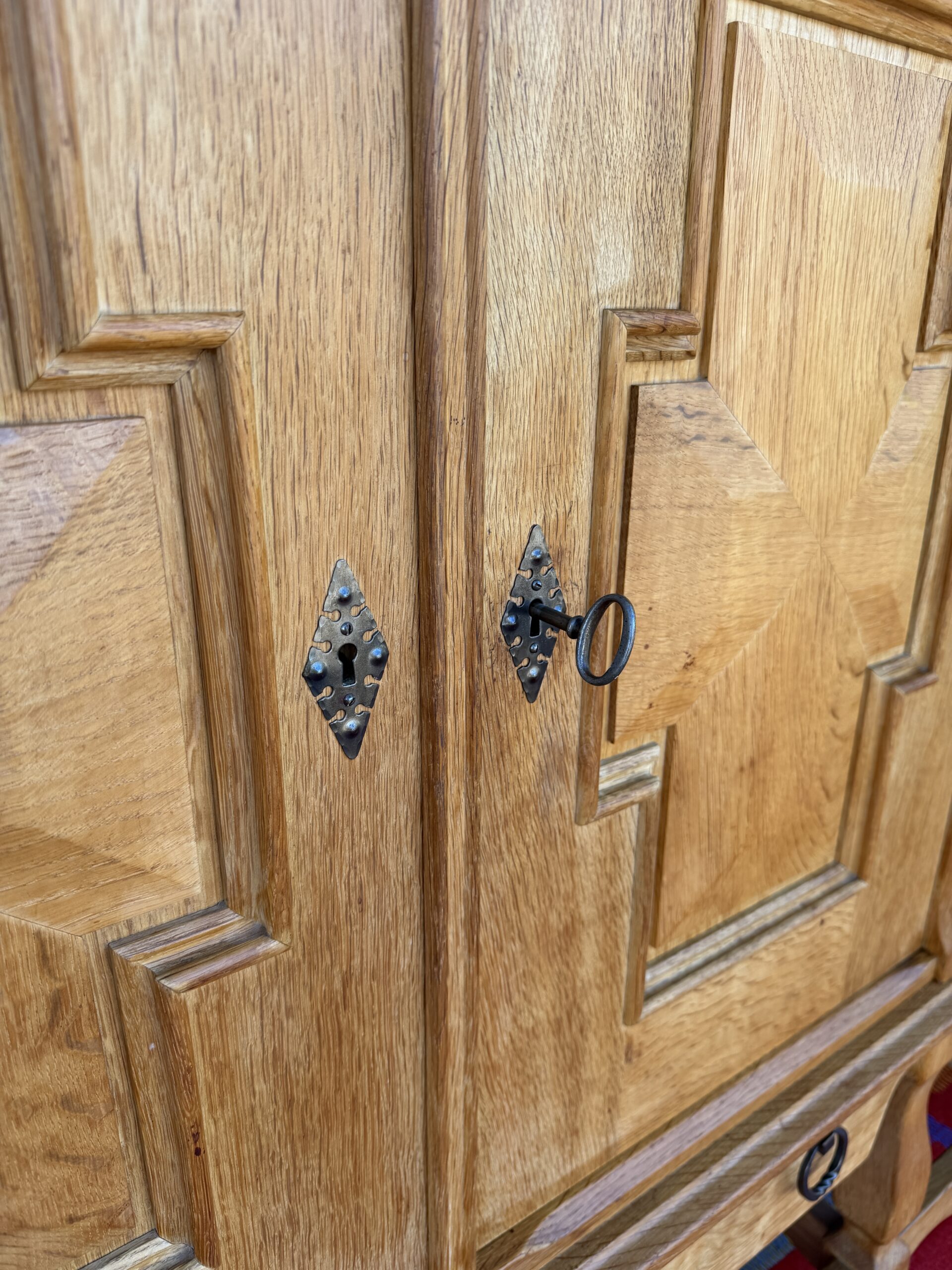 Behind the cabinet doors are 4 adjustable shelves and 4 sliding drawers. The upper cupboard doors lock with the original key, as do the two lower wooden drawers, adding both charm and function. Raised on sturdy legs with a scalloped stretcher base, this tallboard balances visual lightness with solid construction.