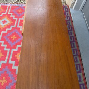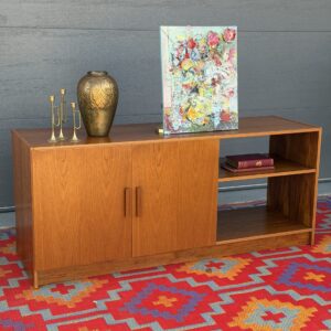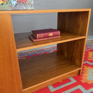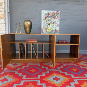 A beautiful Danish teak record cabinet featuring clean lines, a beautiful teak glow and a highly functional layout for vinyl or media storage. The interior includes vertical dividers sized perfectly for records, while the right-hand side offers open shelving with one adjustable shelf—ideal for books, components, or additional storage.