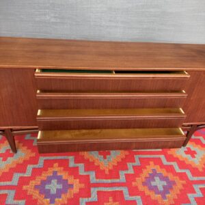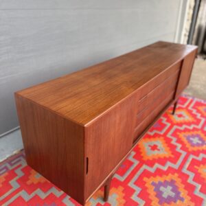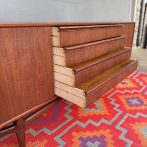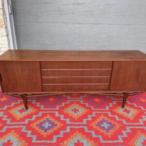 This beautiful dark teak sideboard is on the longer side and sits atop distinct sculptured legs.