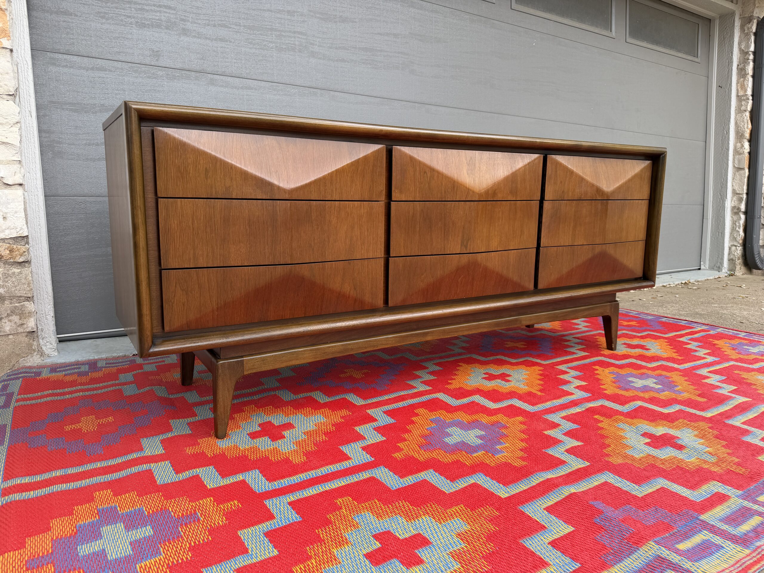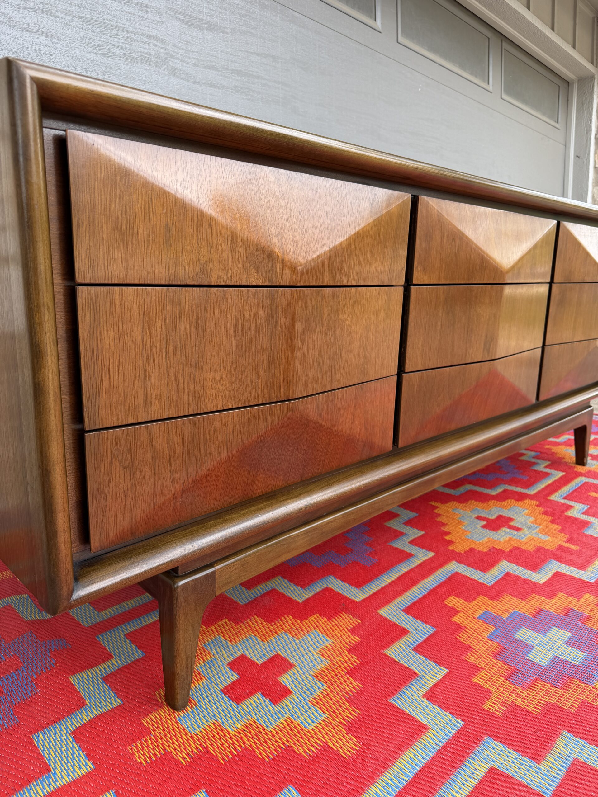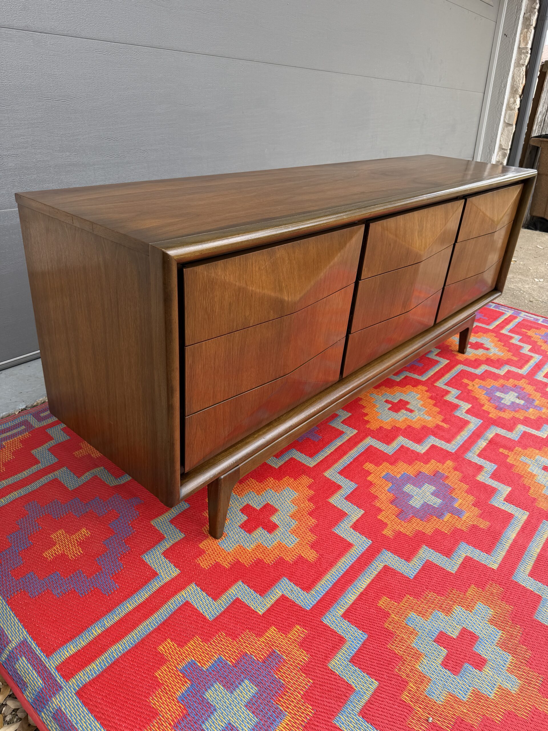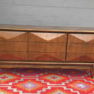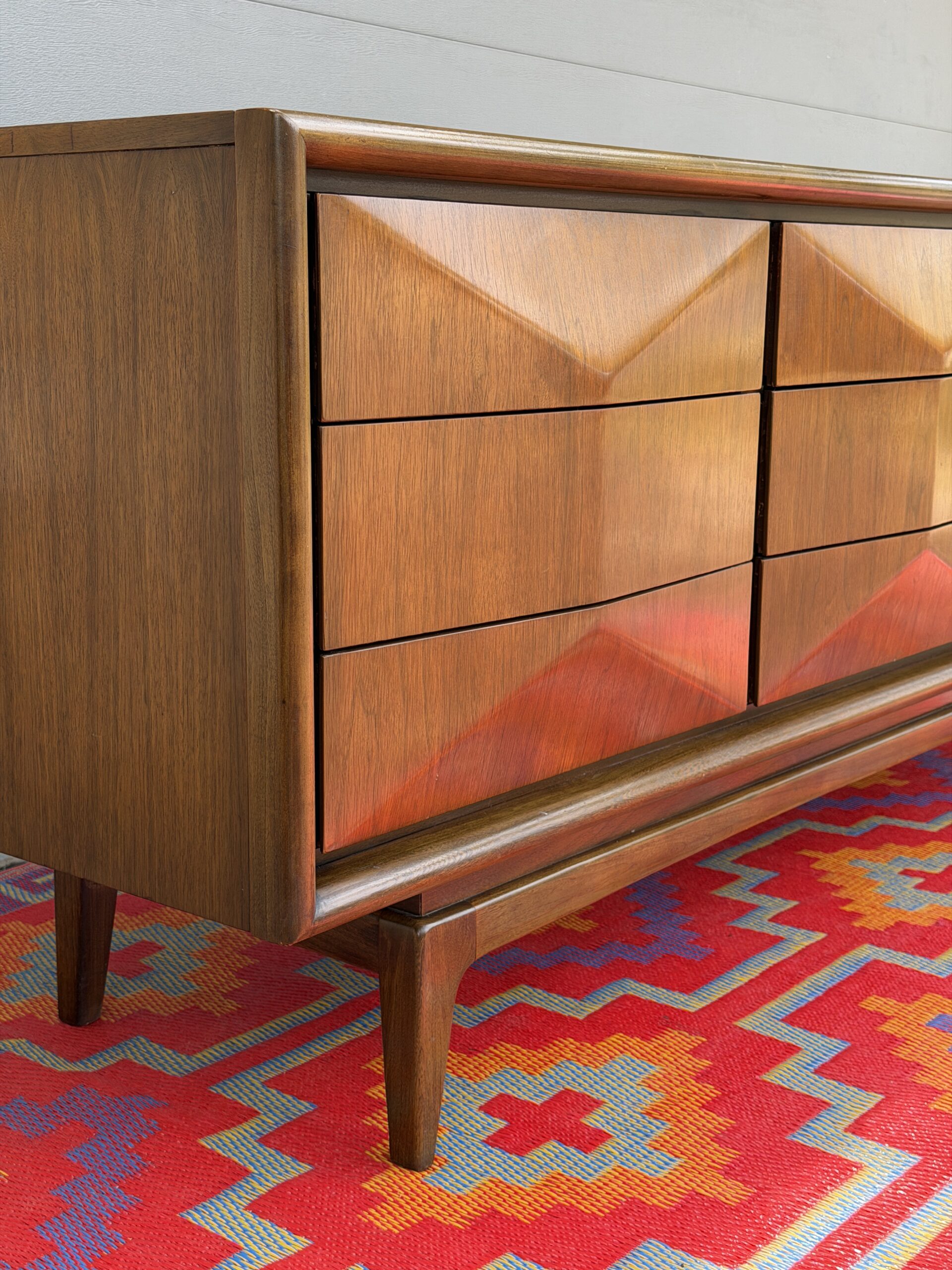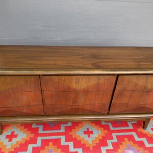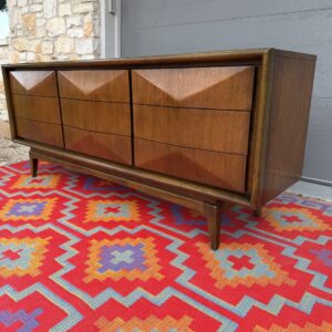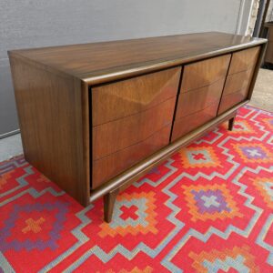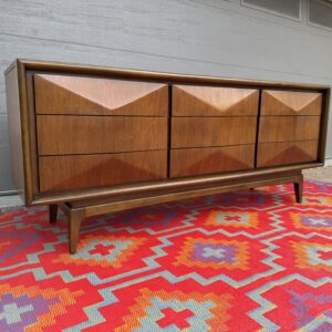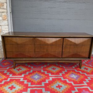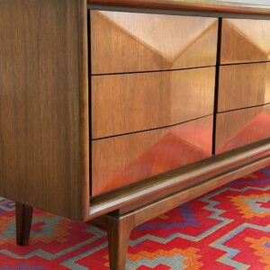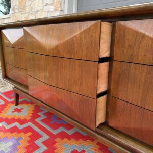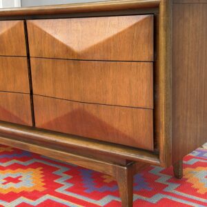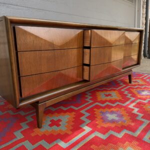 Absolutely stunning mid-century modern lowboy dresser by United Furniture Co., featuring the highly sought-after diamond sculpted drawer fronts—a signature detail that adds depth, texture, and visual interest from every angle.