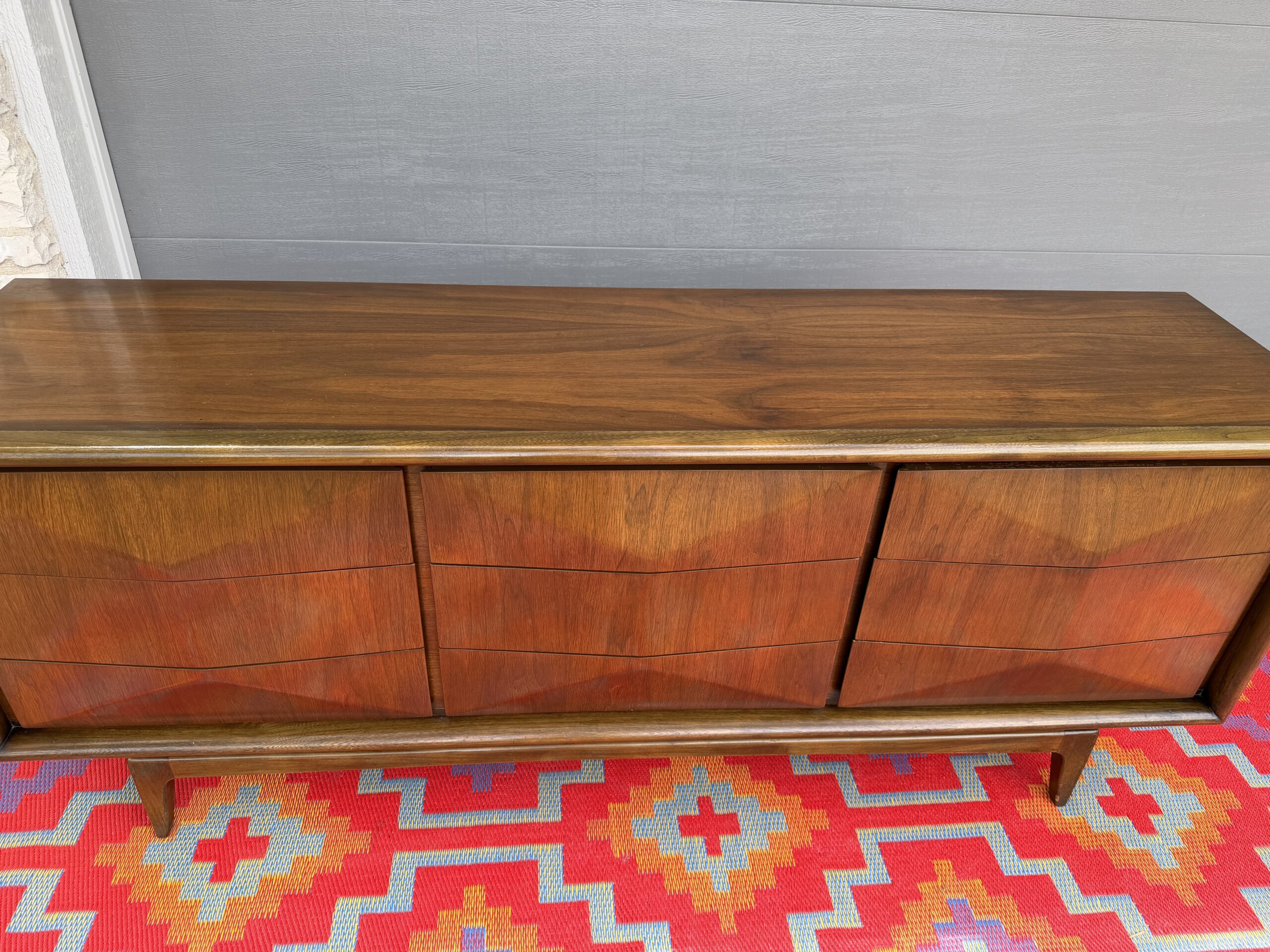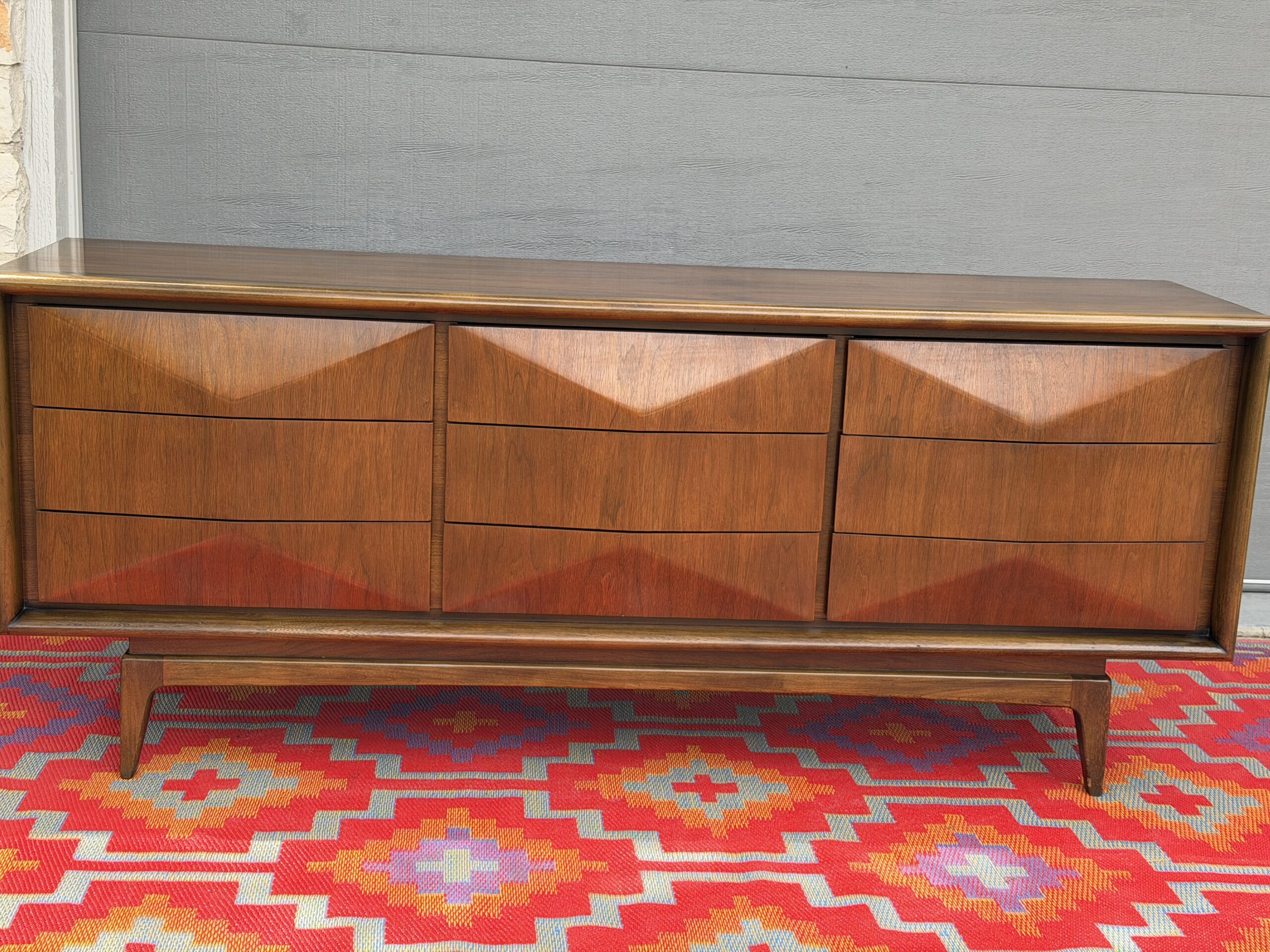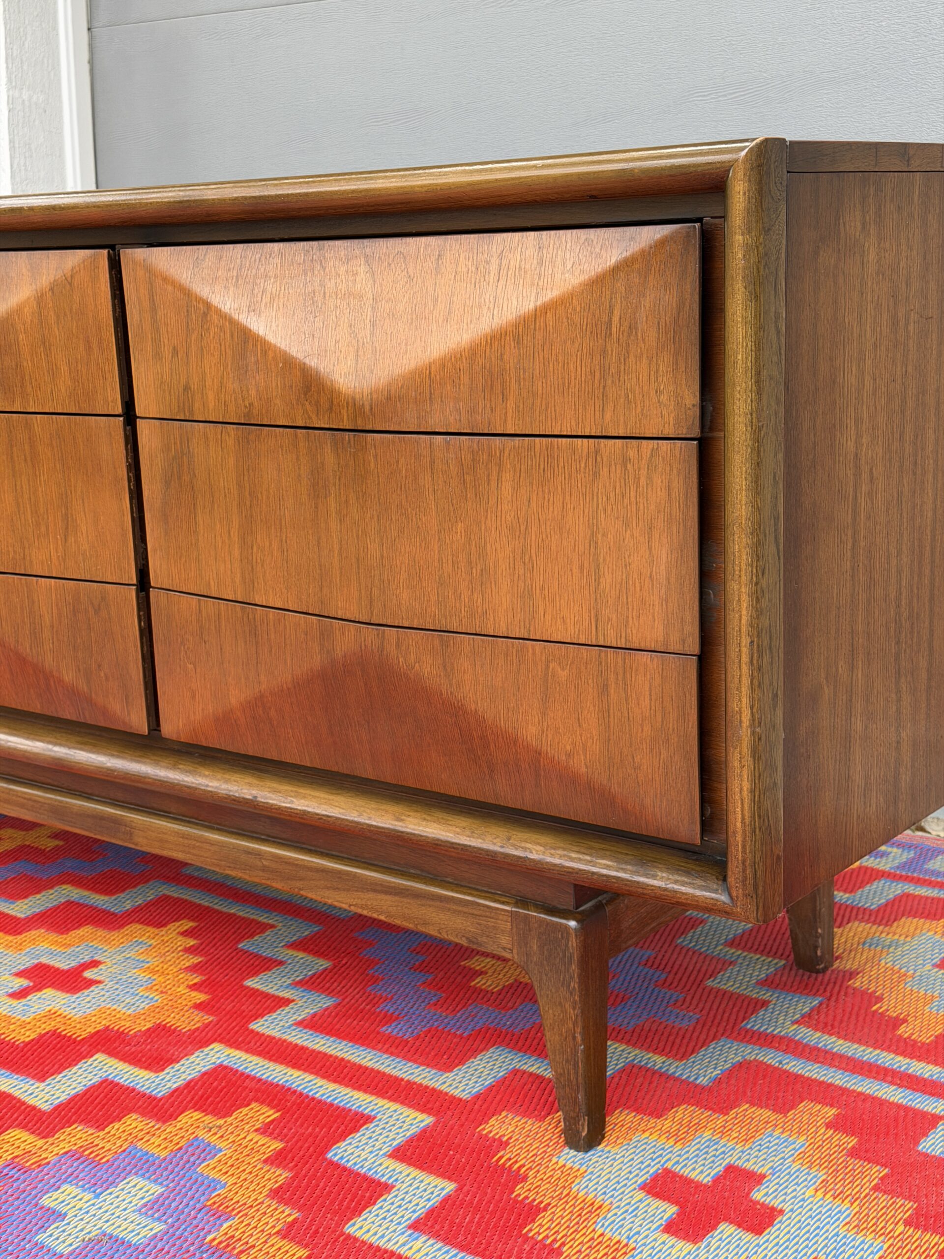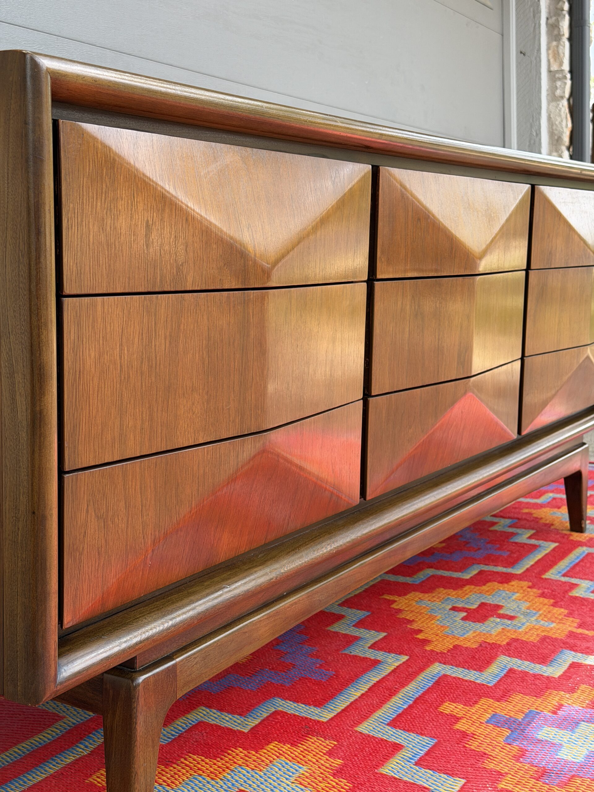 Absolutely stunning mid-century modern lowboy dresser by United Furniture Co., featuring the highly sought-after diamond sculpted drawer fronts—a signature detail that adds depth, texture, and visual interest from every angle.