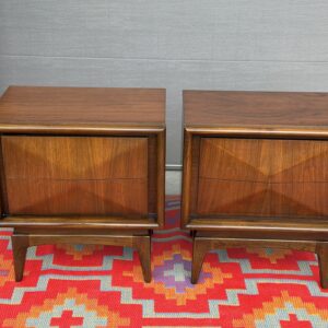 A standout pair of mid-century modern nightstands by United Furniture, featuring their iconic diamond-pattern drawer fronts paired with a beautifully sculpted base.