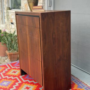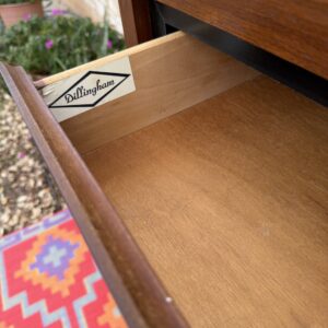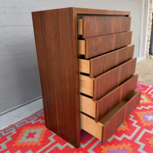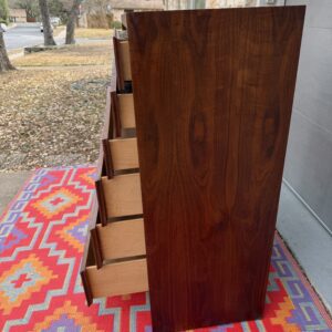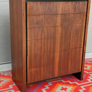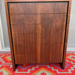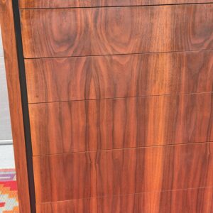 Vintage Dillingham tallboy dresser featuring stunning book-matched wood grain across the drawer fronts. This piece has such a strong mid-century presence with its clean lines, rich tone, and beautiful natural grain pattern that flows seamlessly from drawer to drawer.