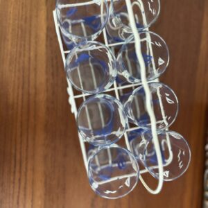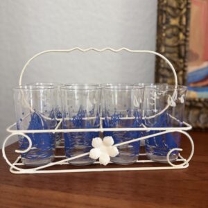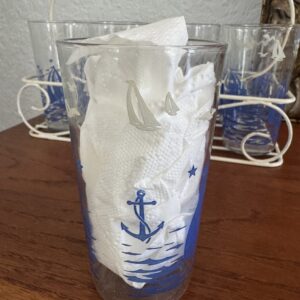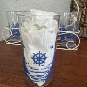 Eight nautical themed vintage juice glasses in a wire caddy.