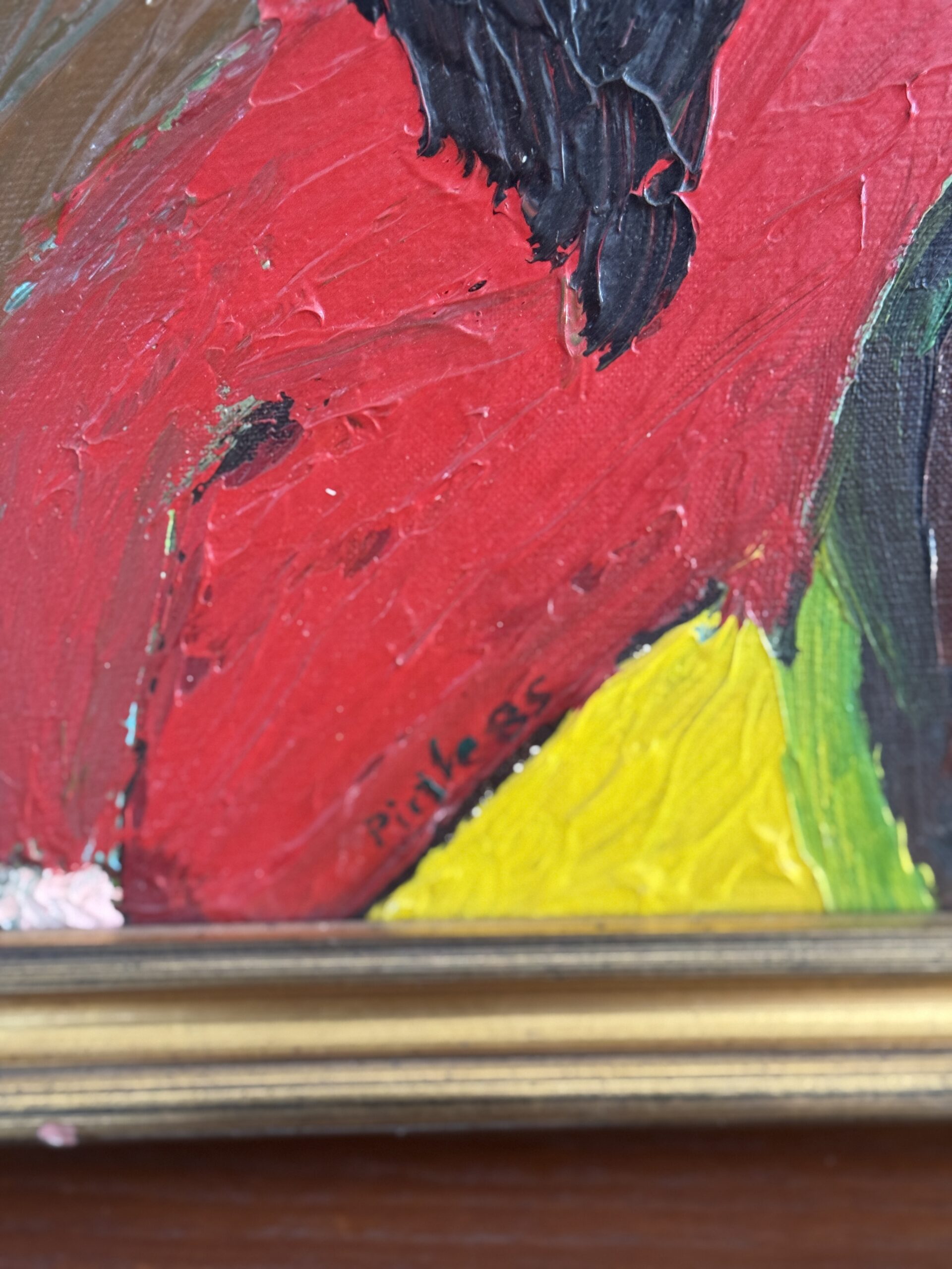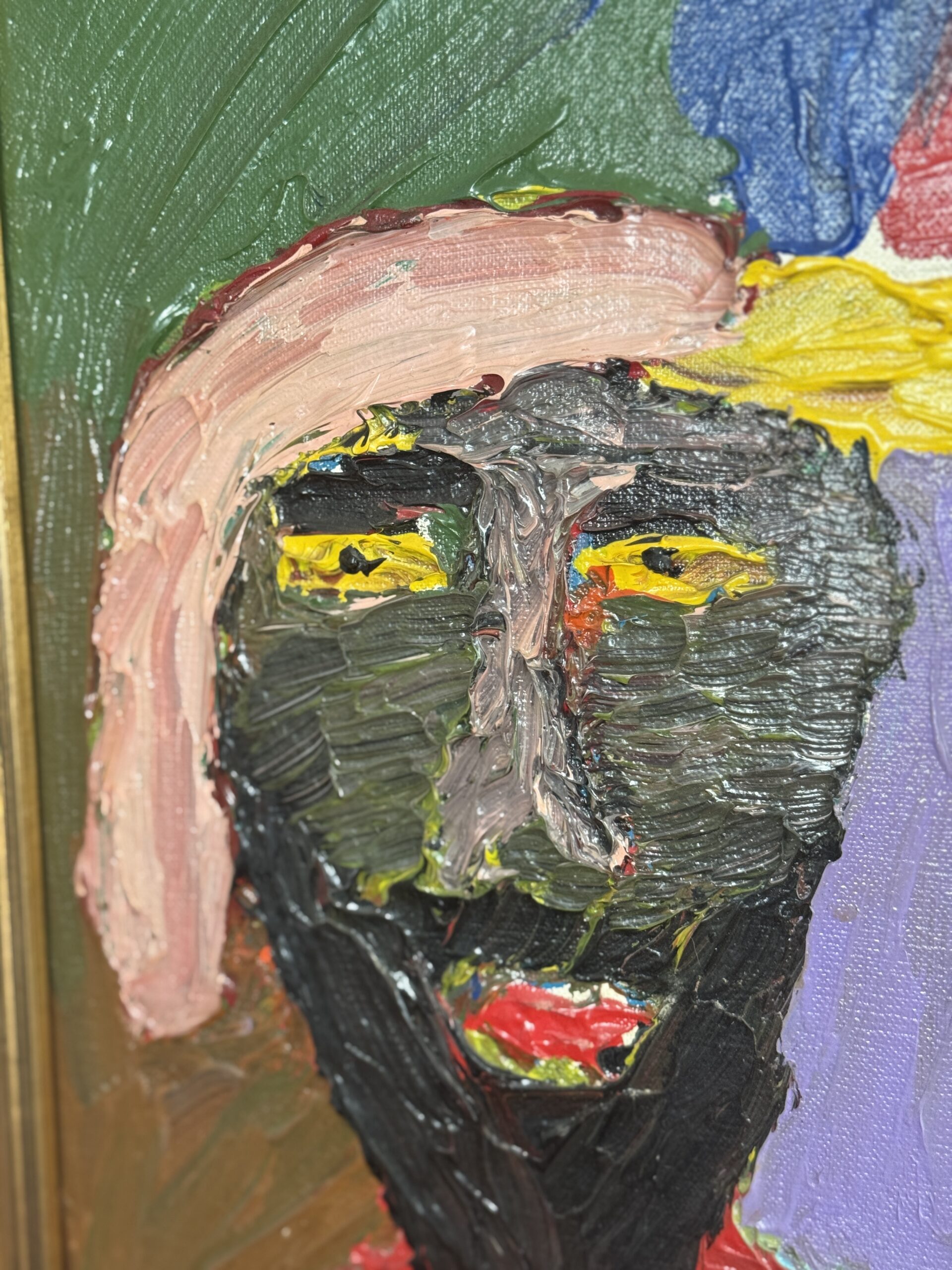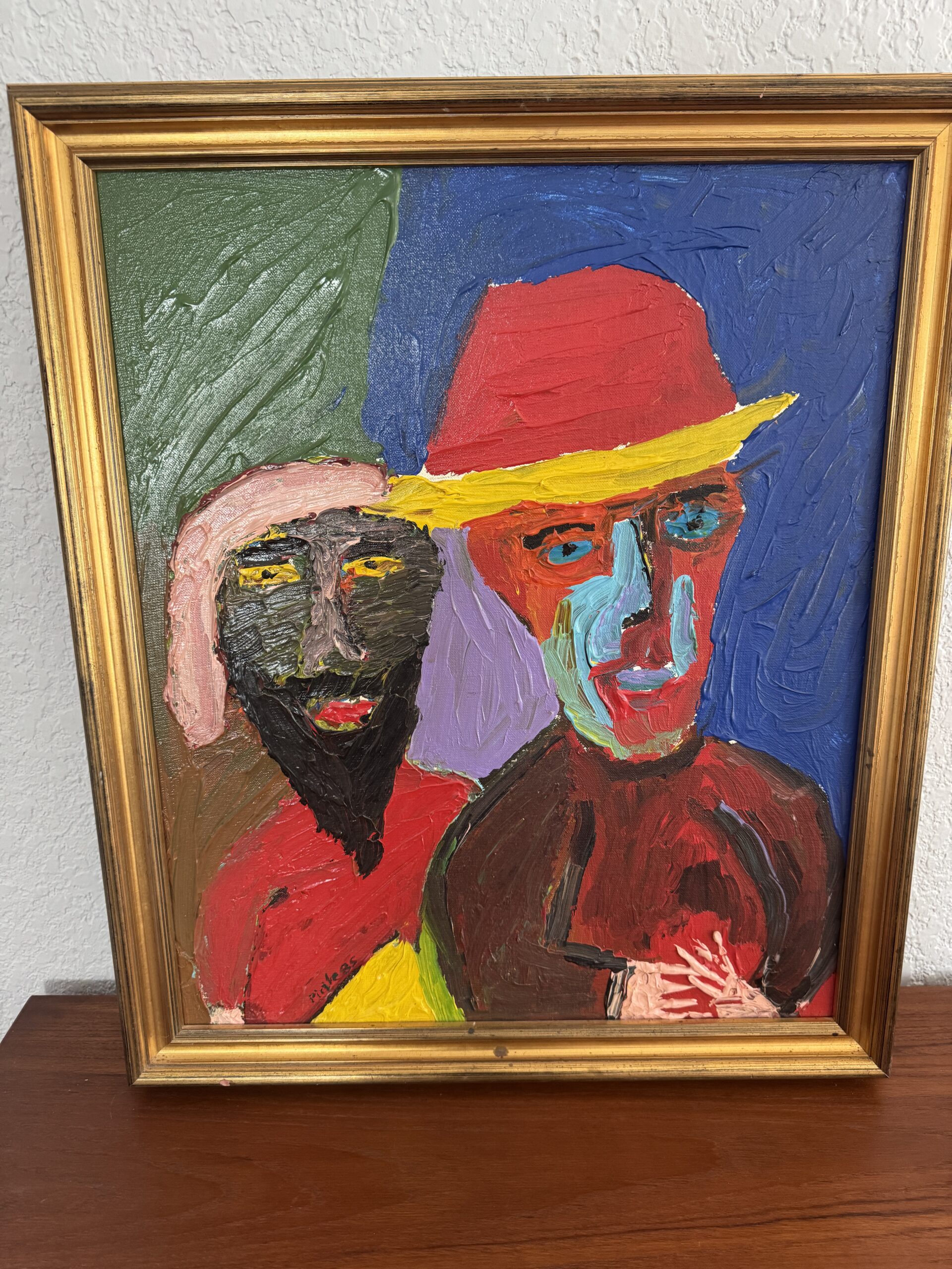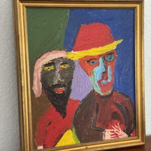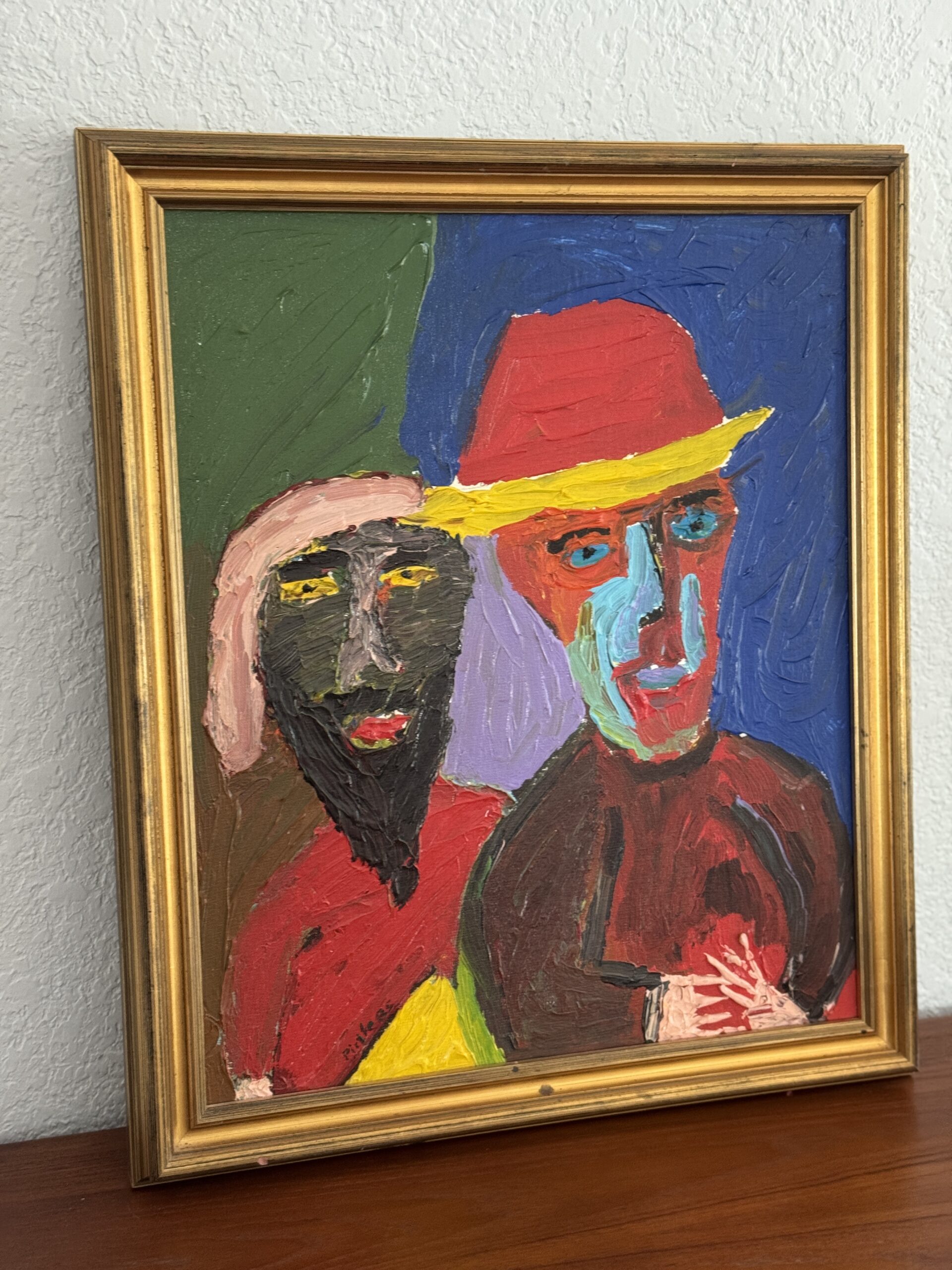Make a statement with this striking, heavily textured, signed oil painting. Featuring two portrait figures in vibrant reds, blues, greens, and yellows, this piece captures the energy of mid-century expressionist style. Thick brushstrokes and bold color blocking add depth and presence, perfect for adding personality to any space.