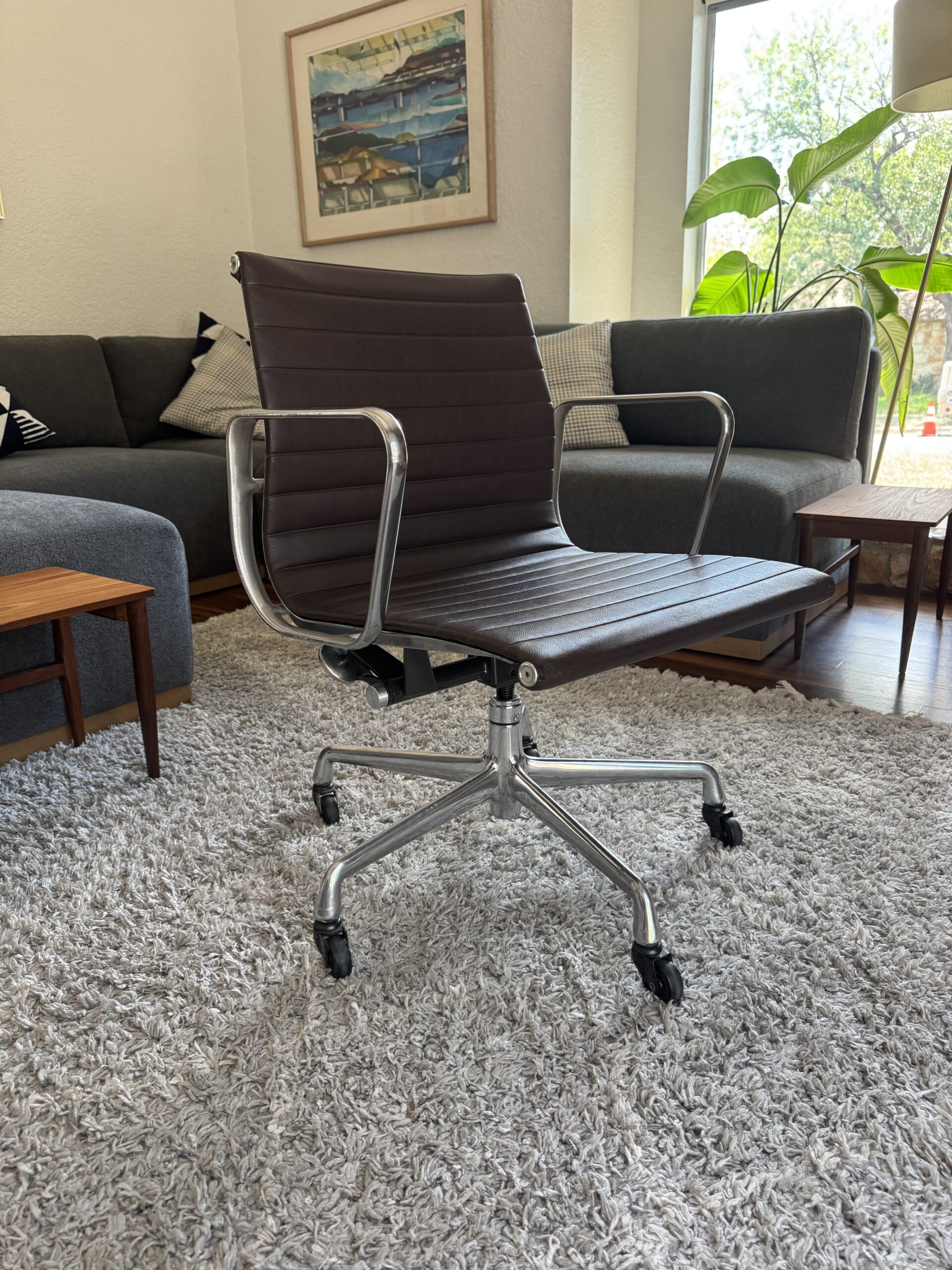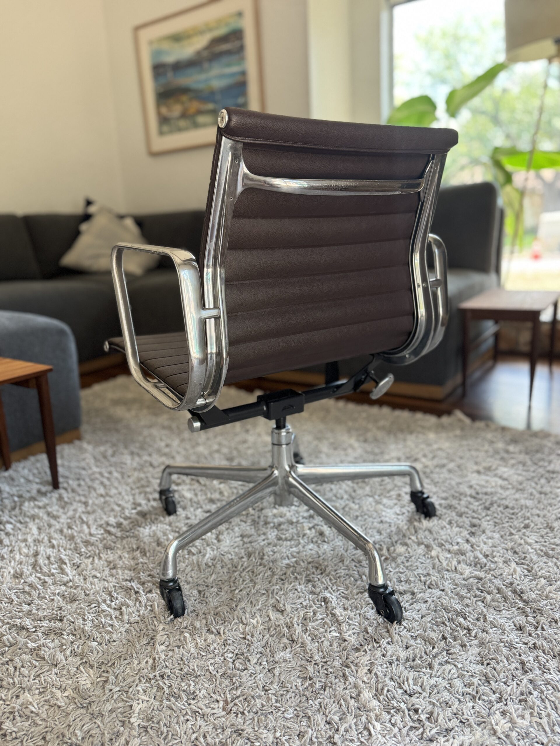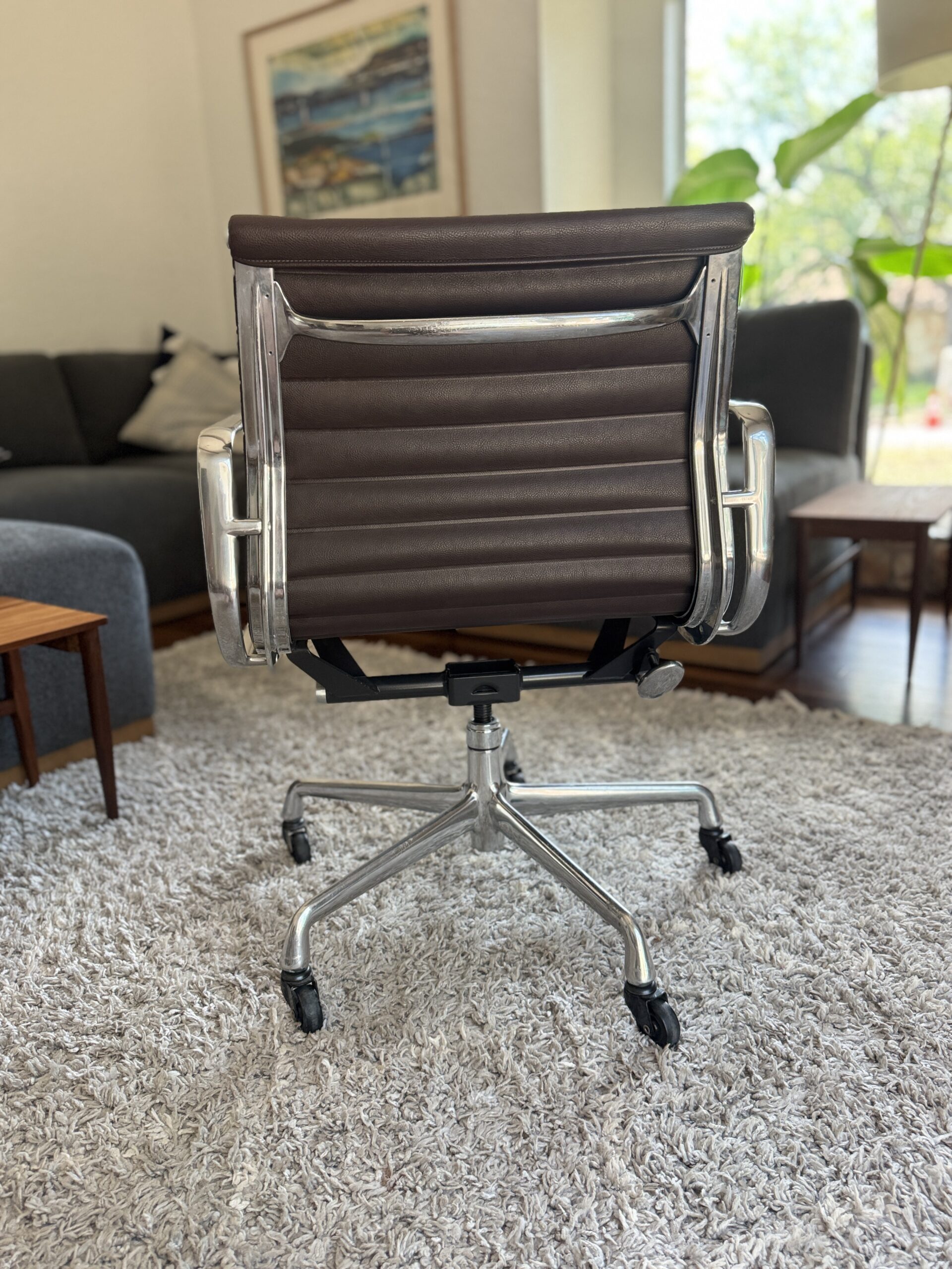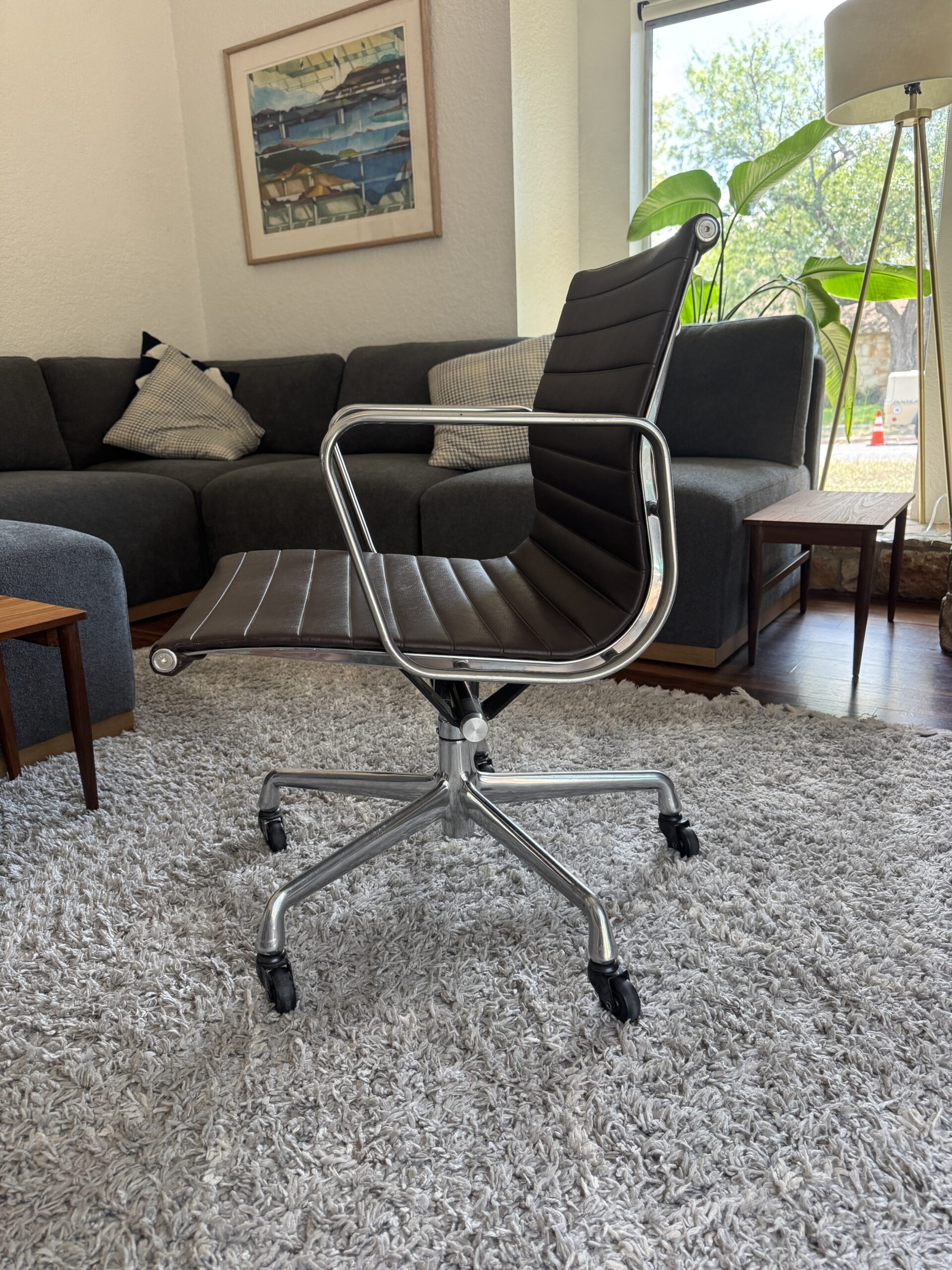 A timeless piece of mid-century design, this authentic Herman Miller Eames Aluminum Group Management Chair is finished in supple dark brown leather with a polished aluminum frame. Designed for comfort and style, it features ribbed leather upholstery, a swivel base, and smooth casters for easy movement.