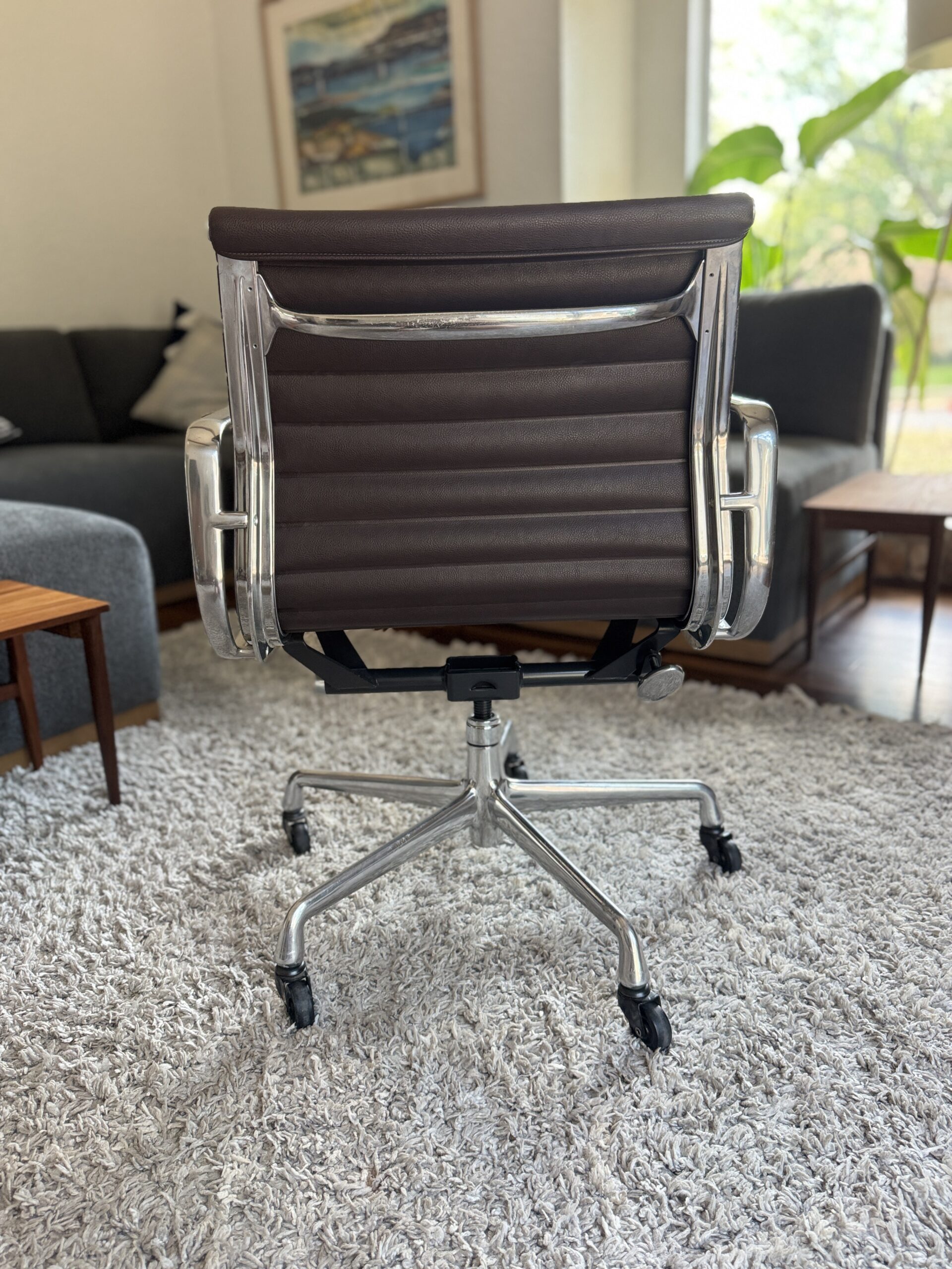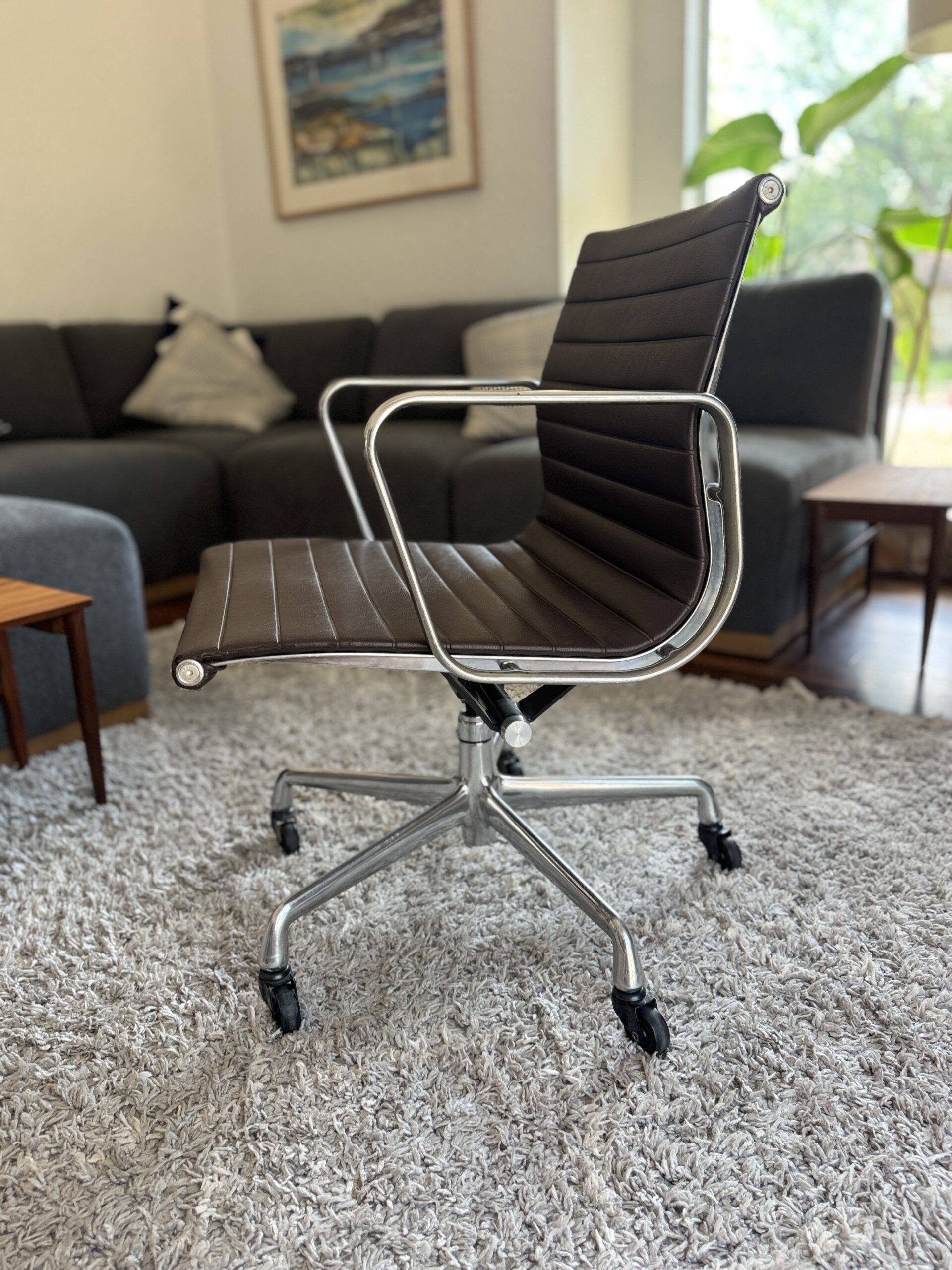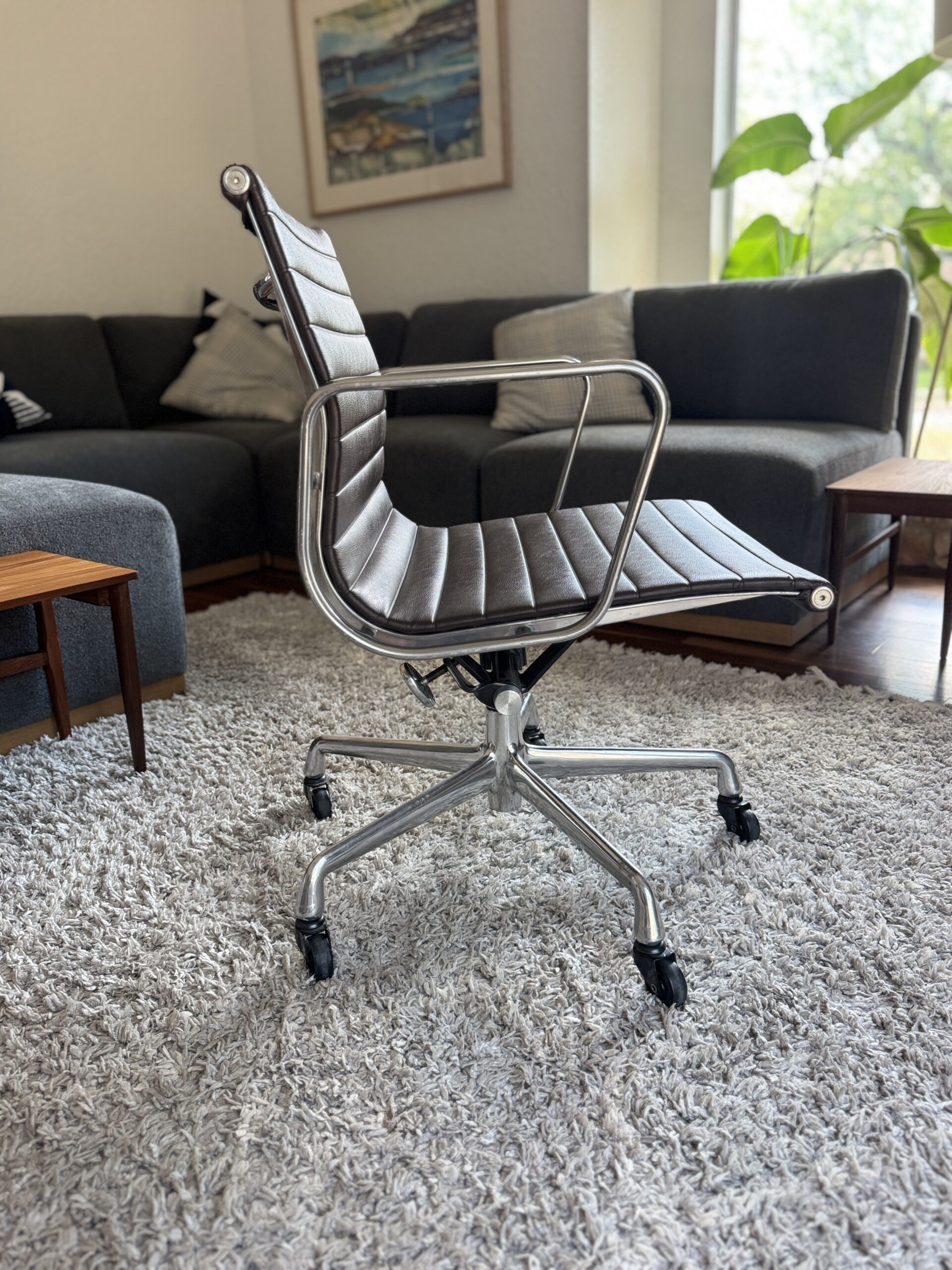 A timeless piece of mid-century design, this authentic Herman Miller Eames Aluminum Group Management Chair is finished in supple dark brown leather with a polished aluminum frame. Designed for comfort and style, it features ribbed leather upholstery, a swivel base, and smooth casters for easy movement.