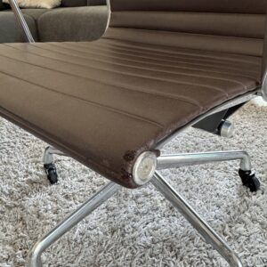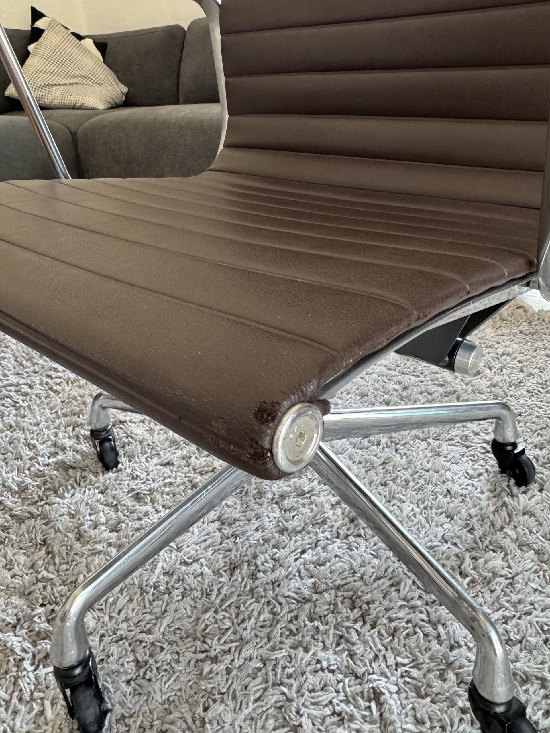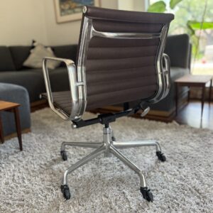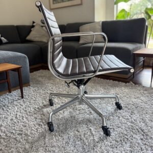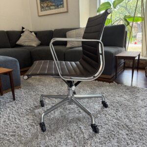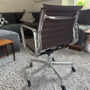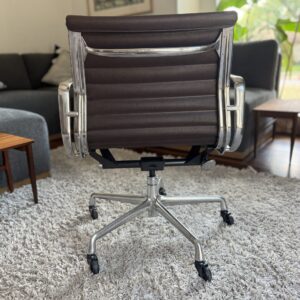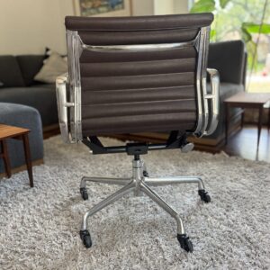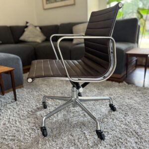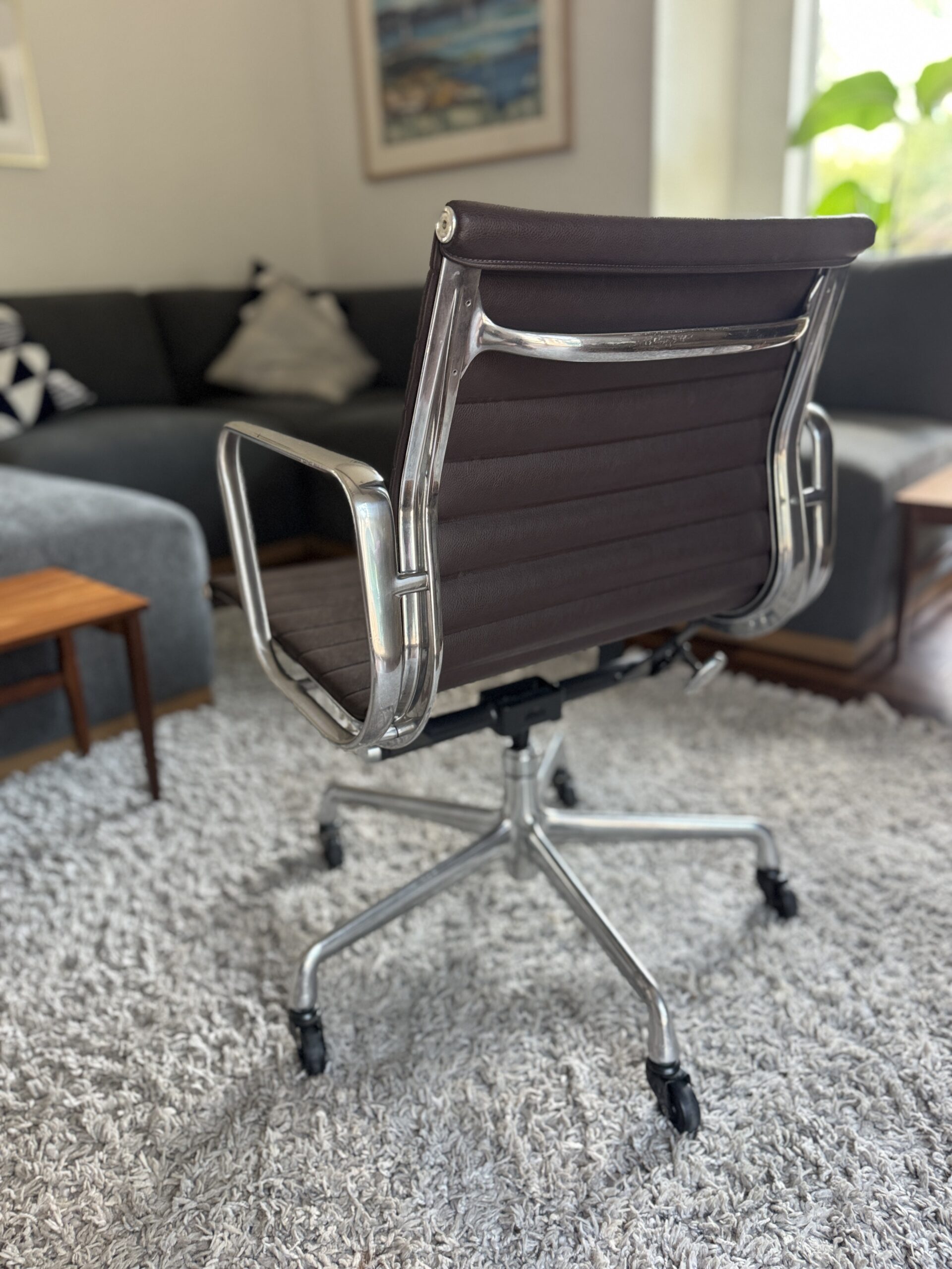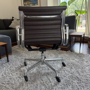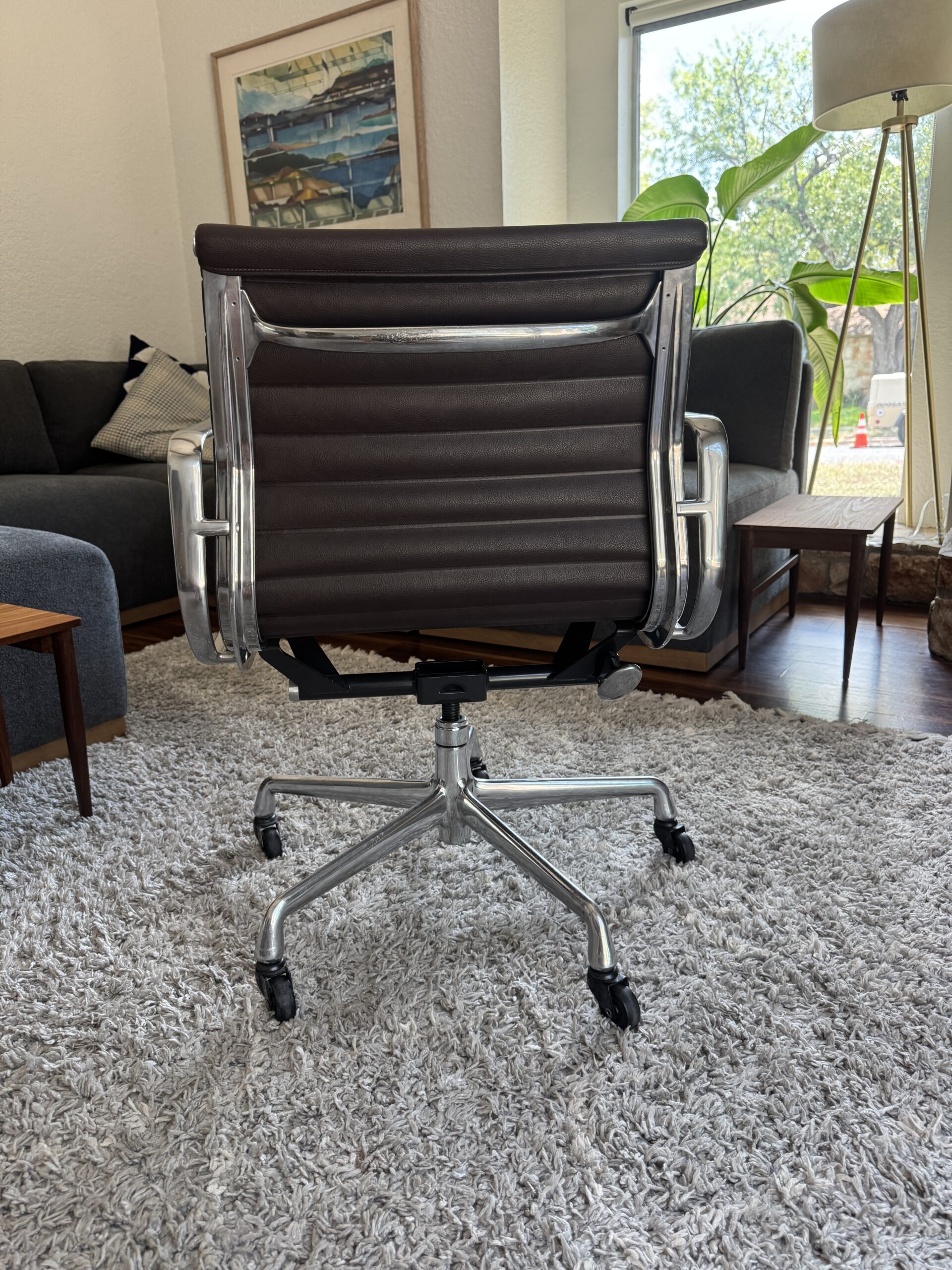 A timeless piece of mid-century design, this authentic Herman Miller Eames Aluminum Group Management Chair is finished in supple dark brown leather with a polished aluminum frame. Designed for comfort and style, it features ribbed leather upholstery, a swivel base, and smooth casters for easy movement.
