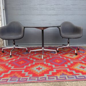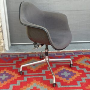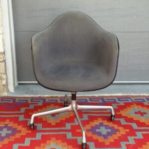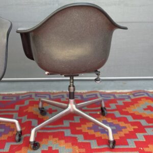 Each chair features a grey upholstered shell atop a sturdy aluminum 4-star base with casters, allowing smooth movement while maintaining that iconic mid-century profile. The sculpted seat offers exceptional ergonomic support, true to the original Eames design principles that made Herman Miller a design legend.
