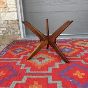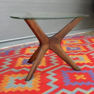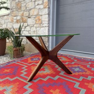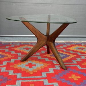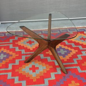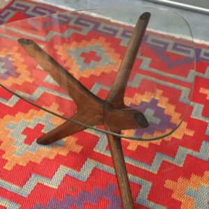 A sculptural mid-century modern icon designed by Adrian Pearsall for Craft Associates. This striking cocktail or side table features a solid walnut “jacks” base that has been refinished, topped with a ⅜” thick glass top. The base showcases Pearsall’s signature sculptural curves and intersecting lines, an example of beautiful form and function.