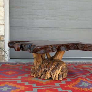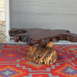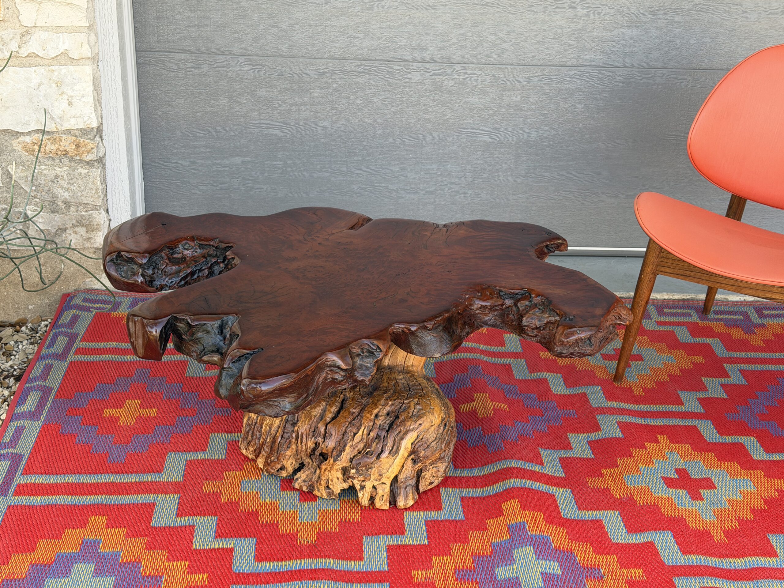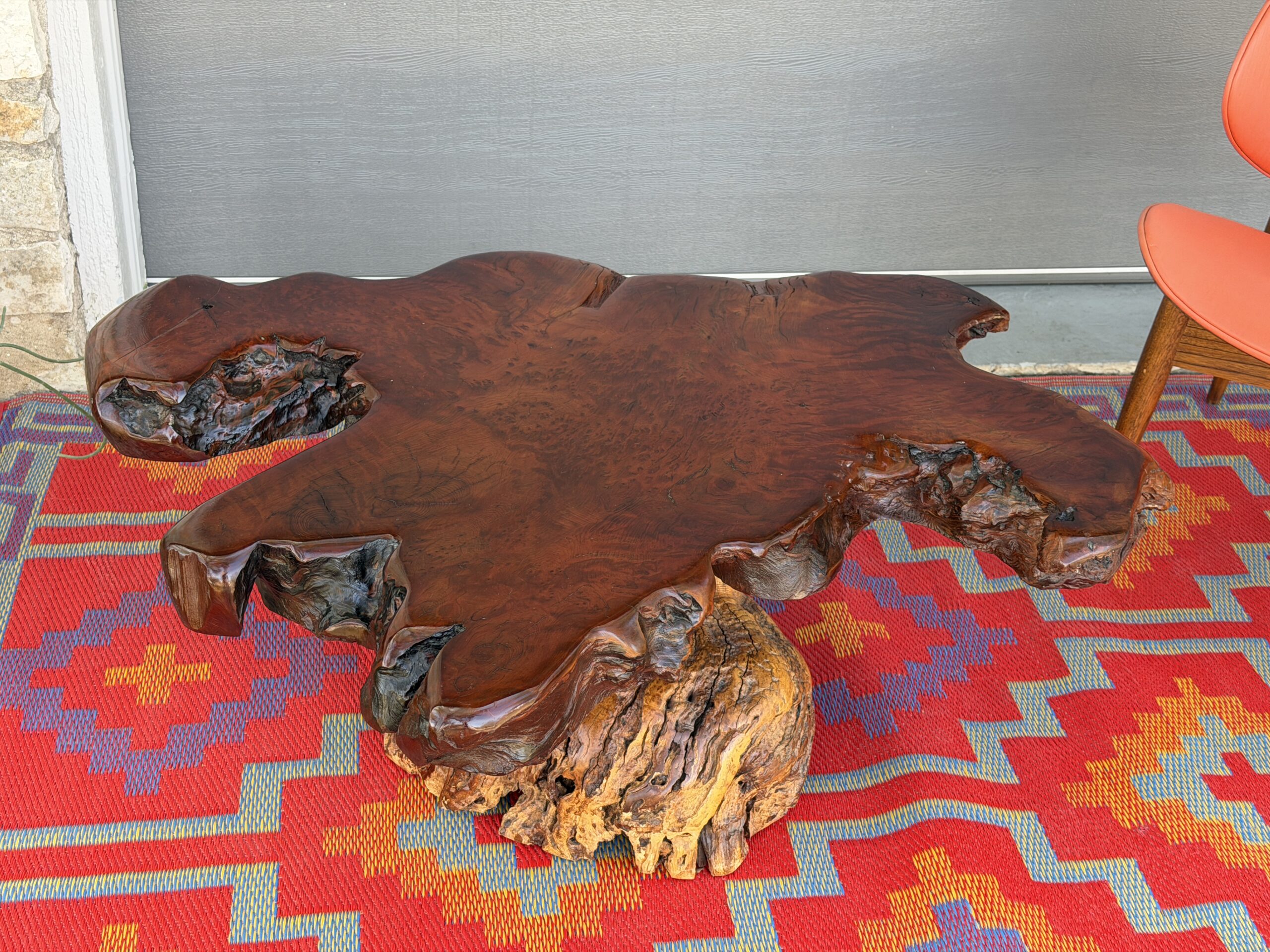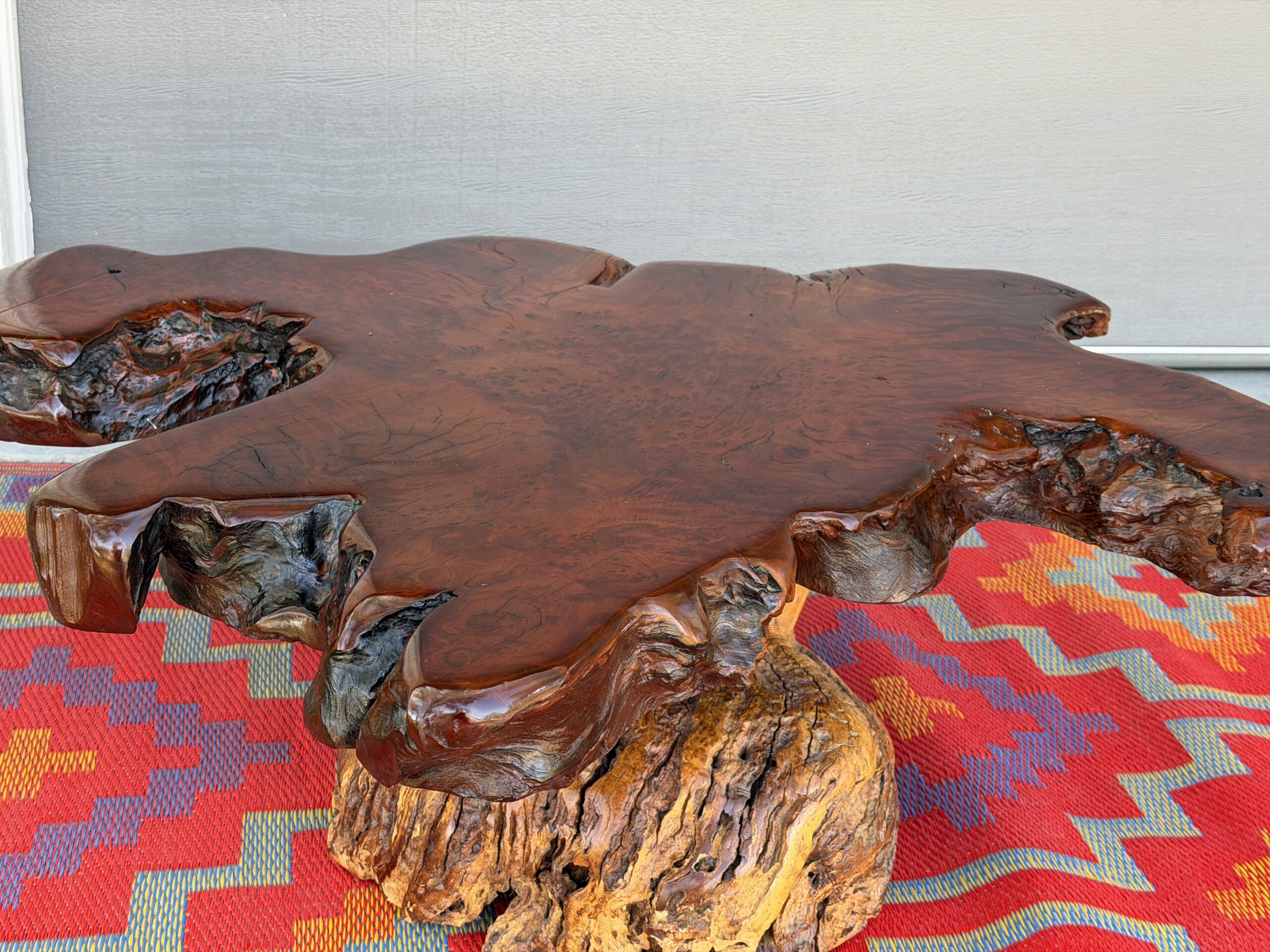A truly one-of-a-kind redwood burl live edge coffee table featuring a thick, organically shaped slab top set on a natural root base.