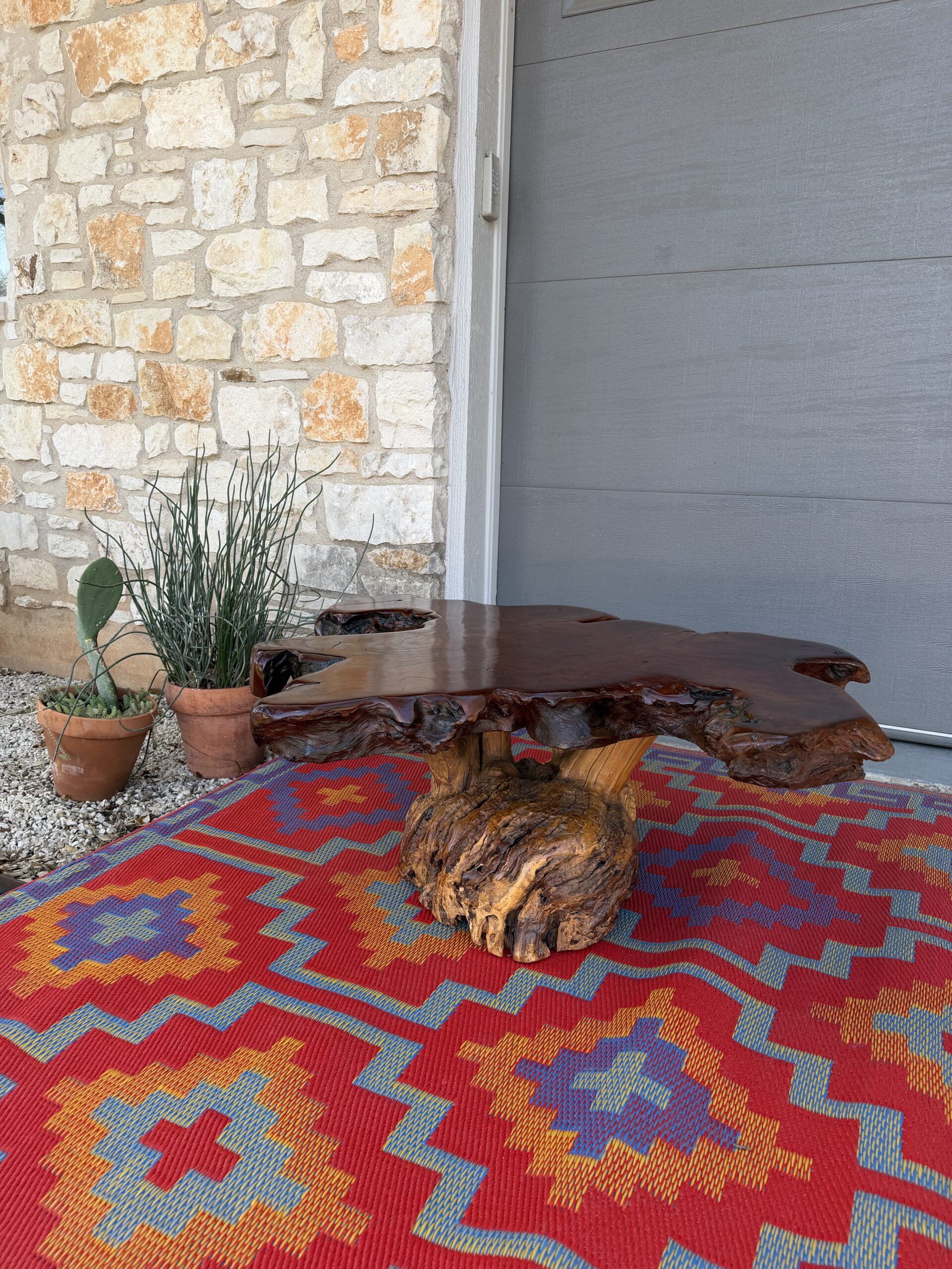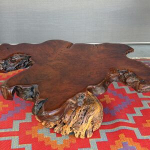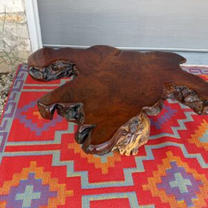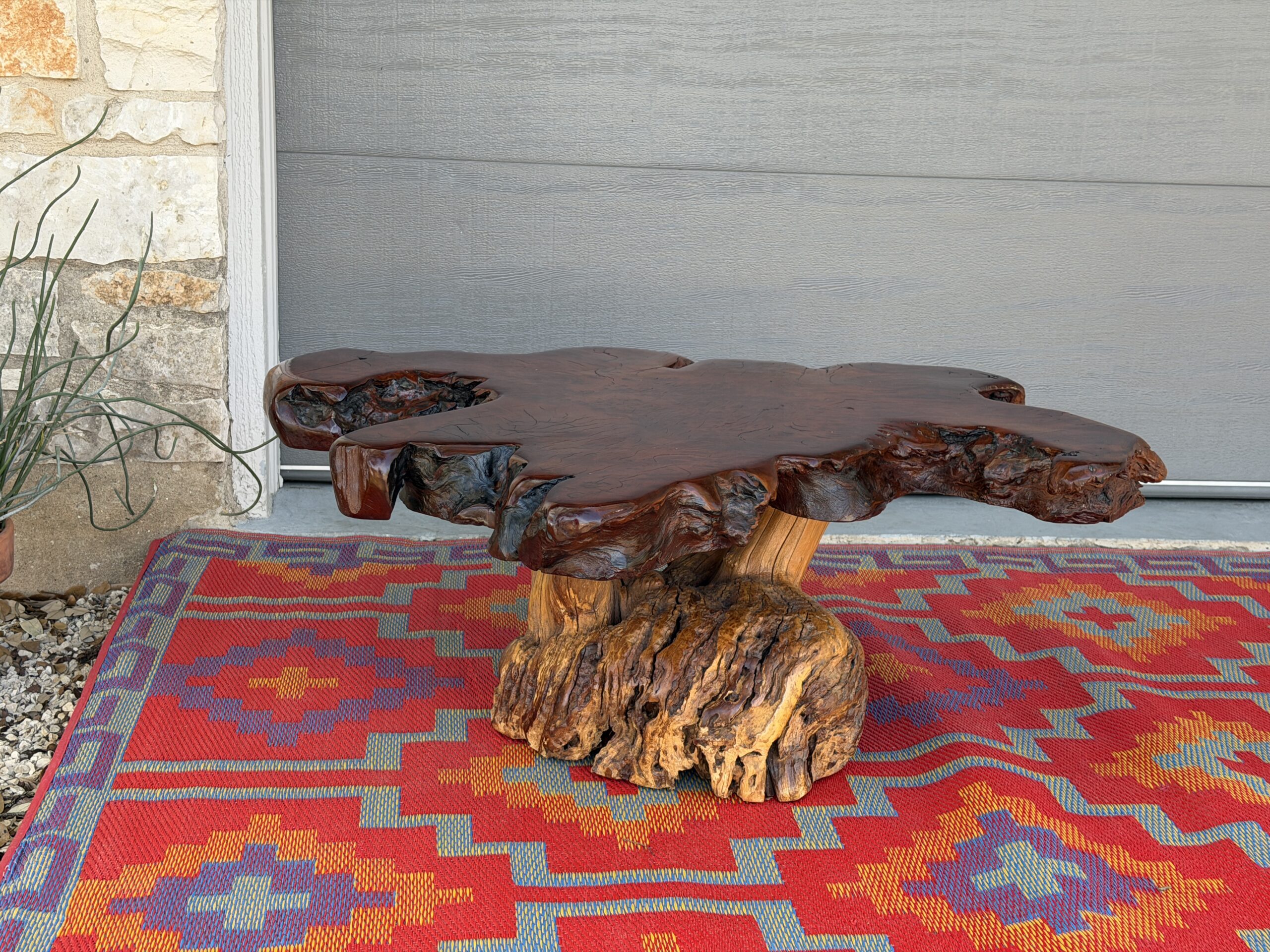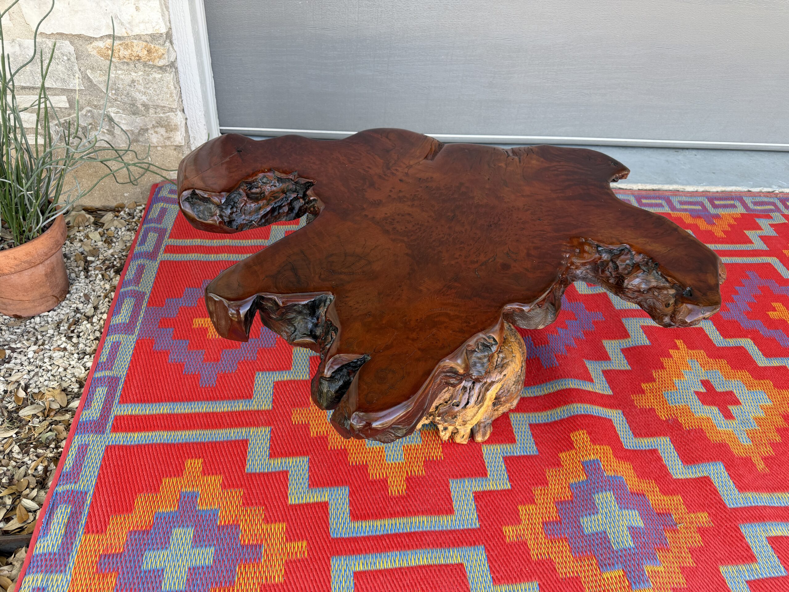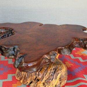 A truly one-of-a-kind redwood burl live edge coffee table featuring a thick, organically shaped slab top set on a natural root base.