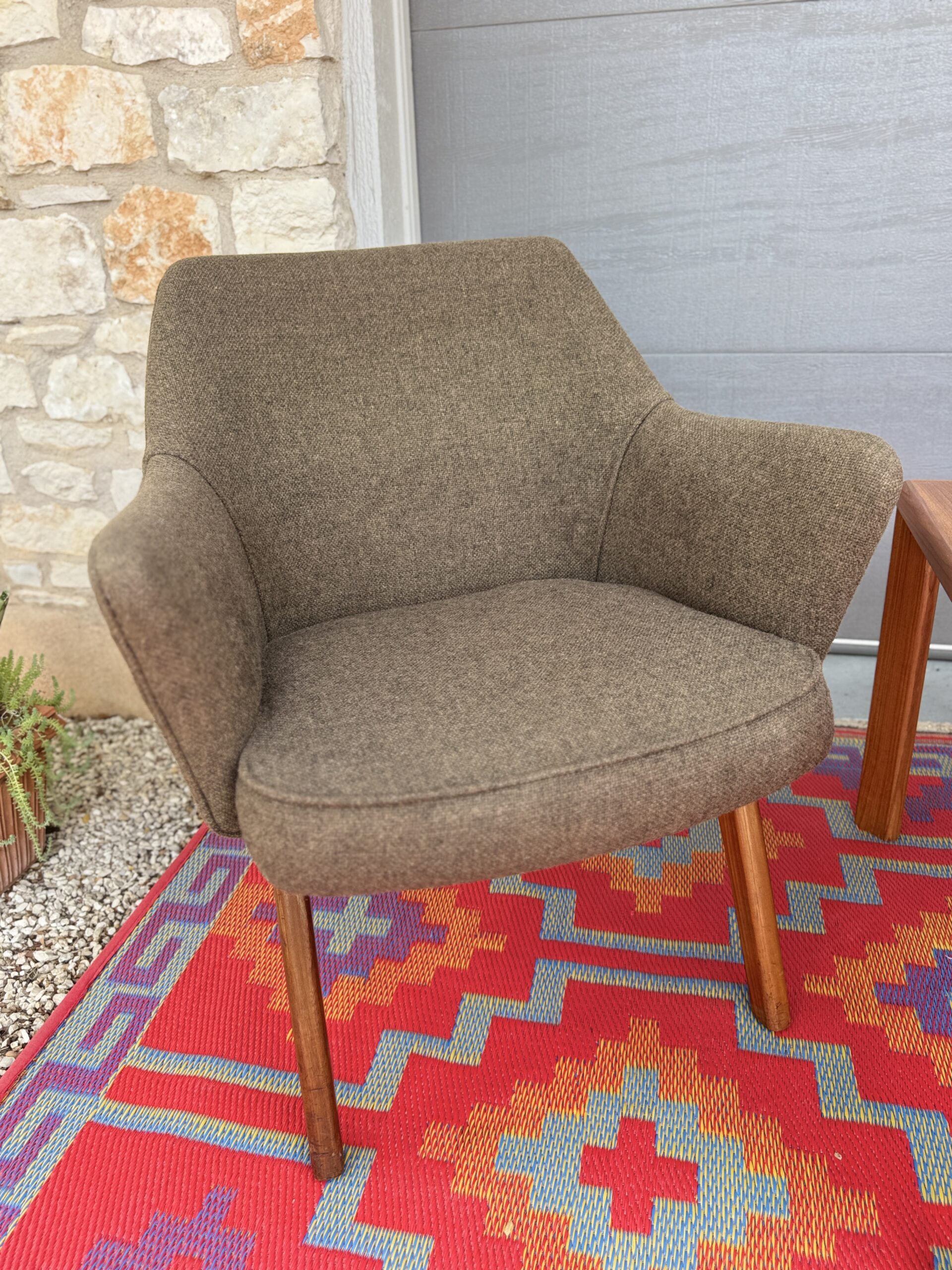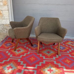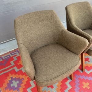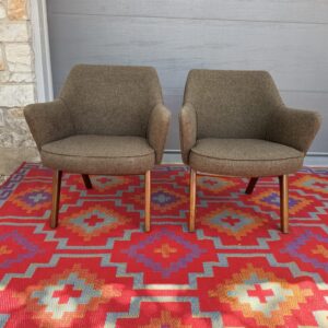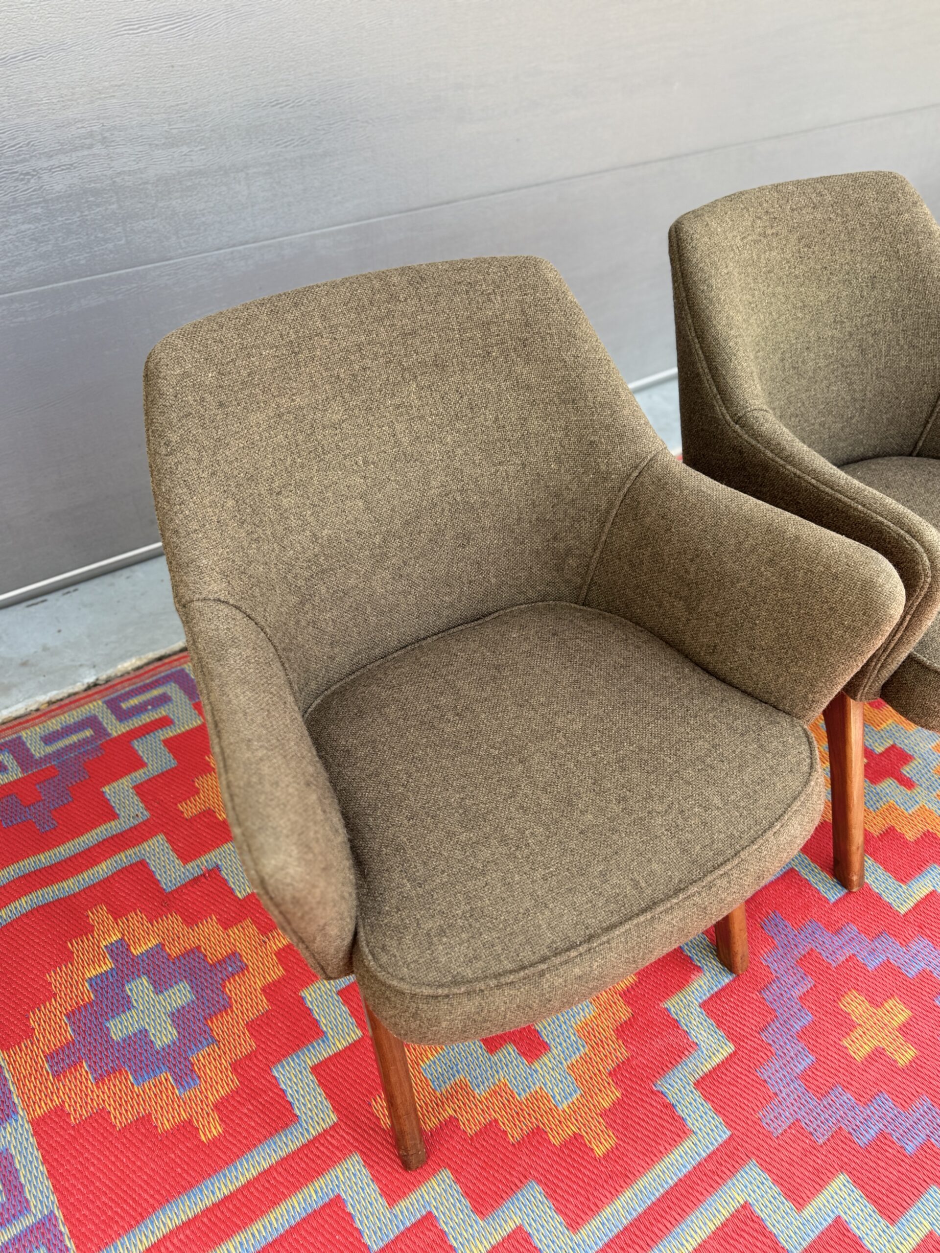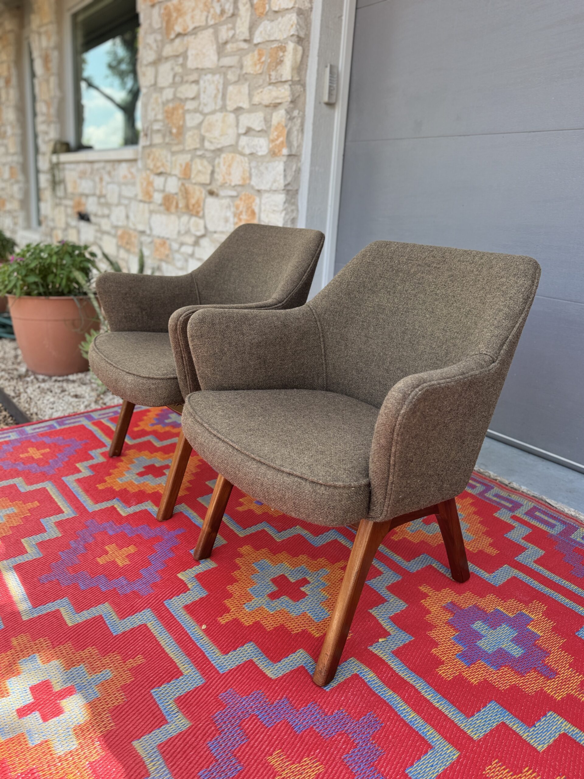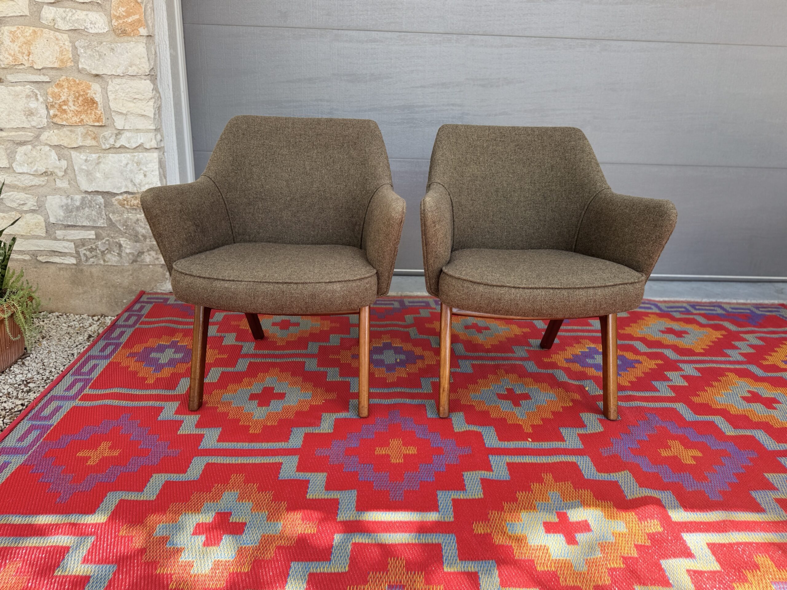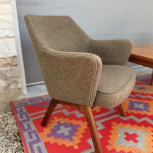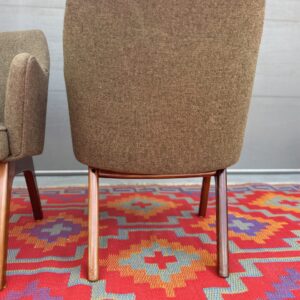 Bring timeless design and comfort into your home with this vintage pair of upholstered armchairs. Featuring clean mid-century inspired lines, gently curved arms, and warm wooden legs, these chairs offer both style and versatility. Upholstered in a neutral greenish brown fabric, they pair beautifully with any interior – from modern minimal to eclectic vintage.