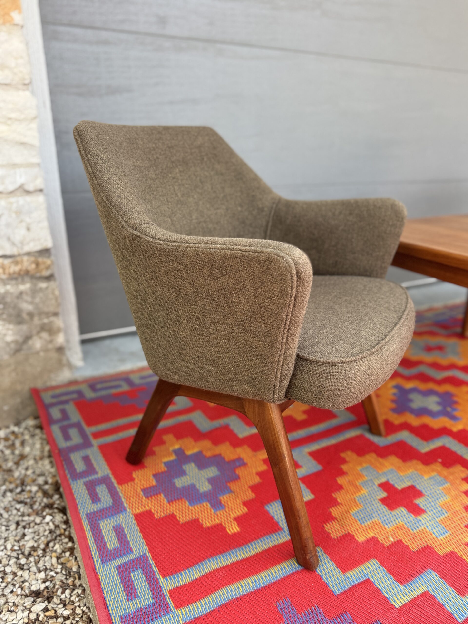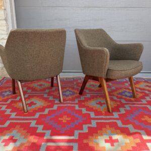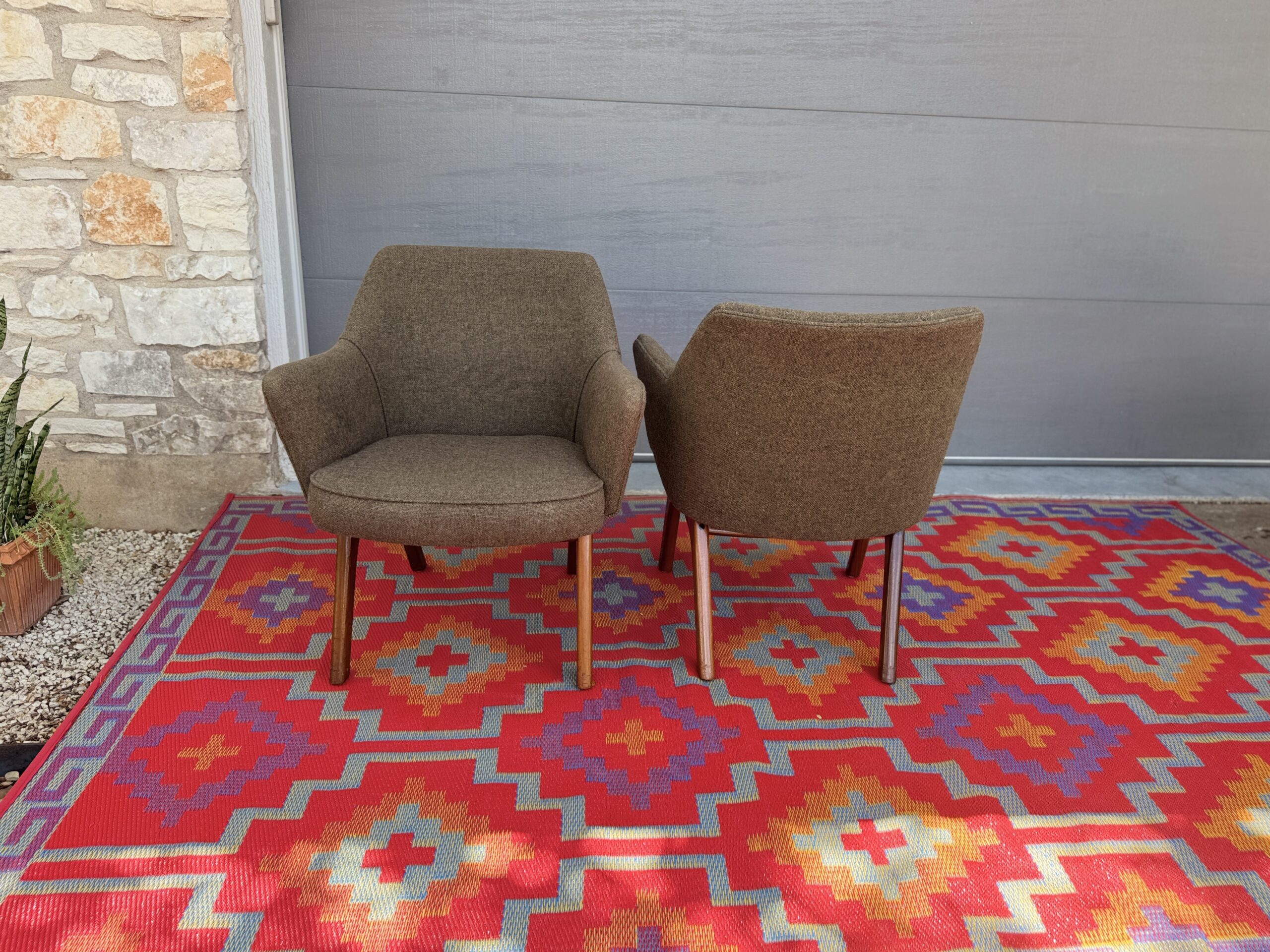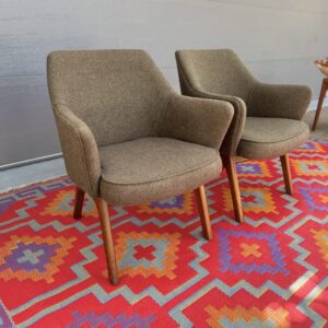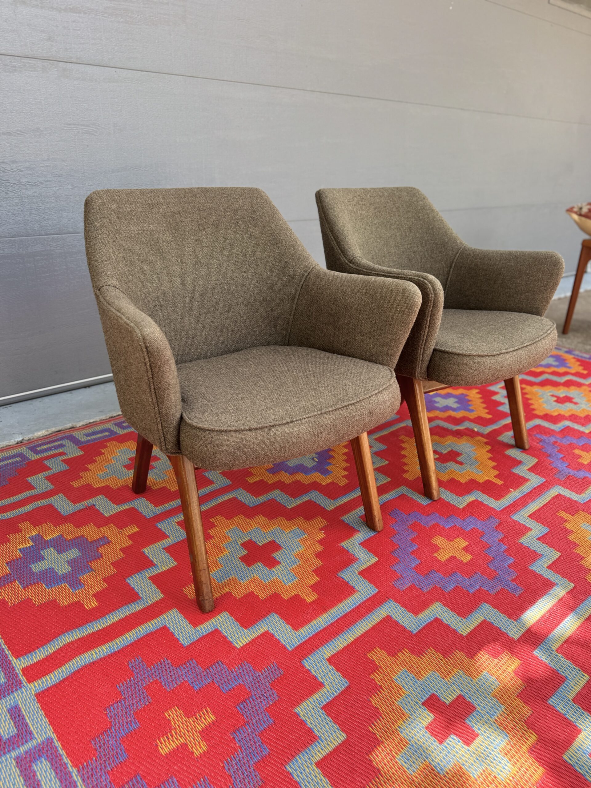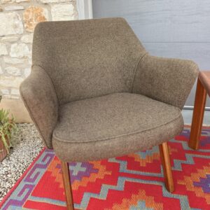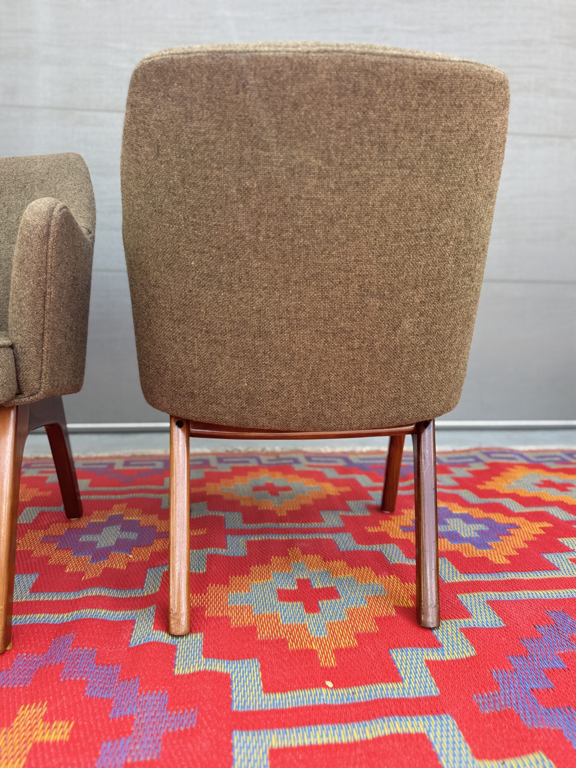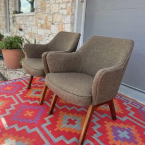 Bring timeless design and comfort into your home with this vintage pair of upholstered armchairs. Featuring clean mid-century inspired lines, gently curved arms, and warm wooden legs, these chairs offer both style and versatility. Upholstered in a neutral greenish brown fabric, they pair beautifully with any interior – from modern minimal to eclectic vintage.