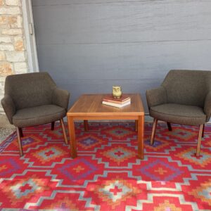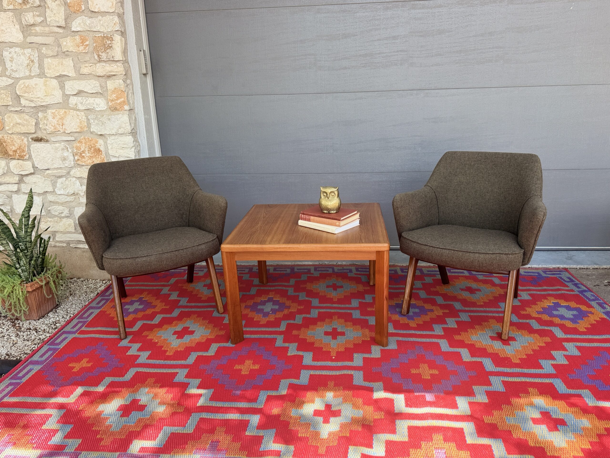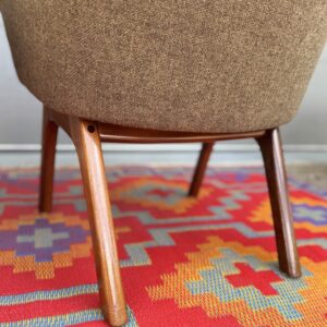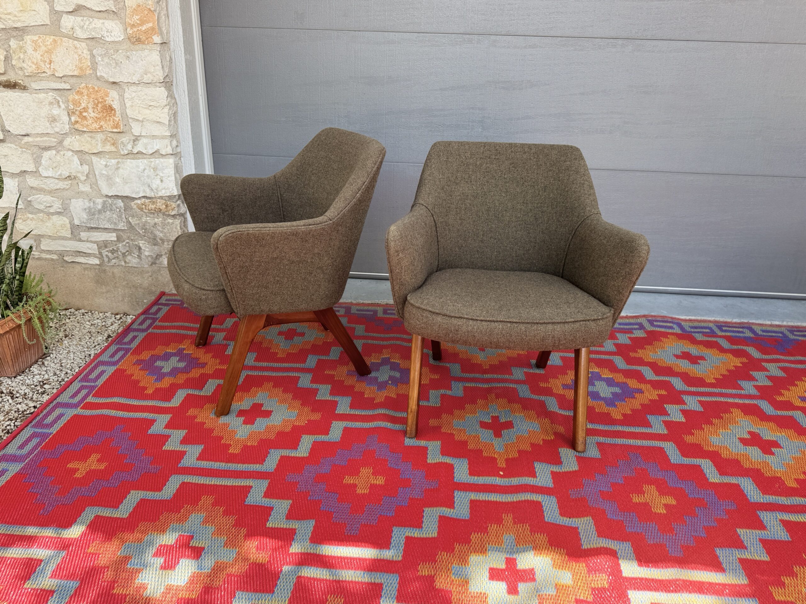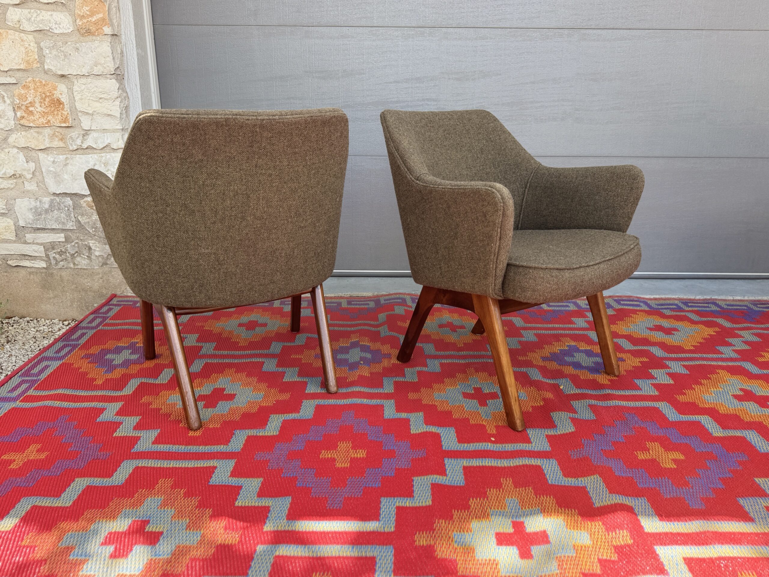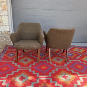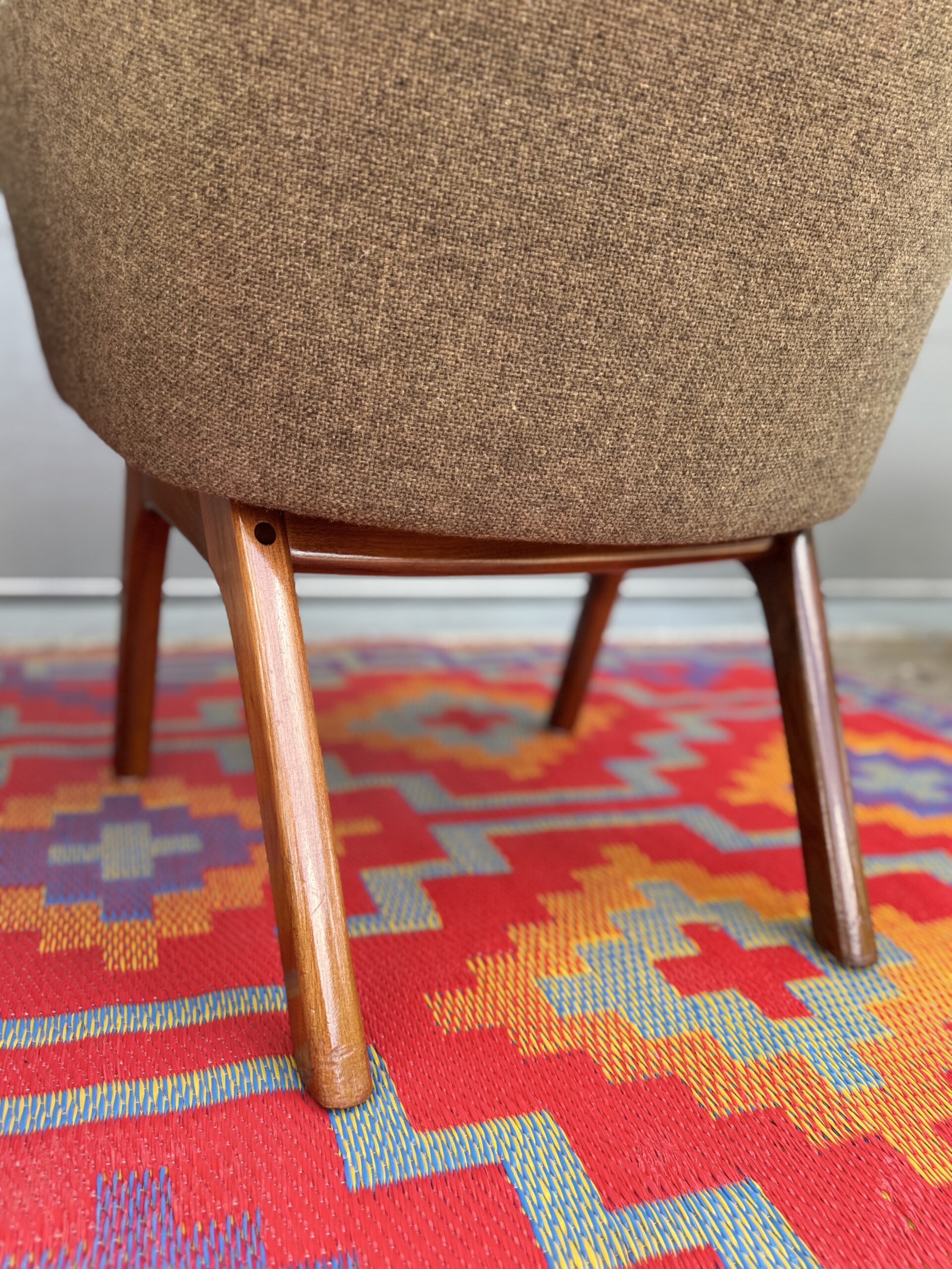Bring timeless design and comfort into your home with this vintage pair of upholstered armchairs. Featuring clean mid-century inspired lines, gently curved arms, and warm wooden legs, these chairs offer both style and versatility. Upholstered in a neutral greenish brown fabric, they pair beautifully with any interior – from modern minimal to eclectic vintage.