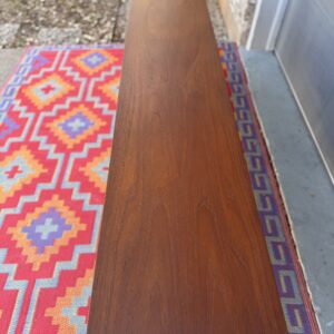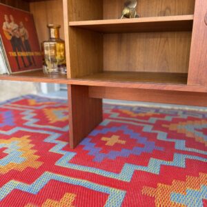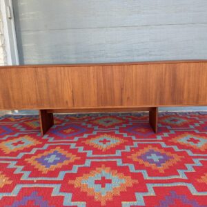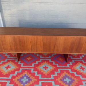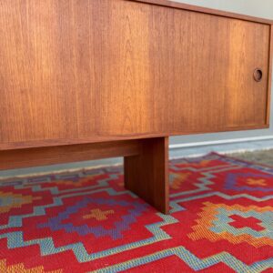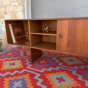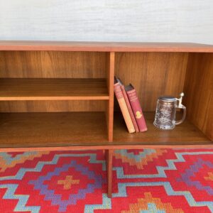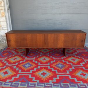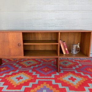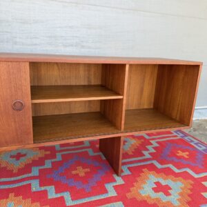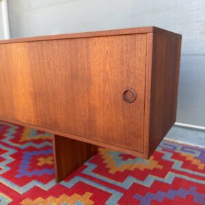 Designed by Danish craftsman Peter Lovig, this teak sliding-door credenza is a timeless low-profile mid-century storage piece. Featuring clean Scandinavian lines, circular recessed pulls, clean and elegant base, it blends form and function perfectly. Internal middle shelf is adjustable or removable. Fully finished back makes it ideal for floating or separating a room.