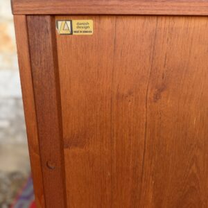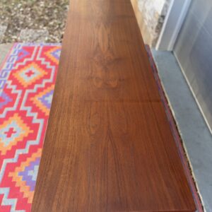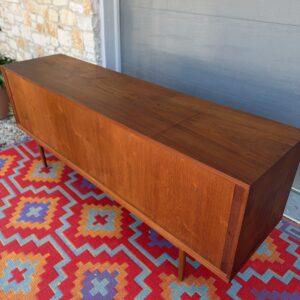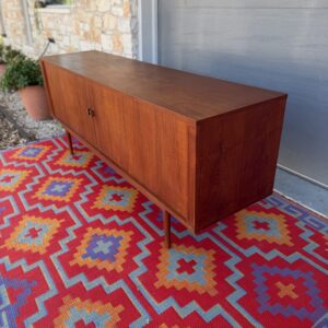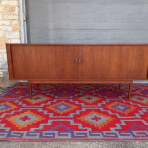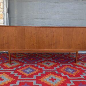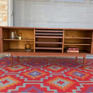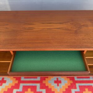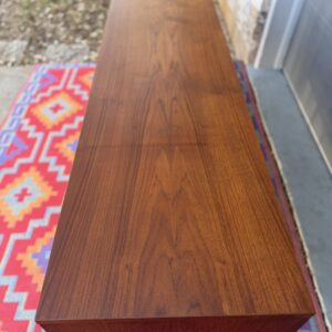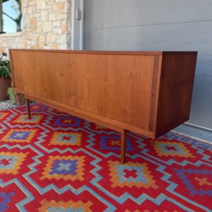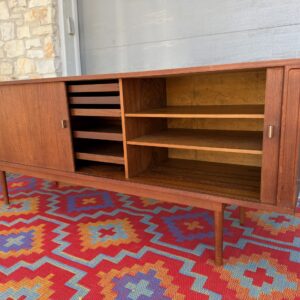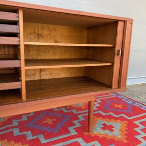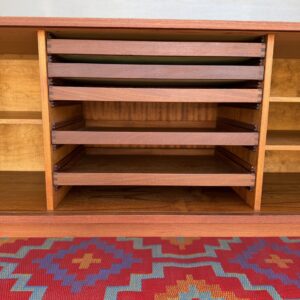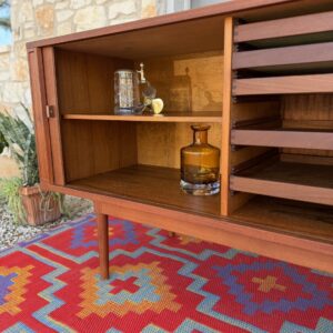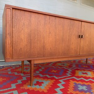 A large and striking Danish Modern dark teak credenza by Jens Quistgaard for Peter Lovig, known for his refined Scandinavian craftsmanship and iconic functional design. This piece features beautifully sleek seamless tambour doors, adjustable internal shelving, 5 smooth gliding shallow drawers (2 felt lined), and a fully finished back you’ll want to show off as much as the front.