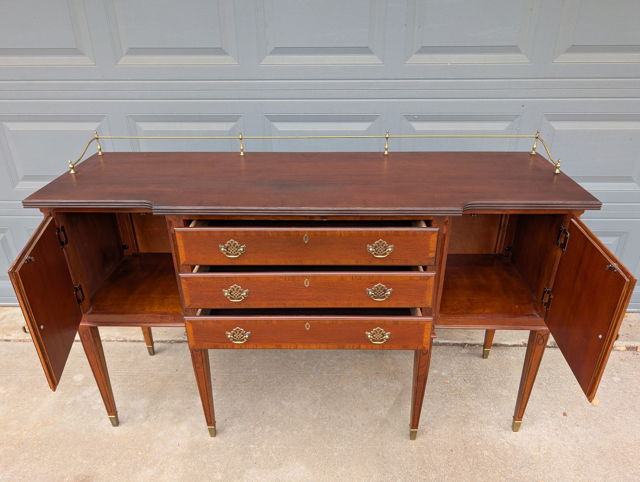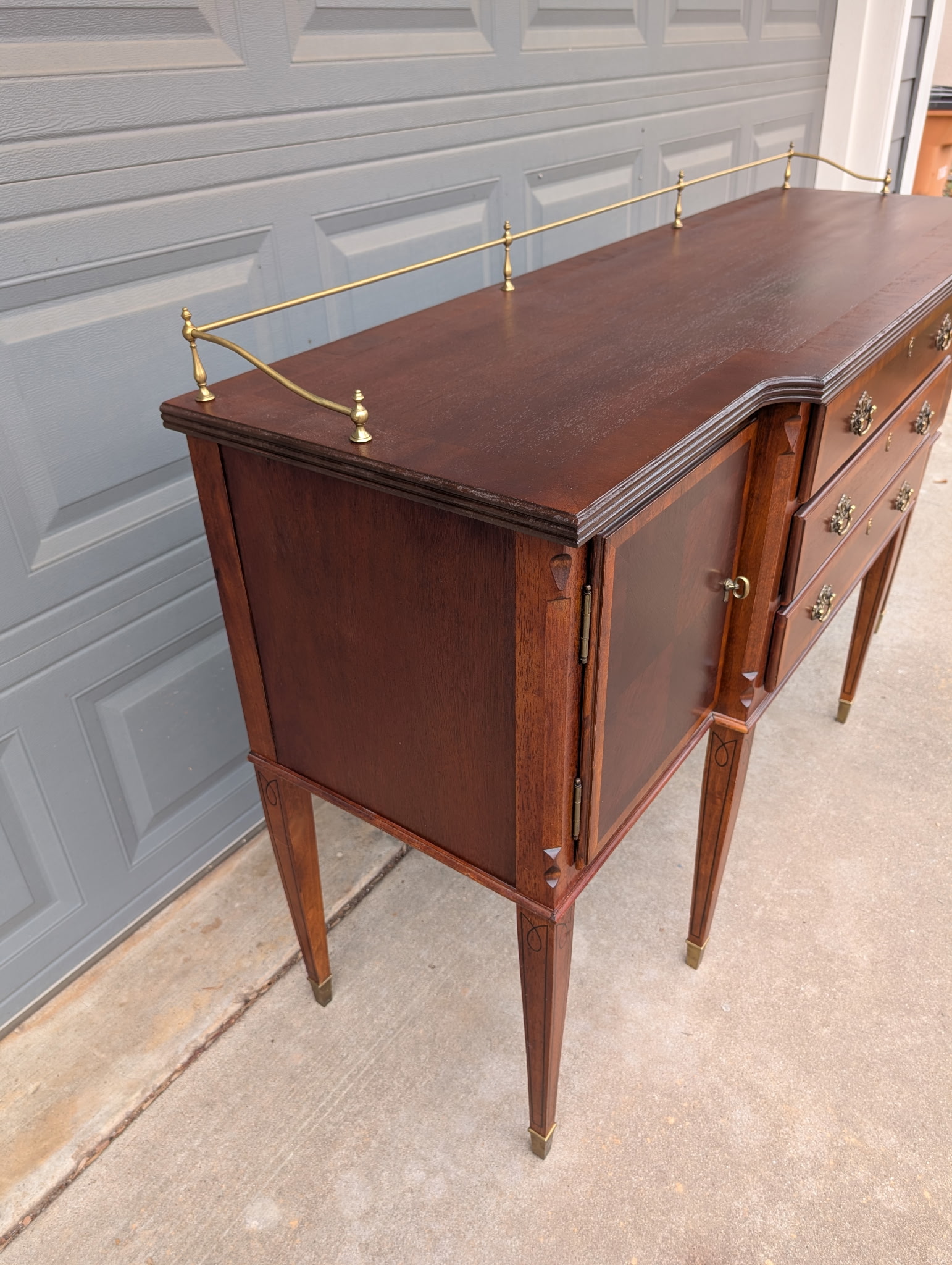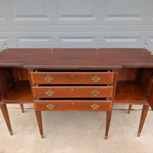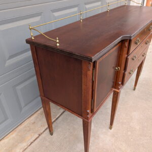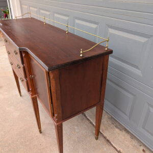 Elegant vintage server sideboard crafted in rich mahogany, featuring a classic brass gallery rail (removable), three central drawers, and double door cabinets on each side for generous storage. The refined proportions, tapered legs, and brass foot caps give this piece a sophisticated, traditional feel that works beautifully in dining rooms, entryways, or as a statement console.