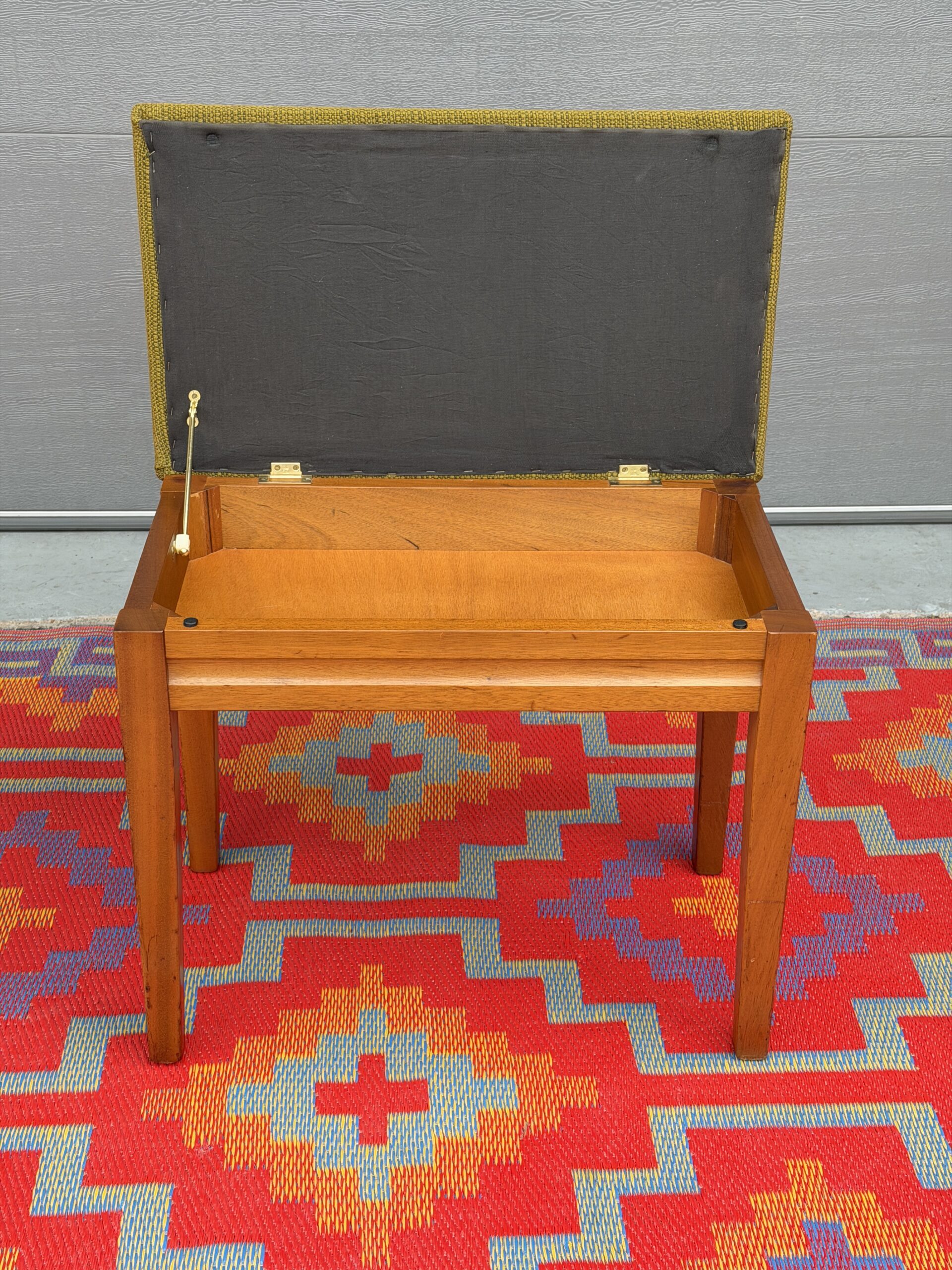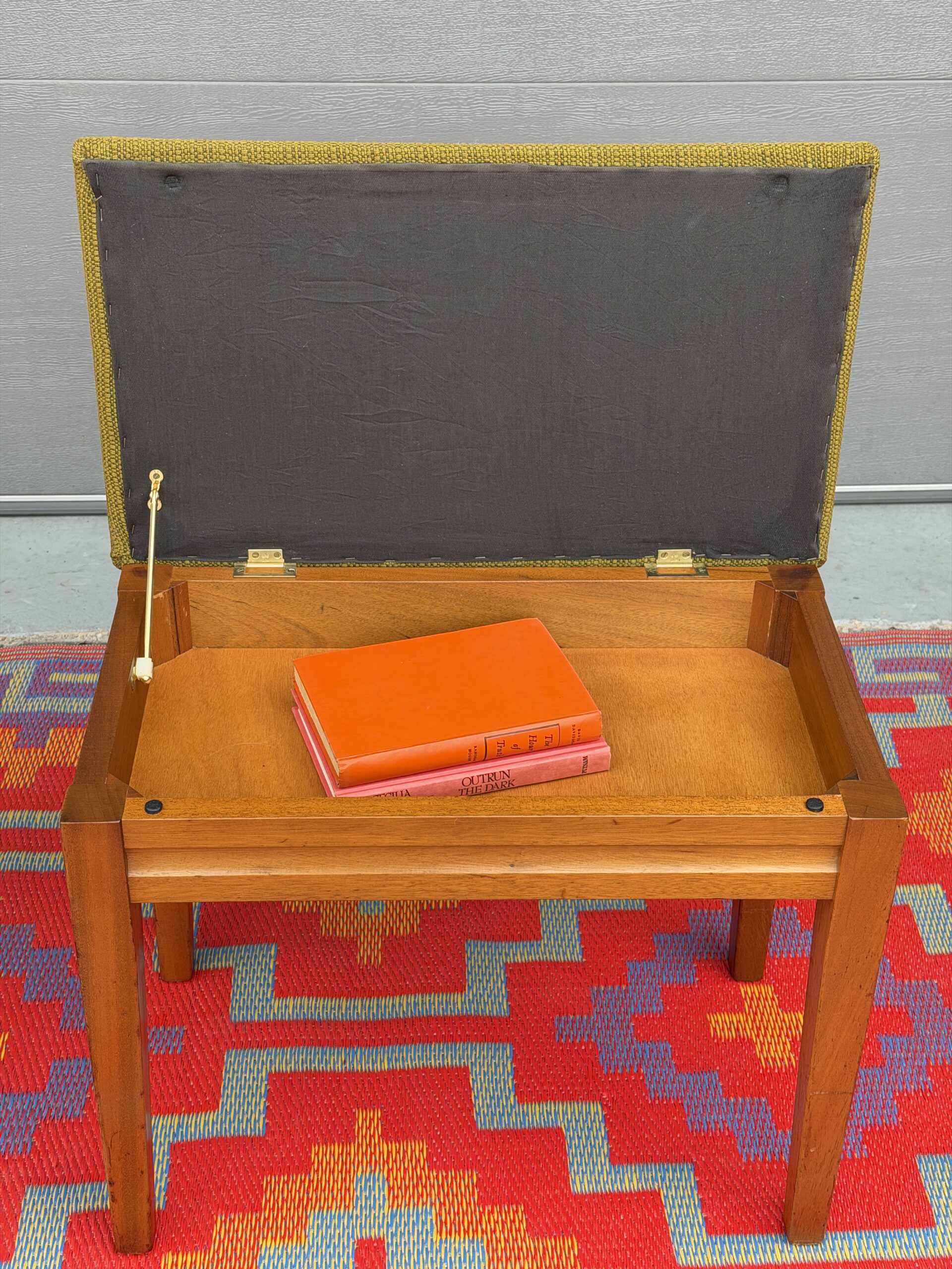 This versatile piece works beautifully as extra seating, a footstool, or an accent piece at the end of a bed, in a living room, or entryway. Clean lines, thoughtful functionality, and classic MCM style all in one compact piece.