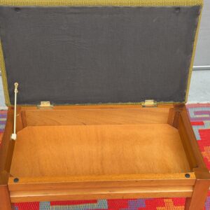Charming mid-century modern stool featuring a light wood frame and an upholstered seat in a textured green tweed fabric. The hinged top opens to reveal hidden interior storage—perfect for blankets, books, or everyday essentials.