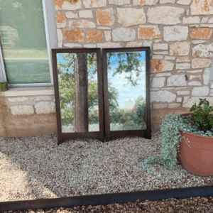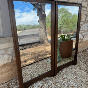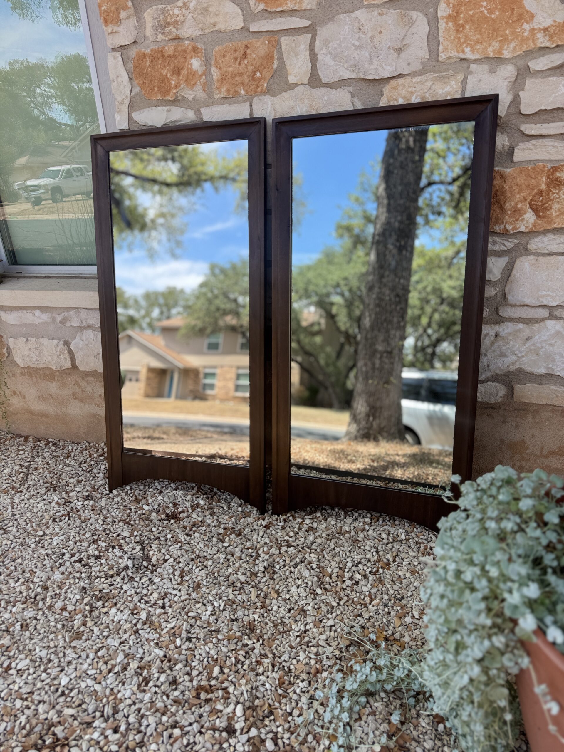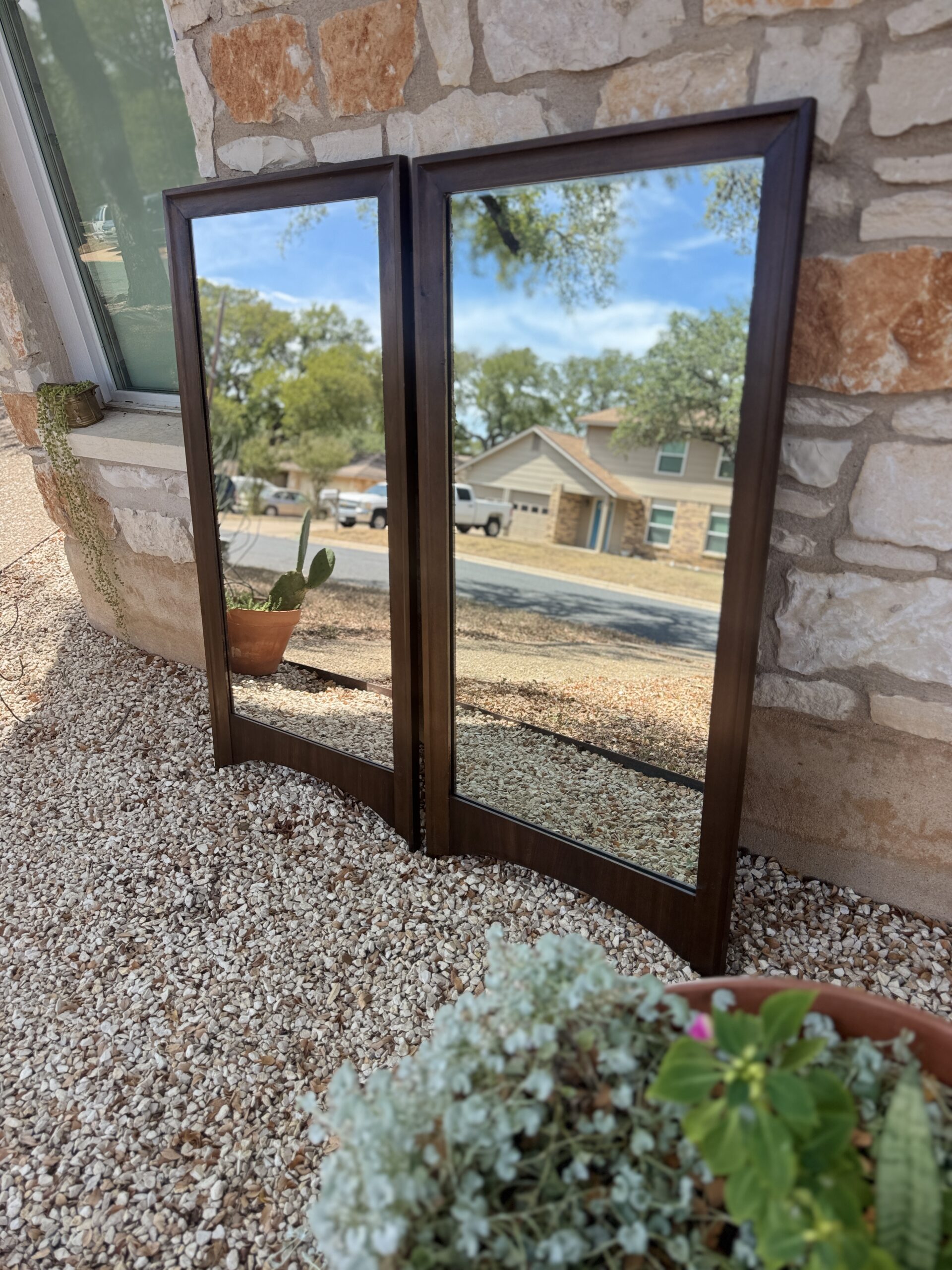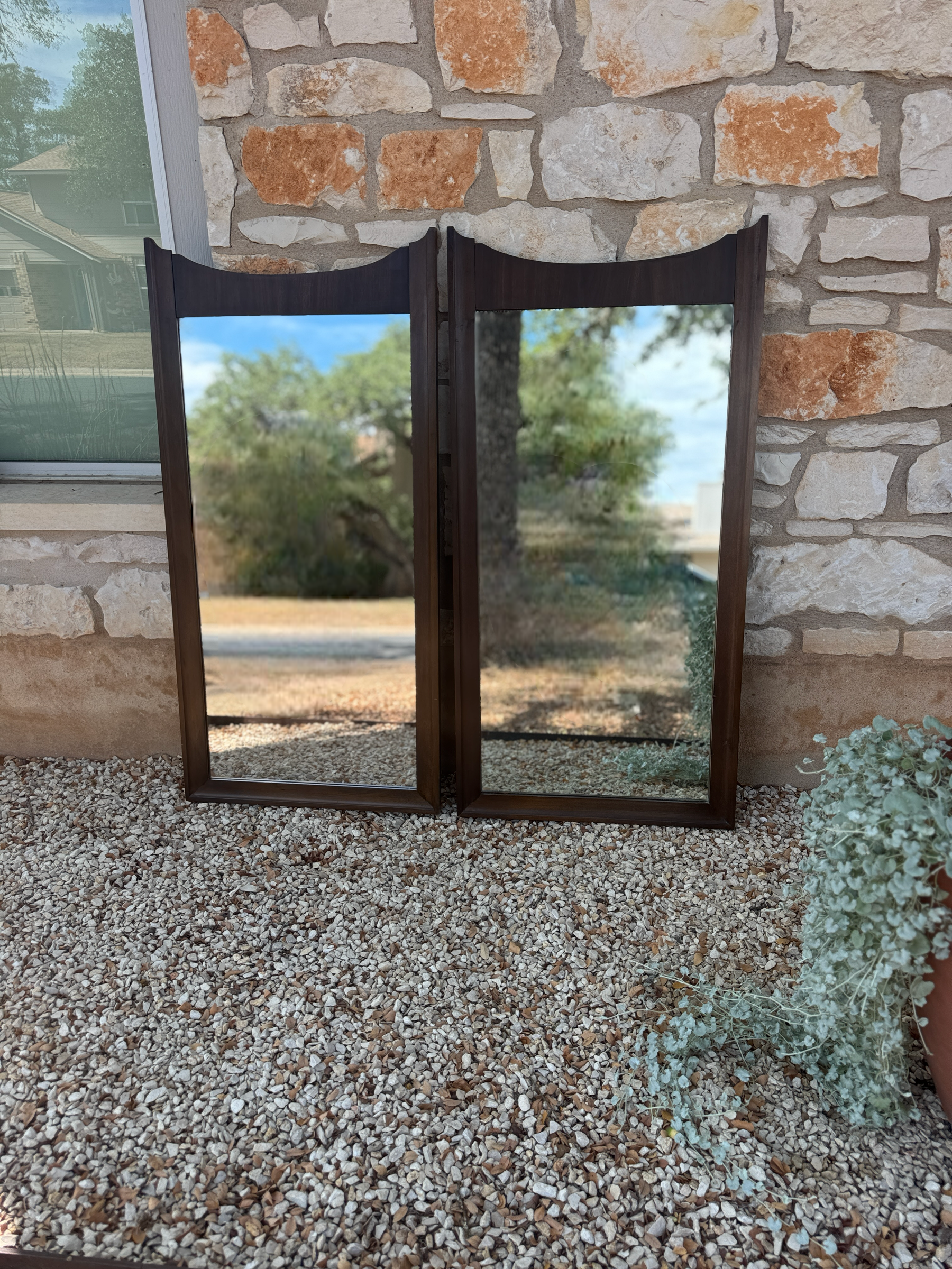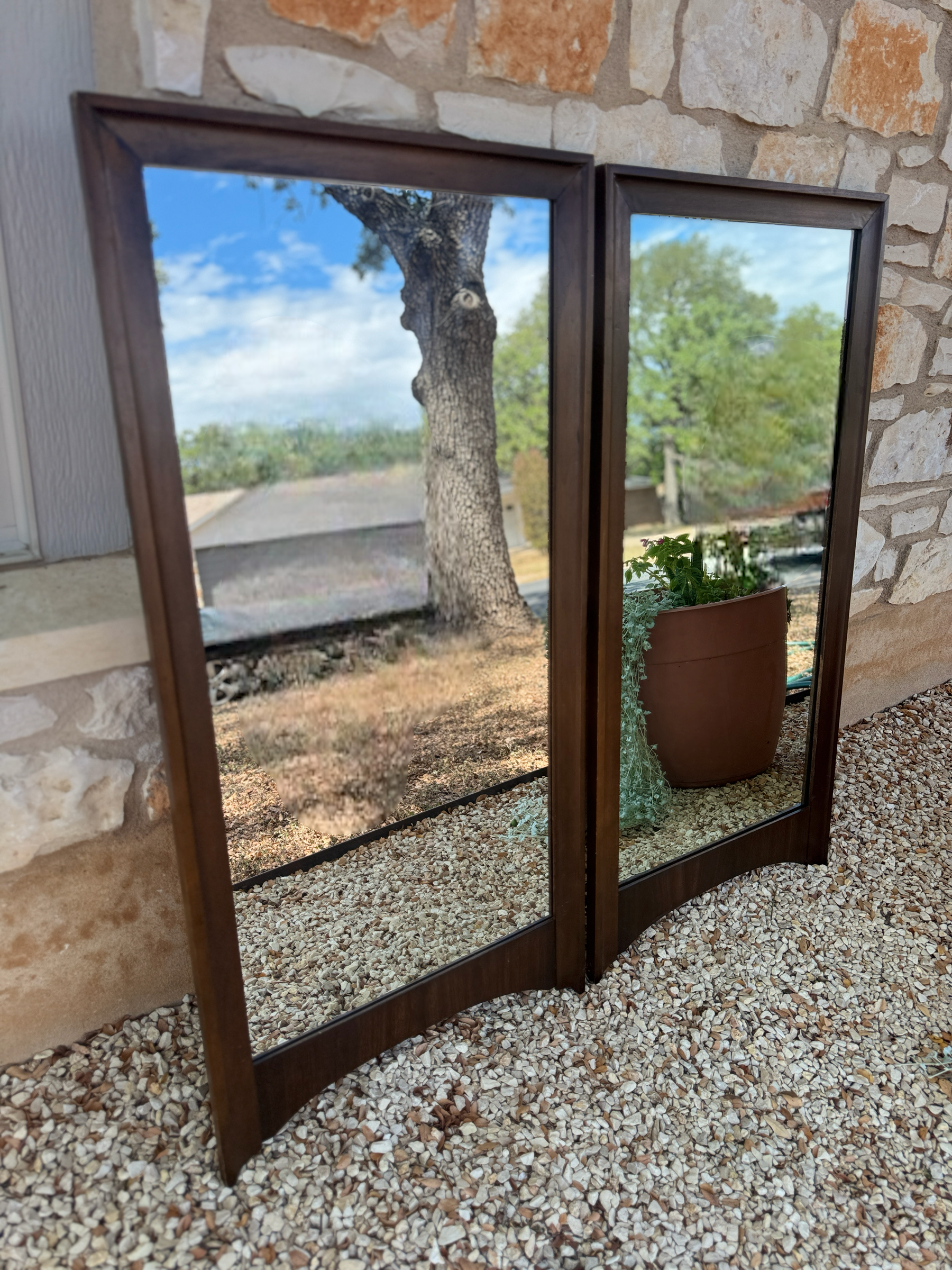 A striking set of mid-century modern walnut-framed mirrors by Broyhill. Perfect for adding height, light, and style to your home. Featuring elegant sculpted tops and rich walnut wood, these mirrors work beautifully as a pair above a dresser, console, or bathroom vanity — or individually in entryways and bedrooms.