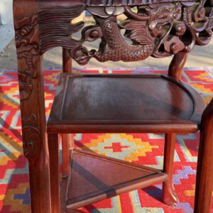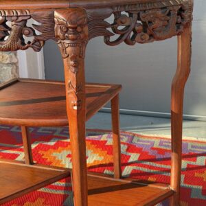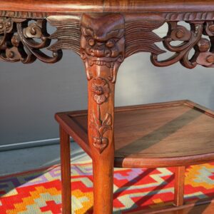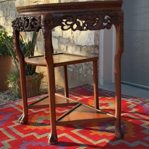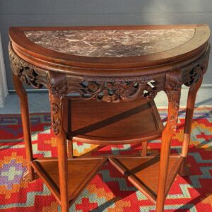 This gorgeous antique Demi-Lune Console showcases remarkable craftsmanship with hand-carved dragons, botanical scrollwork, and claw-foot legs – crafted from solid rosewood. The top features a natural marble inlay, adding elegant contrast and a luxe surface perfect for styling in an entryway, living room, or curated vignette space.