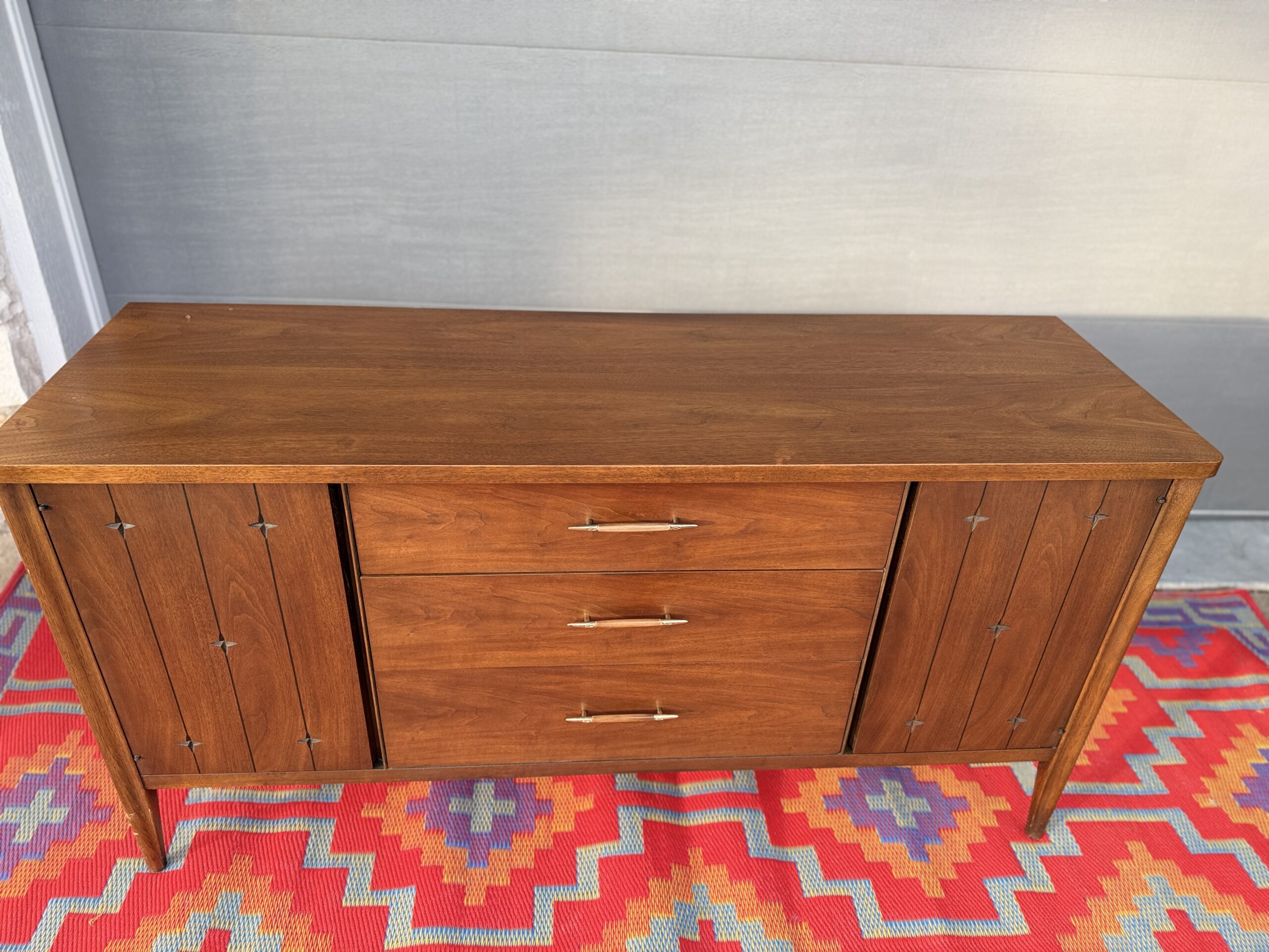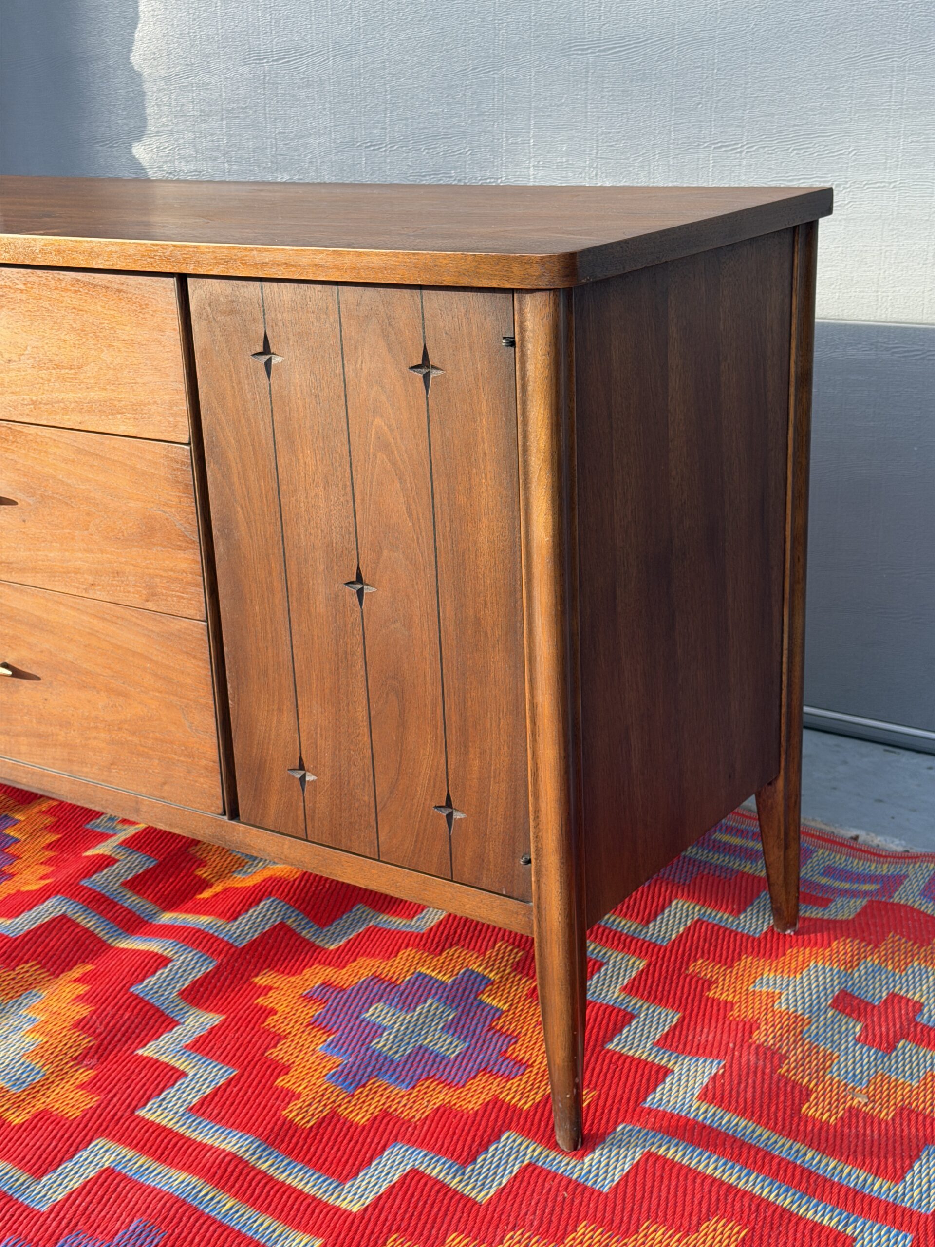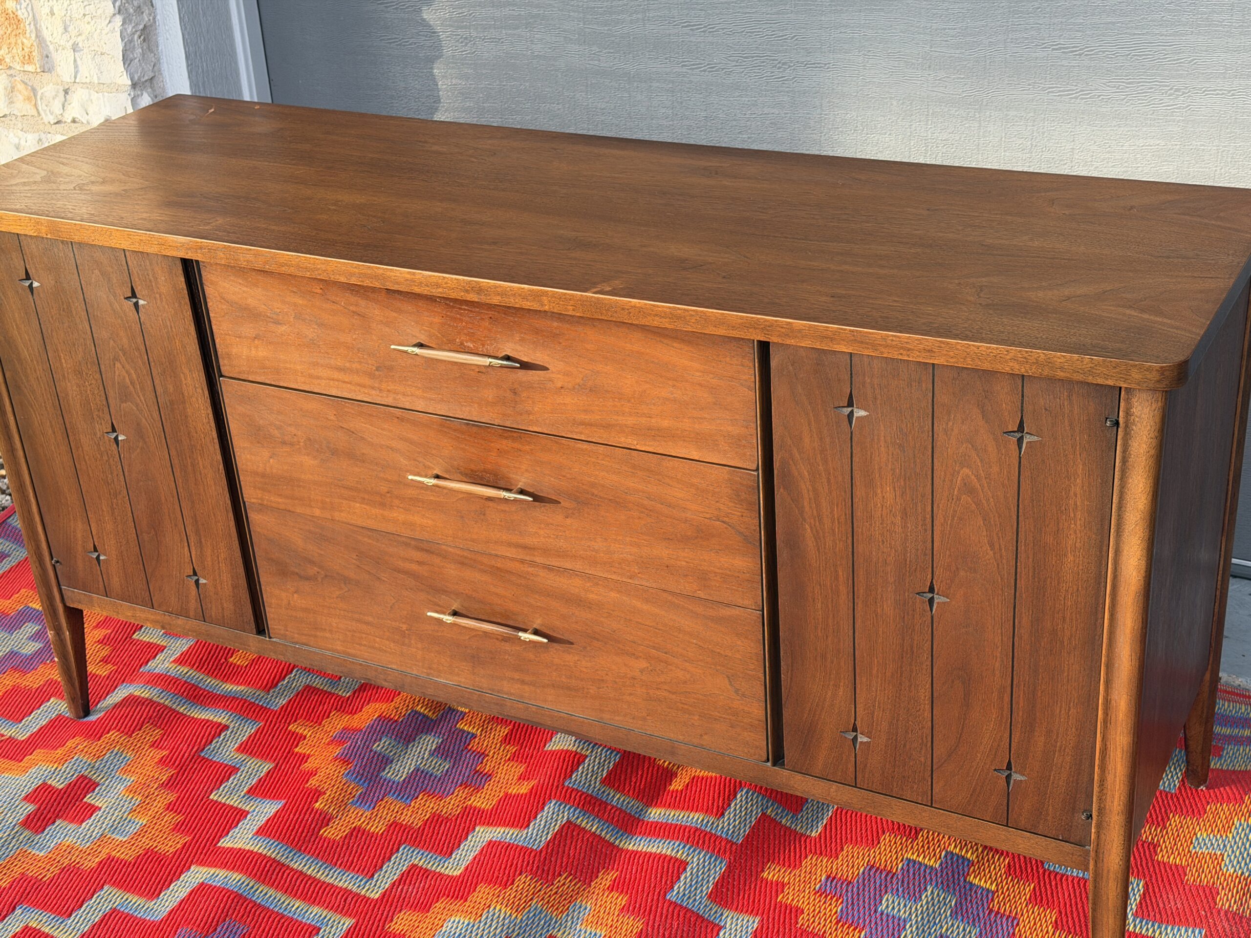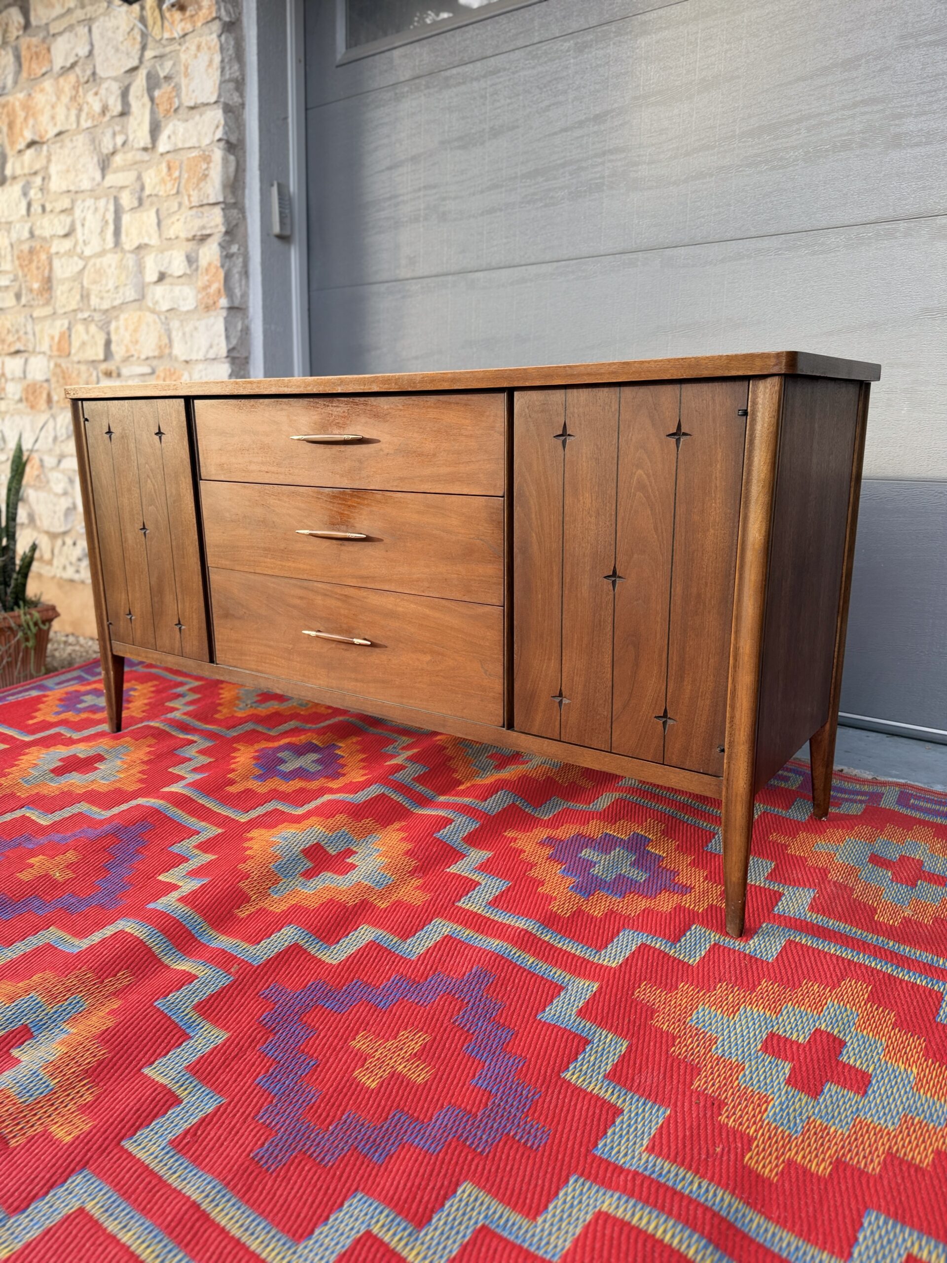 A gorgeous piece from the iconic Broyhill Saga collection, featuring the signature star-carved doors and timeless mid-century silhouette. This credenza offers generous storage with two outer cabinets and smooth-gliding central drawers—perfect as a media console, dining room storage, or entryway statement piece.