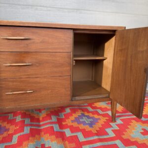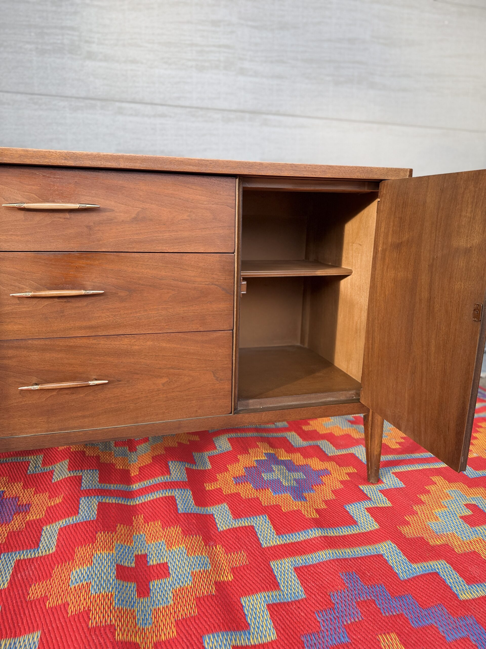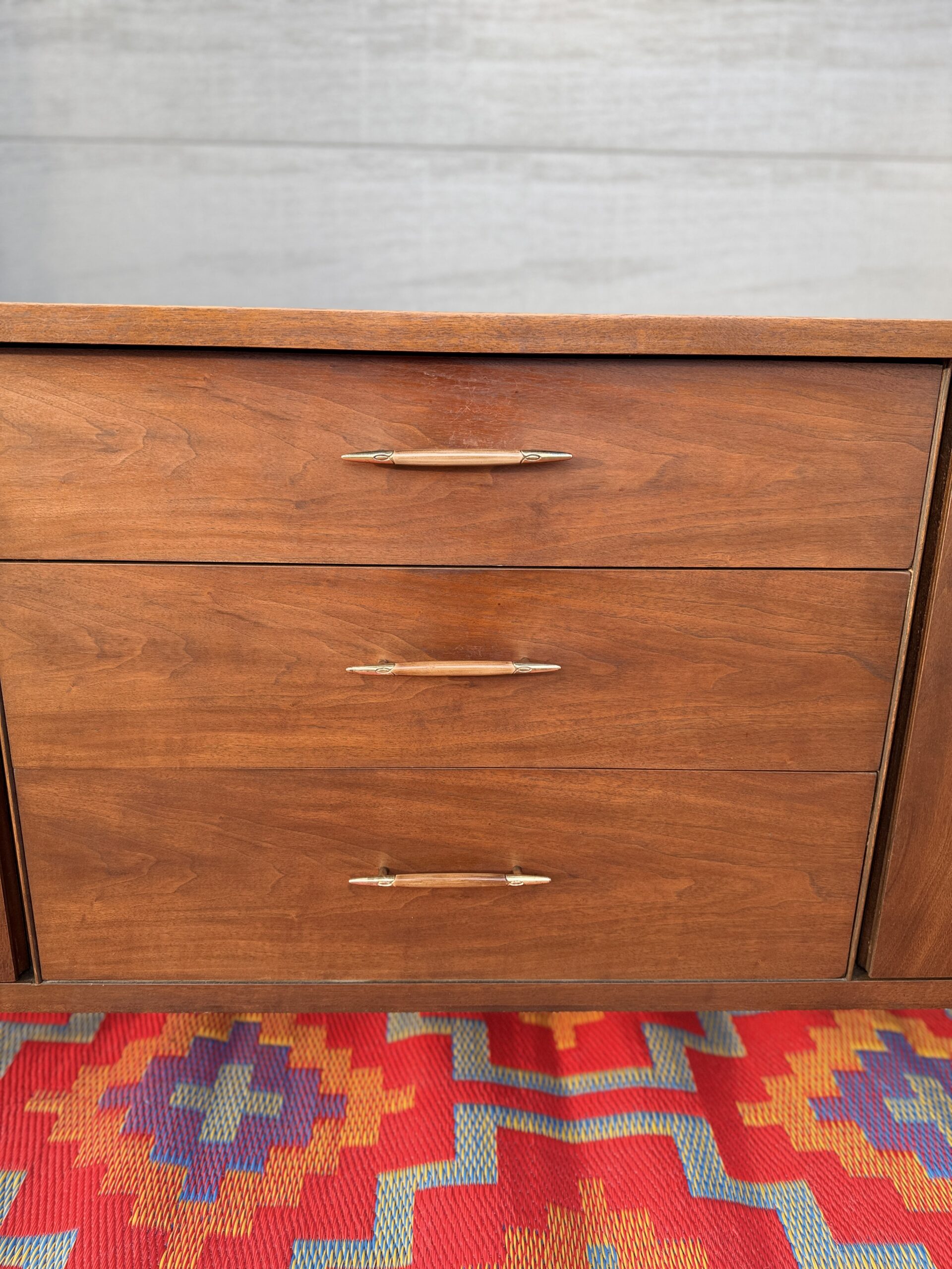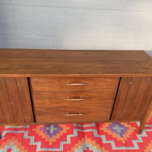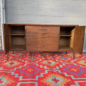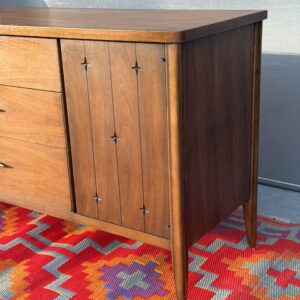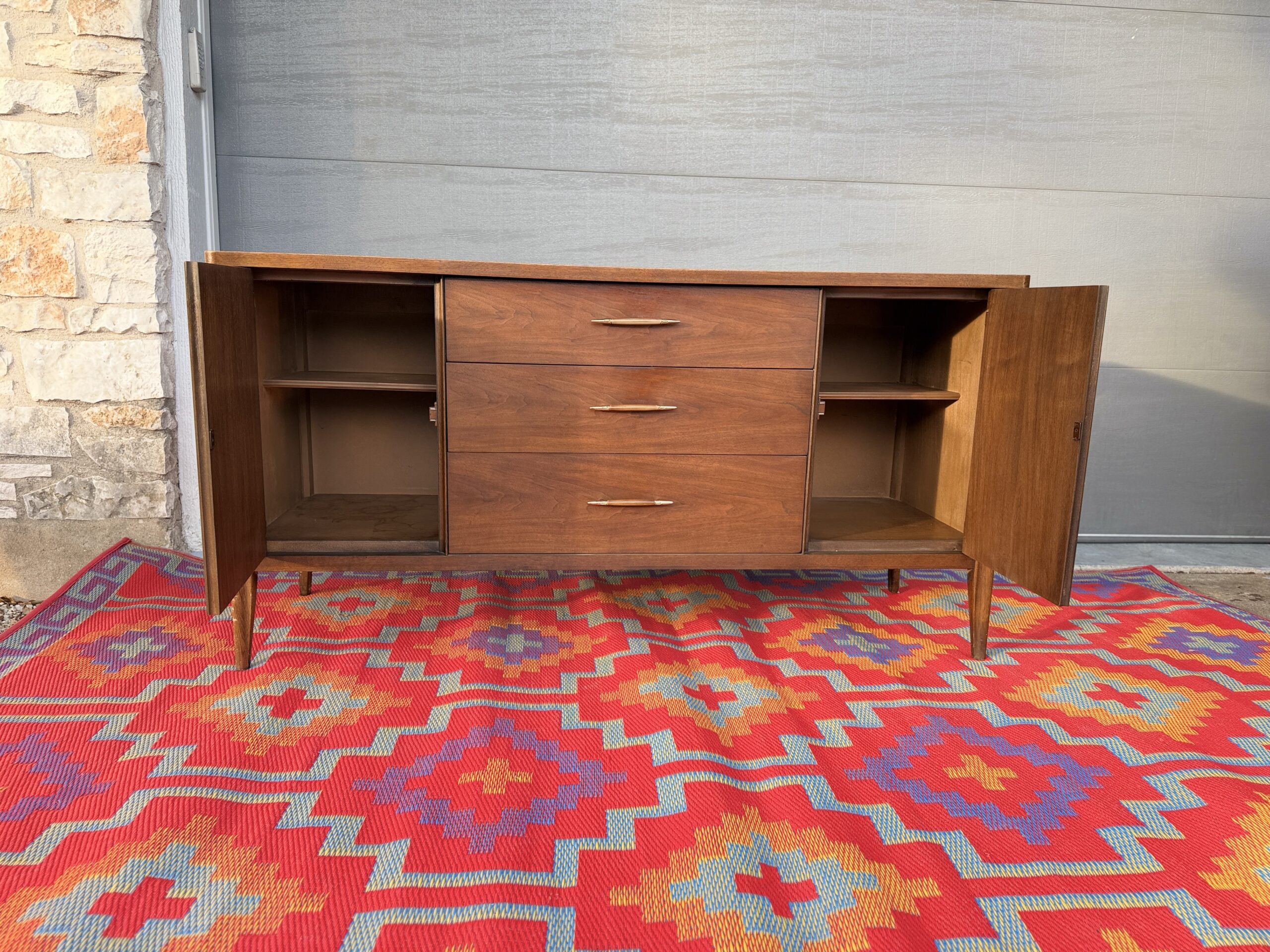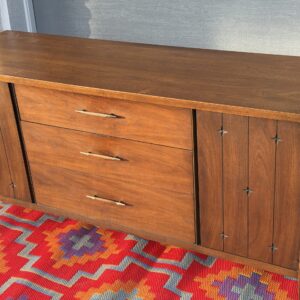A gorgeous piece from the iconic Broyhill Saga collection, featuring the signature star-carved doors and timeless mid-century silhouette. This credenza offers generous storage with two outer cabinets and smooth-gliding central drawers—perfect as a media console, dining room storage, or entryway statement piece.